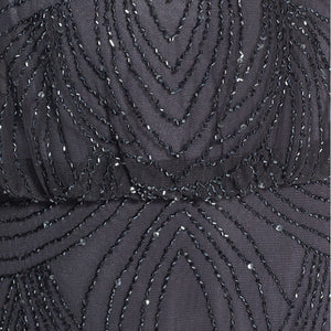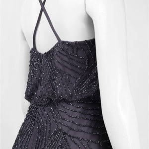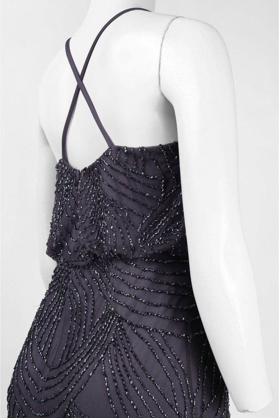 Glittering with beautifully patterned beads throughout, this flattering blouson gown features a crisscross back. Delicate straps crisscross the back of an elegant gown that catches the light with a swirling Art Deco pattern of delicate, shimmering beads. The blouson silhouette works well with all figure types.