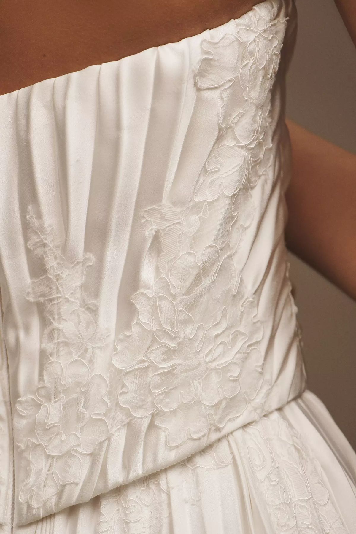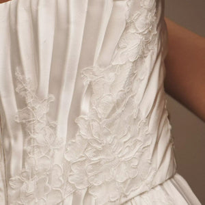 - Pleated Che charmeuse fabrication with lace detail