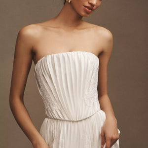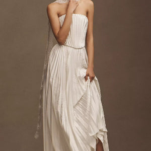 The Loen Wedding Gown is crafted from luxe charmeuse and features all-over pleats. Delicate cami straps with fluttered lace details complete the timeless illusion two-piece look.