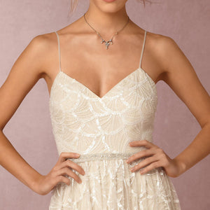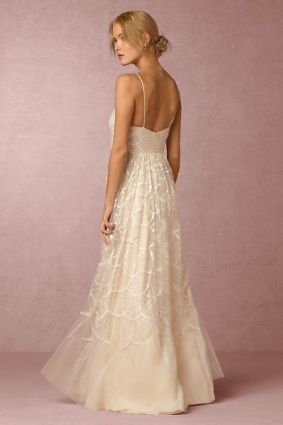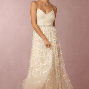 At once ethereal and refined, we can't resist a beaded scallop motif cascading over creme hued tulle. This gown is lovely both for indoor and outdoor ceremonies, and especially with delicate, glittering accessories.