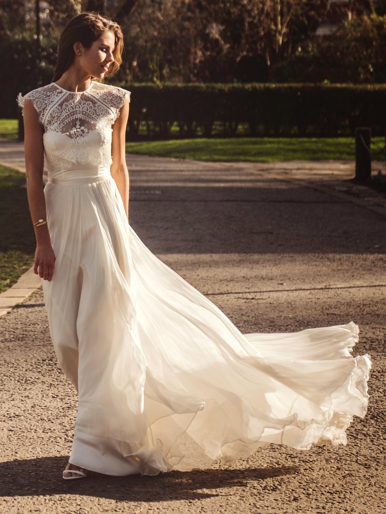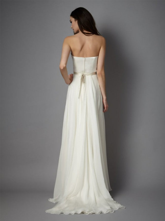 The romantic and dreamy draped silk chiffon Delia skirts naturally cascades from the fitted satin waist band to fall endlessly into a soft-pool train. Classic and timeless, let your heart run away with the most charming skirt of them all.