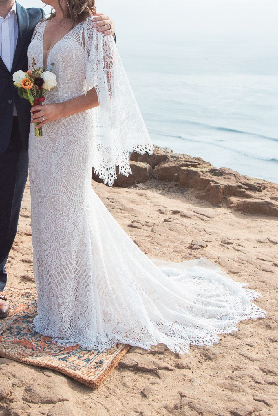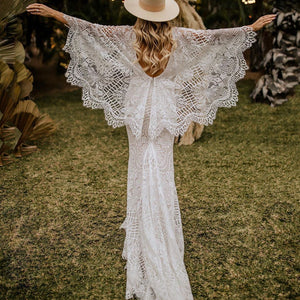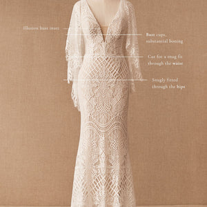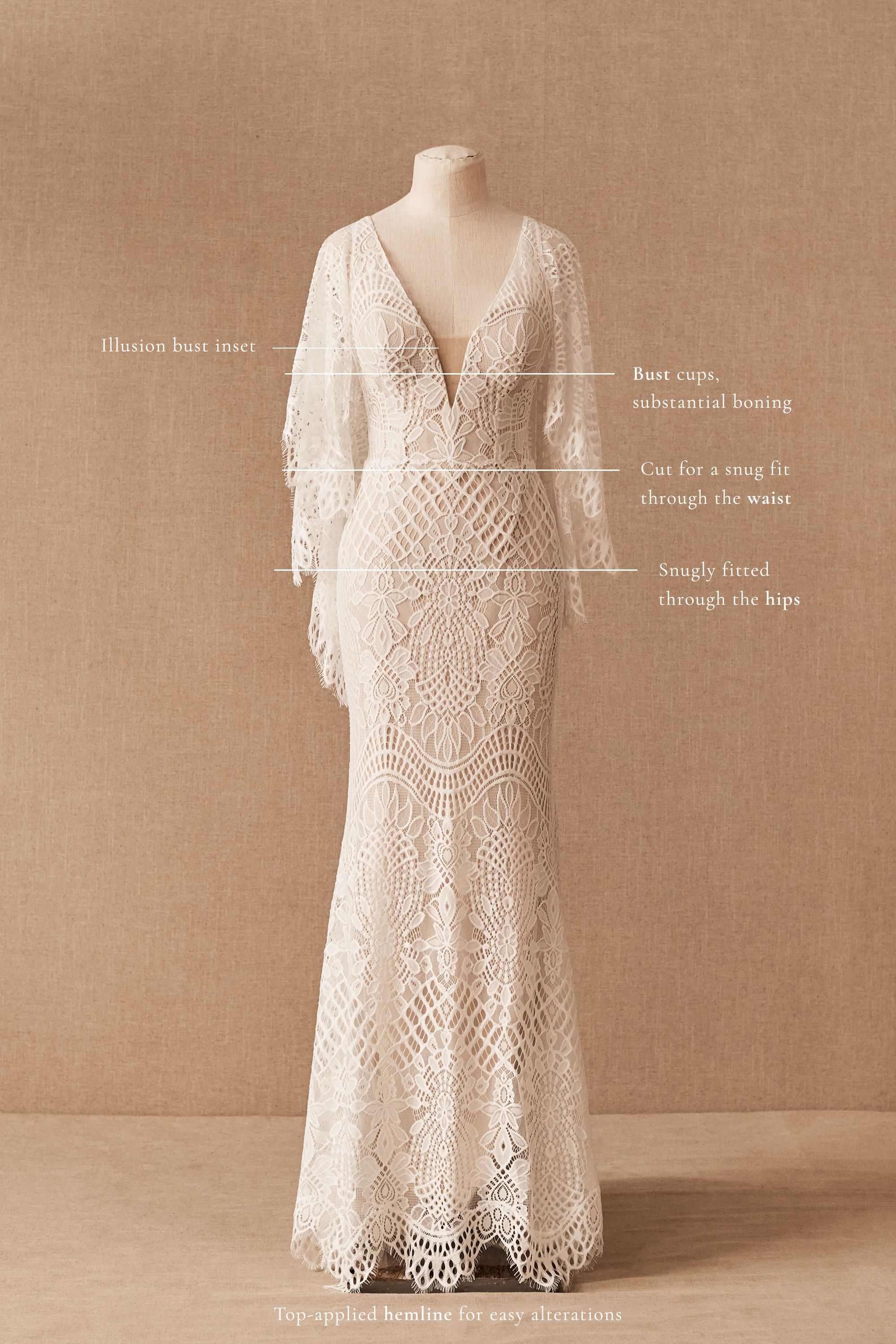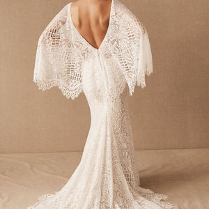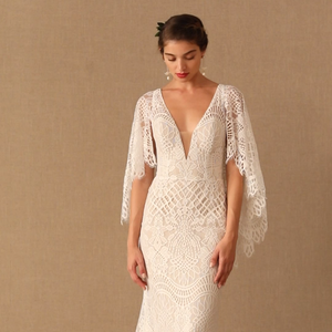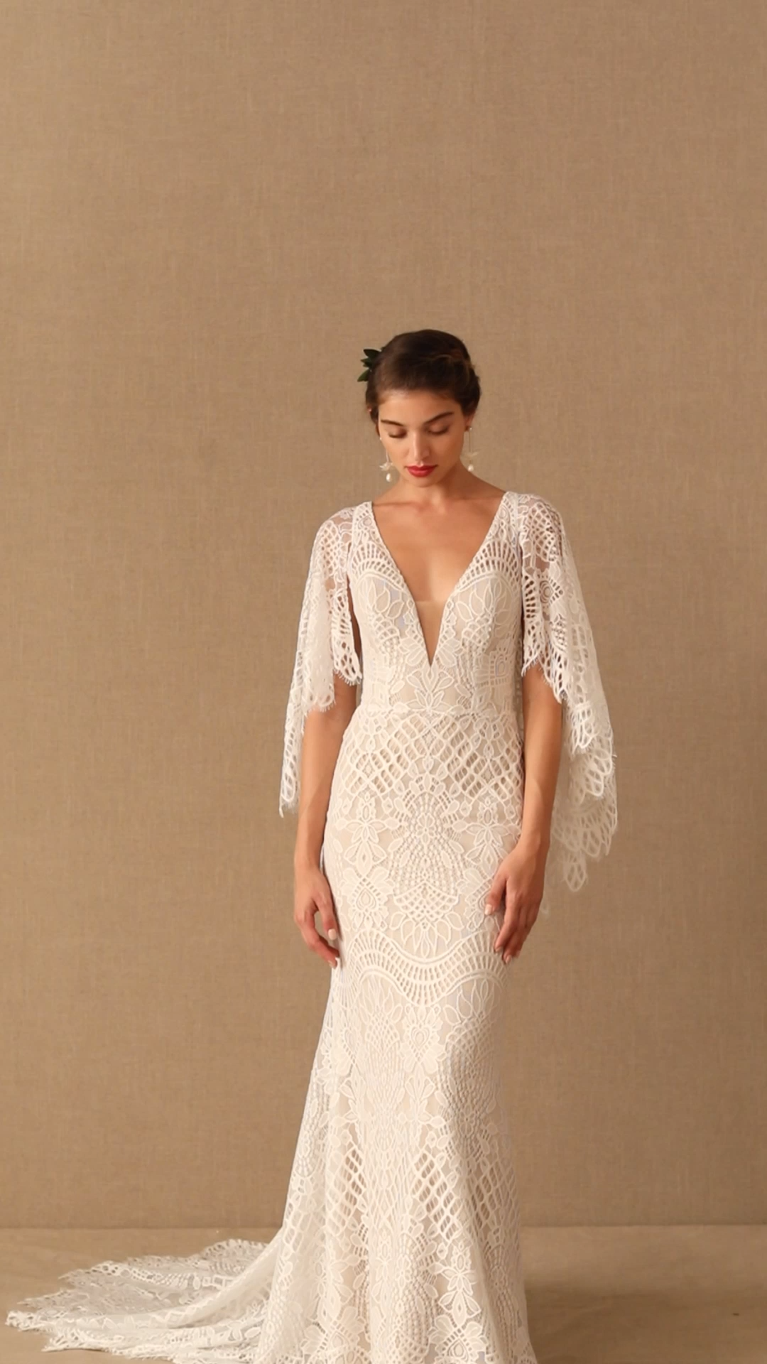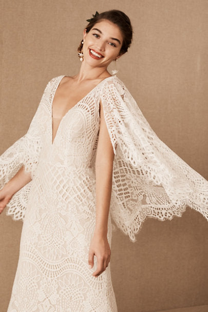 Made from intricate graphic lace, this fitted gown features a plunging v-neckline and dramatic train. The cascading flutter sleeves transform into a gorgeous cape detail to frame the open back. By BHLDN Whispers & Echoes.