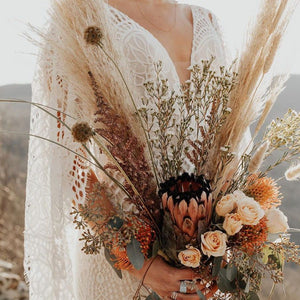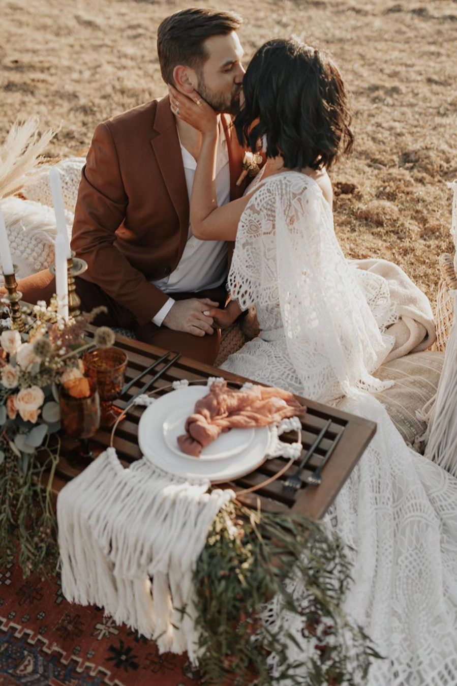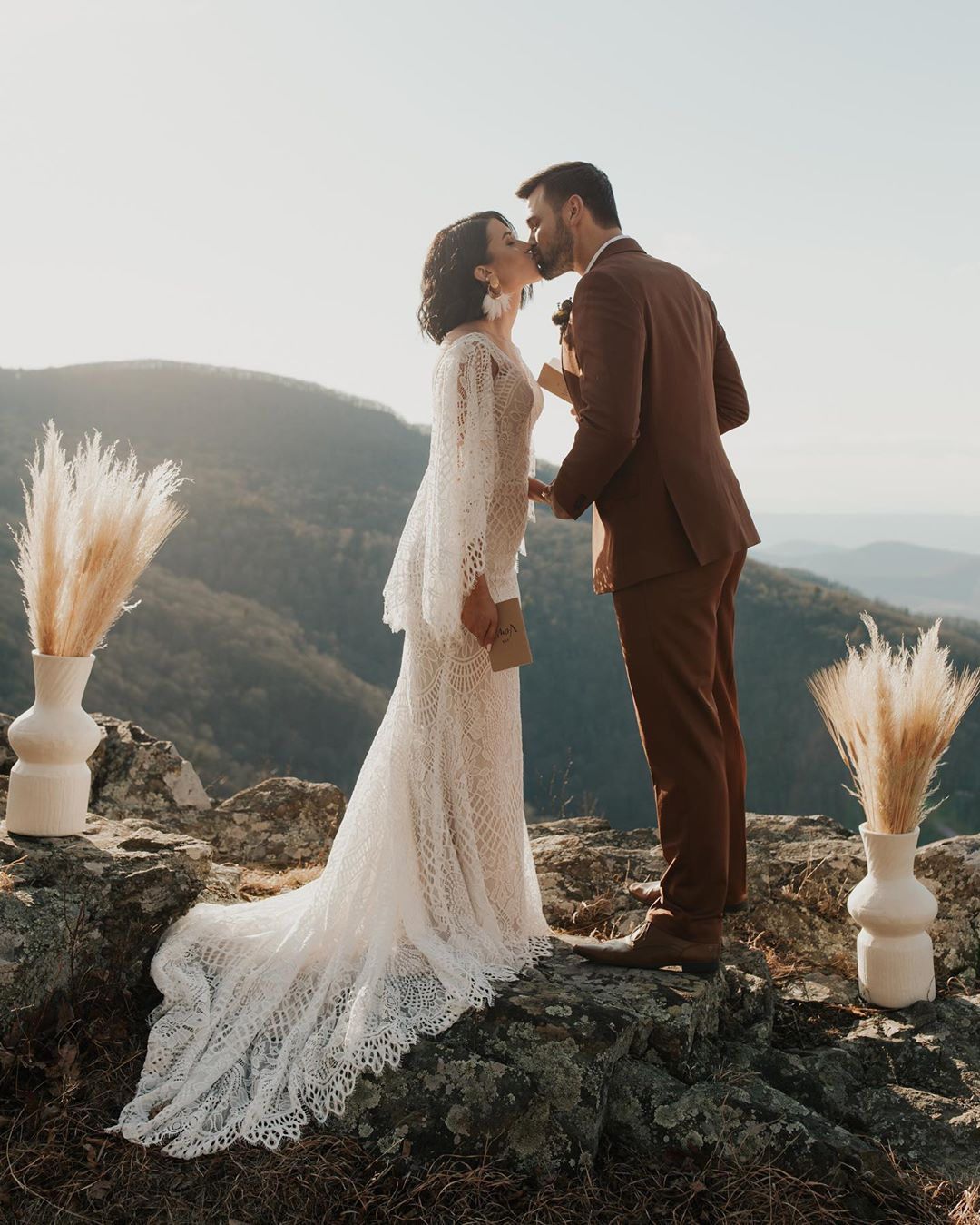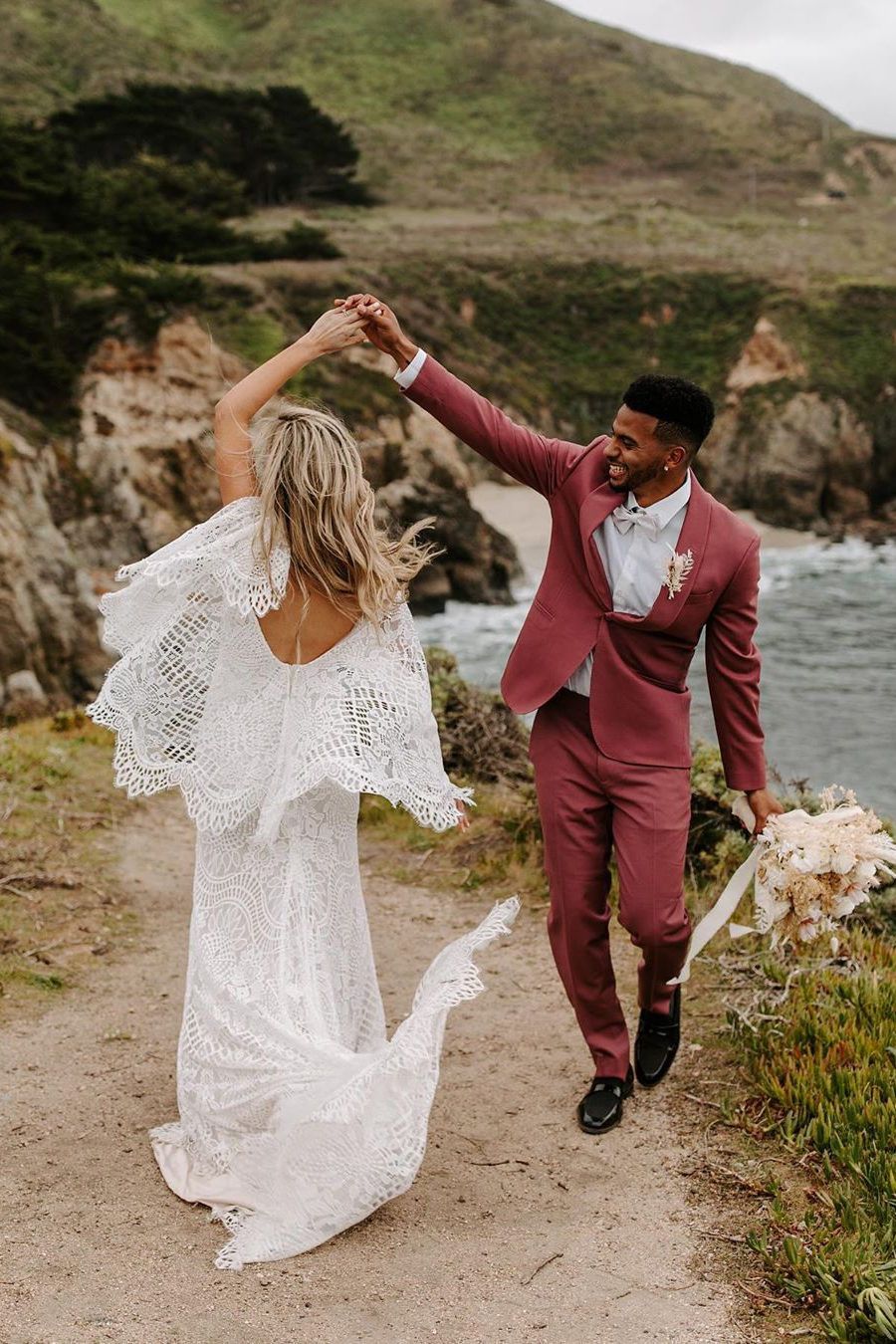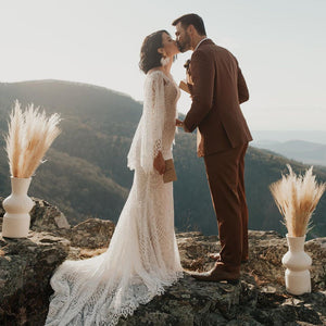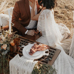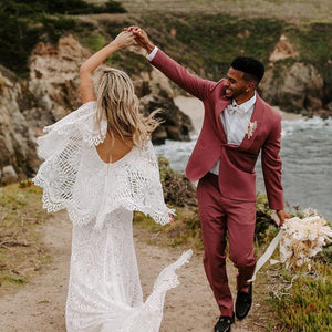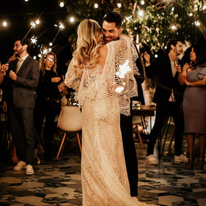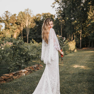 Made from intricate graphic lace, this fitted gown features a plunging v-neckline and dramatic train. The cascading flutter sleeves transform into a gorgeous cape detail to frame the open back. By BHLDN Whispers & Echoes.