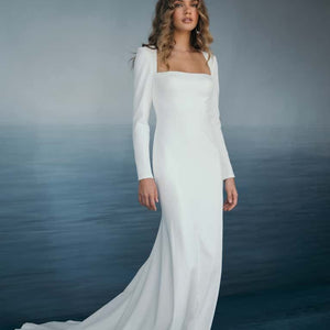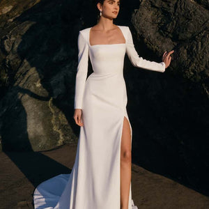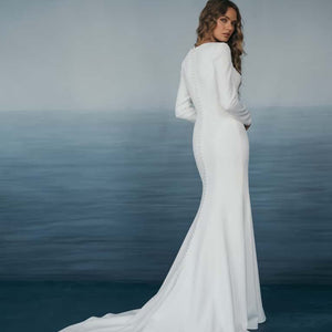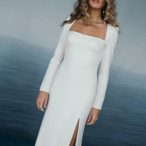 This elegant bridal gown cut in our Italian crepe fabric features long sleeves and an angled square neckline that beautifully frames the décolletage. The sleek fit-and-flare silhouette hugs the figure and the daring slit offers a peek of skin. Blending modern sophistication with timeless charm, she is perfect for the bride seeking a statement piece on her special day.