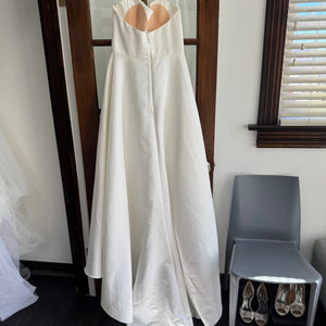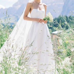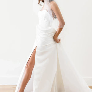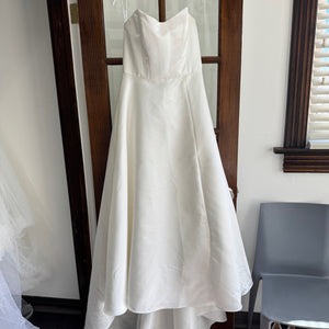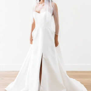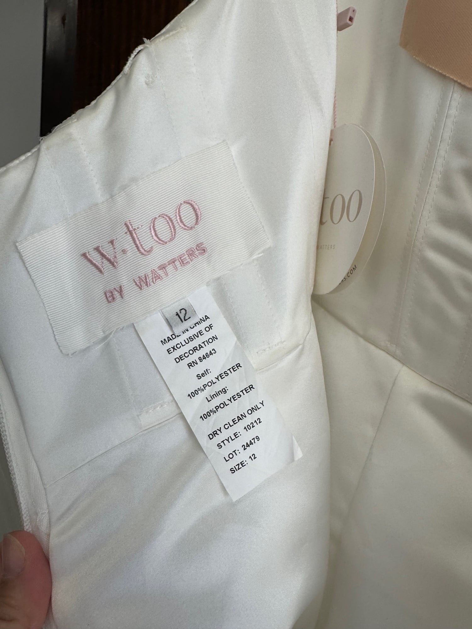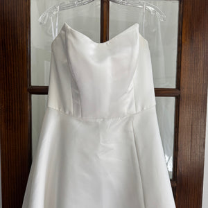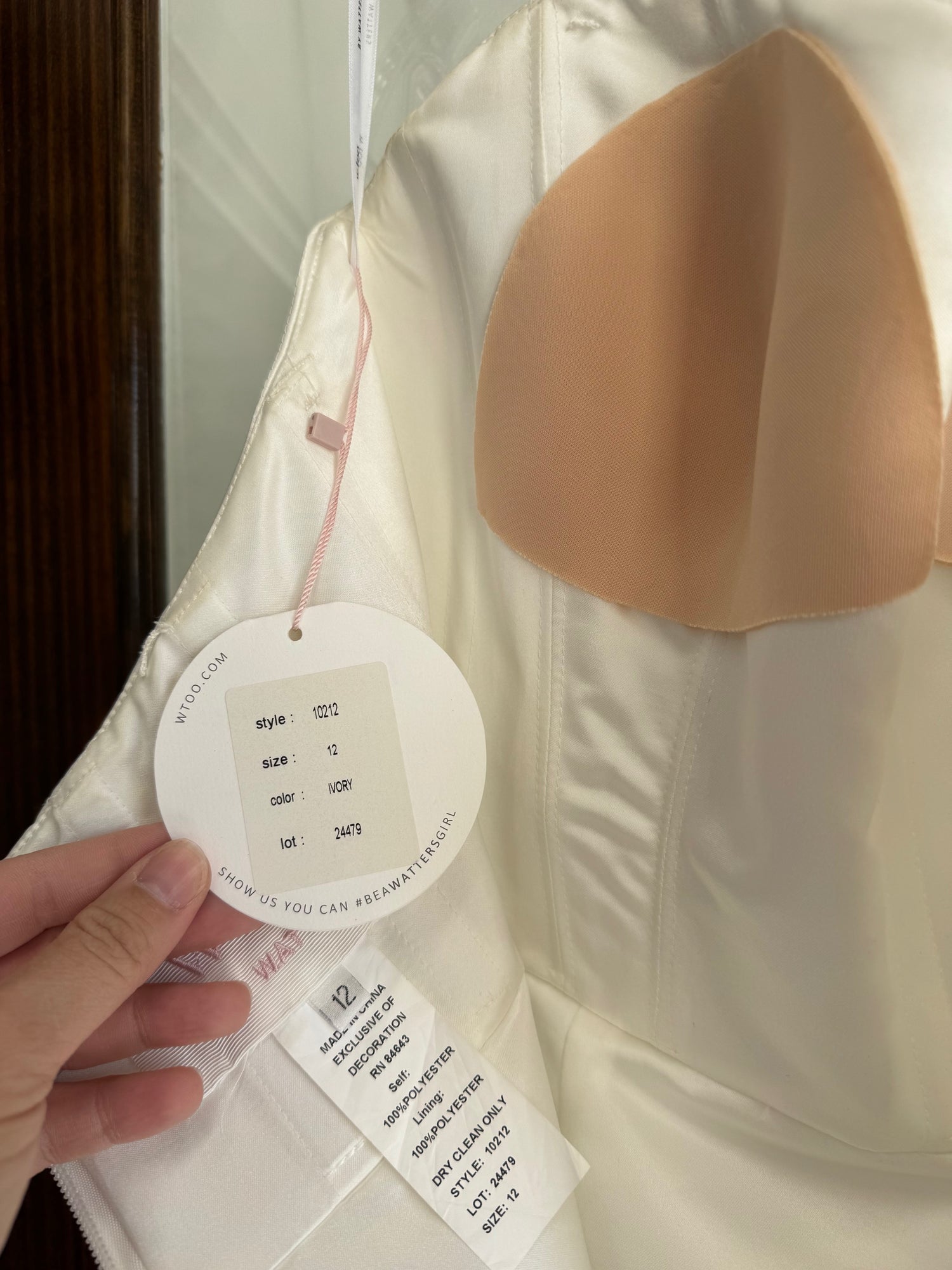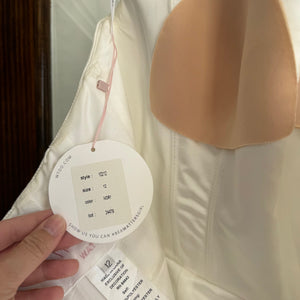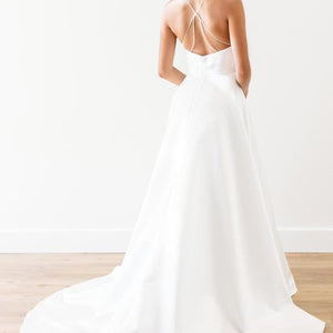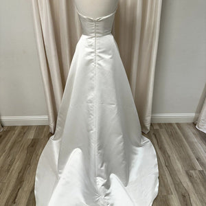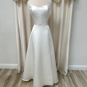 Wtoo 10212 Enola A-line bridal gown is fashioned in poly satin, with a semi-sweetheart neckline. A thigh-high front slit accents this simple wedding dress, finished with a chapel train. Removable straps are NOT included.