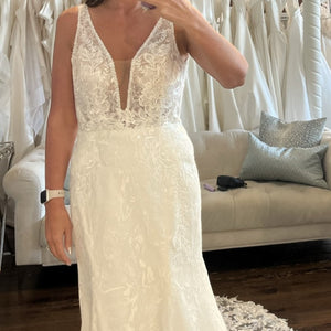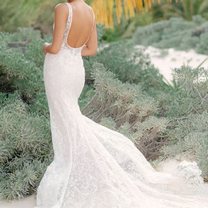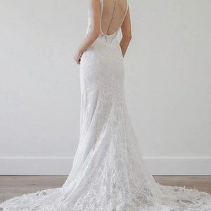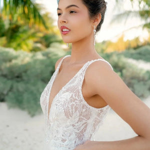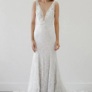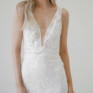 Lovely in lace, the Tamzin gown is perfect for a classic bridal look. The plunging neckline finished with our new row trim adds the perfect touch to this all-over lace gown. Color: Ivory.