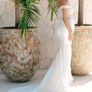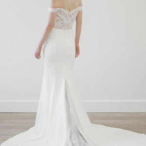 Graphic and modern Willow leaf lace dances off-the-shoulder in this romantic gown. The Olero gown pairs dreamy lace with a clean and classic skirt and is tied together with a peekaboo godet of lace. Style #11823.