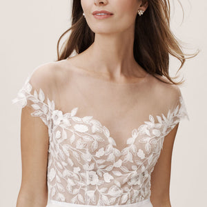 Thoughtful design details allow this romantic ballgown to combine a dramatic silhouette with an exceptionally comfortable fit. Sheer illusion mesh adds invisible support to an off-the-shoulder neckline, while airy organza makes the skirt full yet lightweight. Ivory embroidery and applique over a buff lining bring luxe texture to the bodice. By Jenny Yoo.