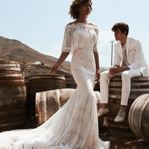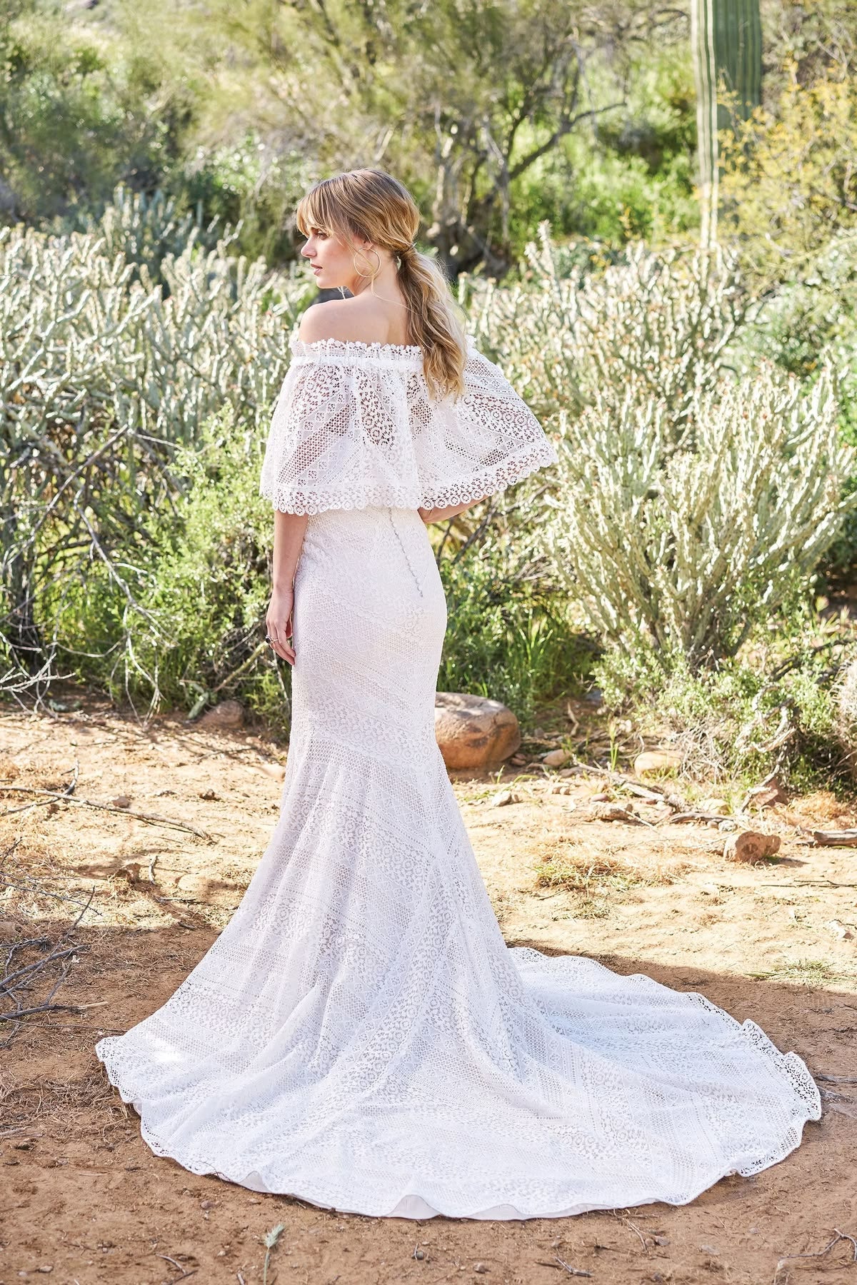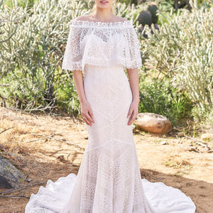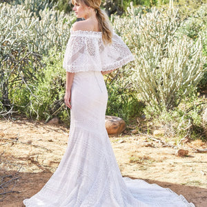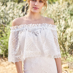 Crocheted geometric fit and flare with an endlessly romantic feeling. Accented with a detachable stretch off the shoulder cape. The stretch Jersey lining feels mystical and light.
