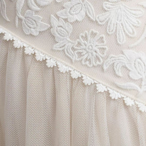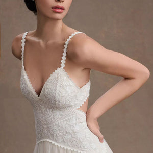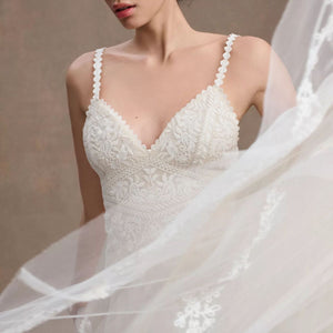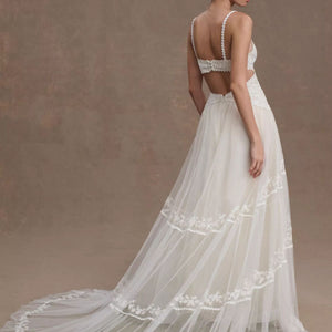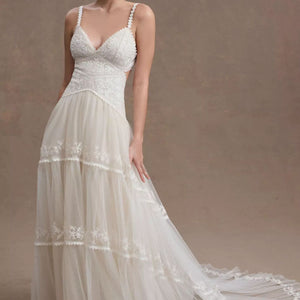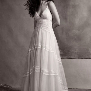 A tulle body and delicate embroidered detailing offer a timeless touch to this flirty-modern style that takes you from the aisle to the dance floor. The v-neckline and open cutout back offer a touch of allure, while the tiered lace skirt that extends into a chapel-length train adds romantic drama.