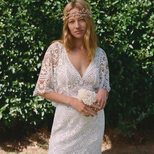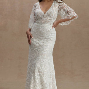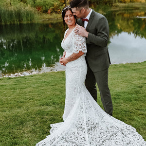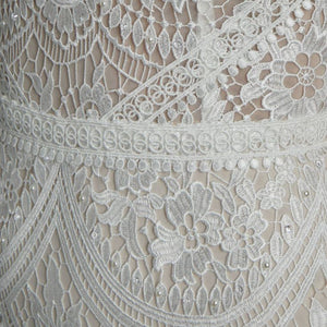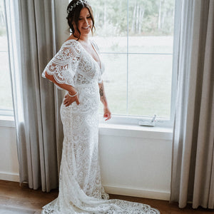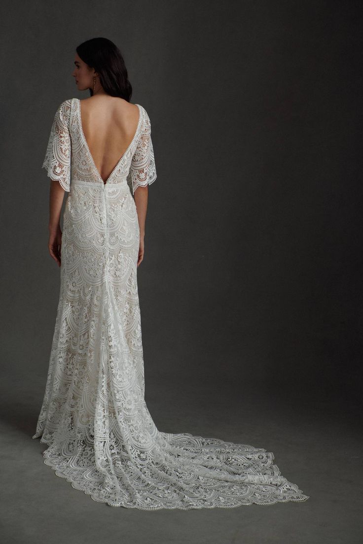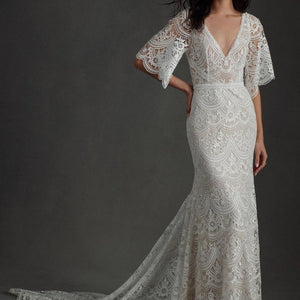The Rish Haleh wedding gown offers allover delicate floral lace and intricate beadwork on a flirty, fit-and-flare silhouette. Flutter sleeves and a v-neckline add dimensional texture while an open v-back design and sweeping chapel train lend effortless sophistication.