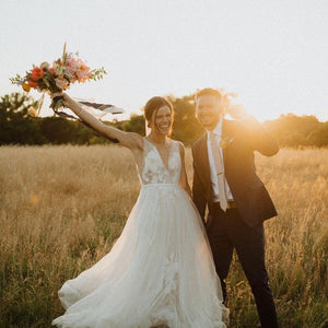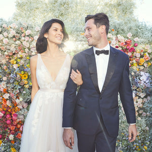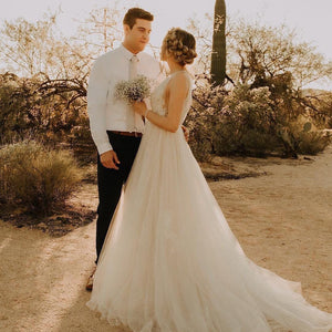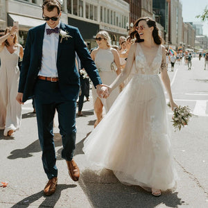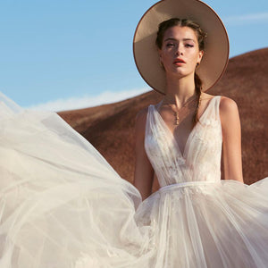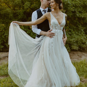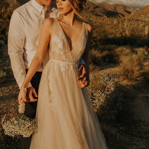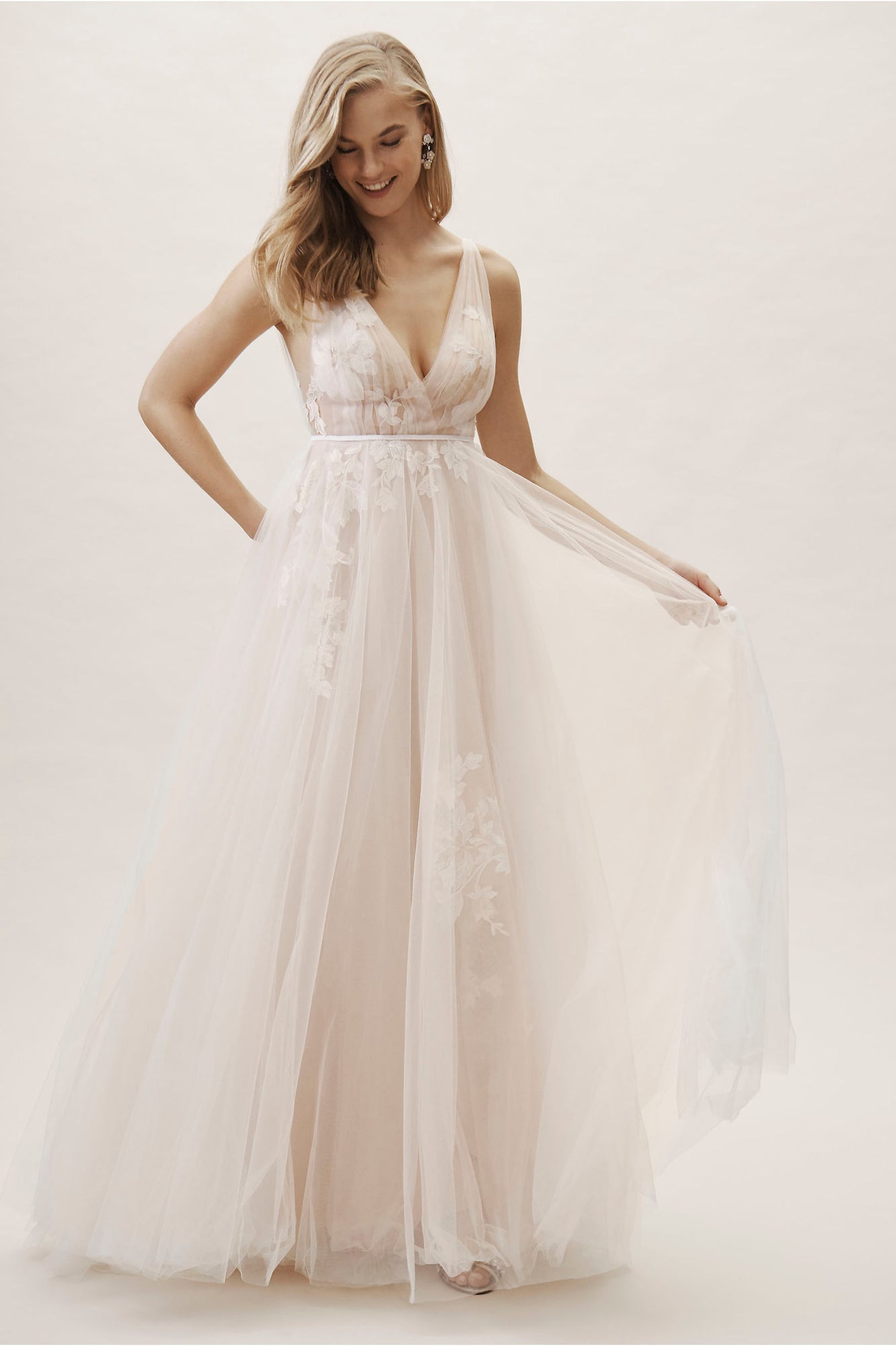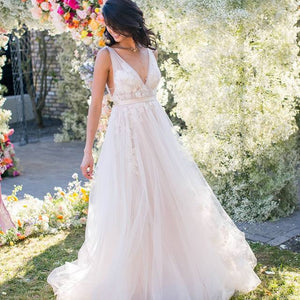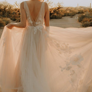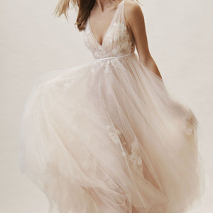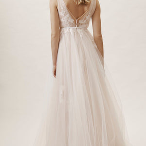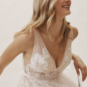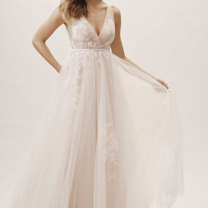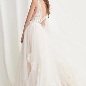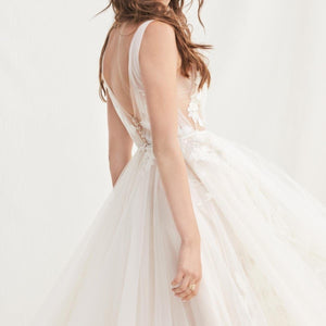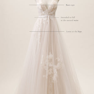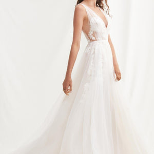 Willowby by Watters Lainie Gown is an ethereal A-line gown of illusion tulle over Wildfeld lace. Lace appliques peek through layers of soft tulle. The bodice is complete with a plunging neckline and low back for a sultry edge.