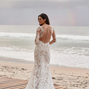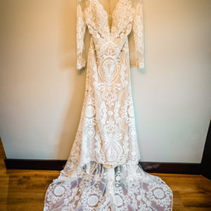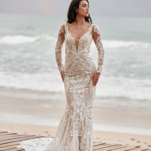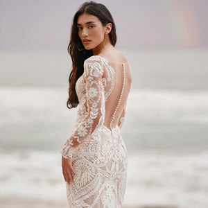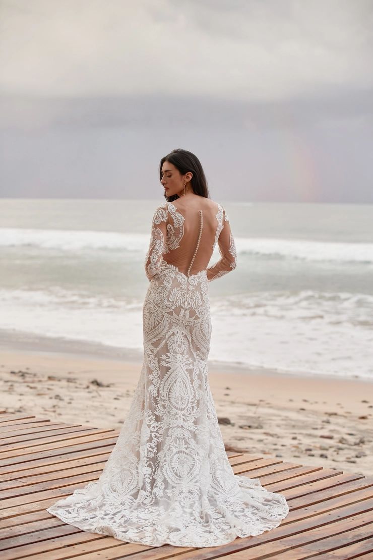 Embrace timeless elegance with the Andora Gown by Willowby by Watters. This exquisite sheath dress features a romantic V-neckline and delicate sheer lace long sleeves, adding a touch of sophistication to its modern design. The gown is adorned with intricate 'Strawberry Fields' embroidery, creating a captivating visual effect. A sheer lace back with covered buttons completes the look, offering a graceful and refined aesthetic.