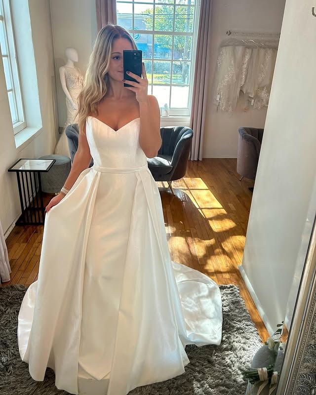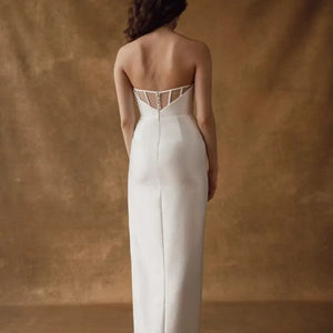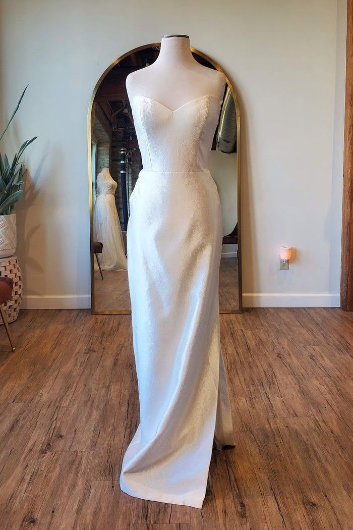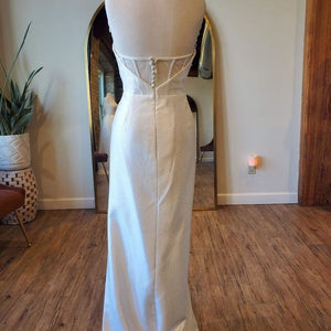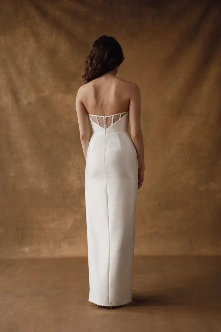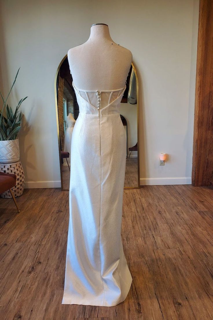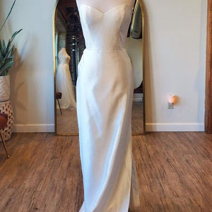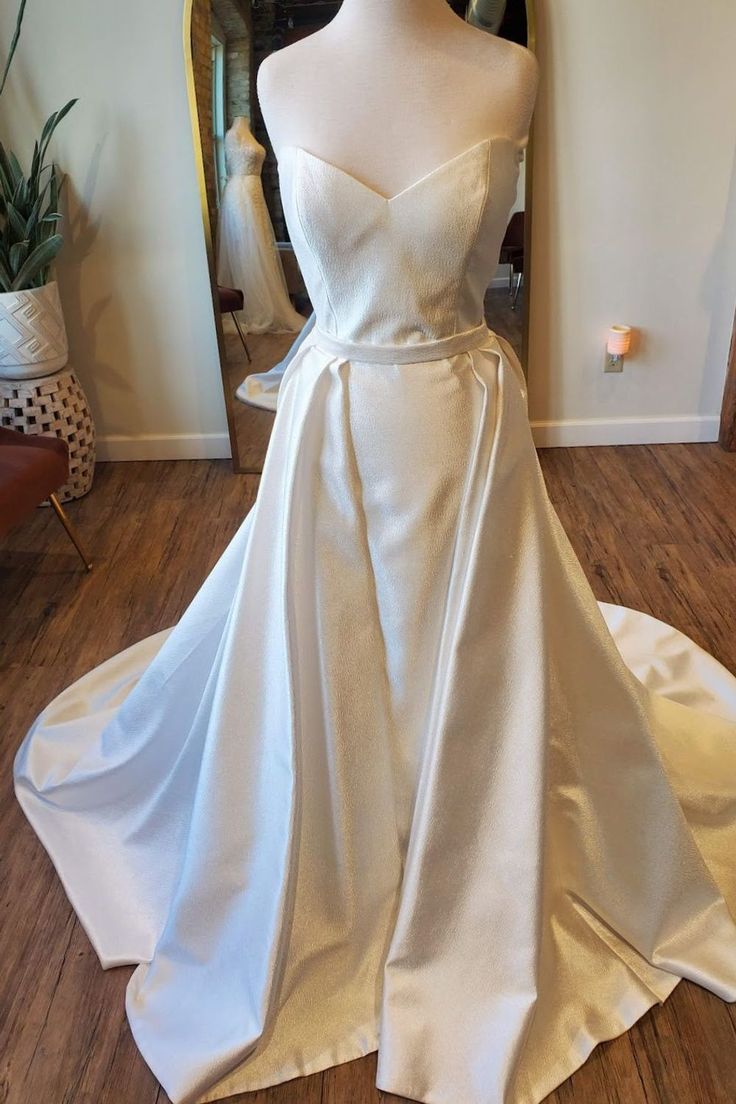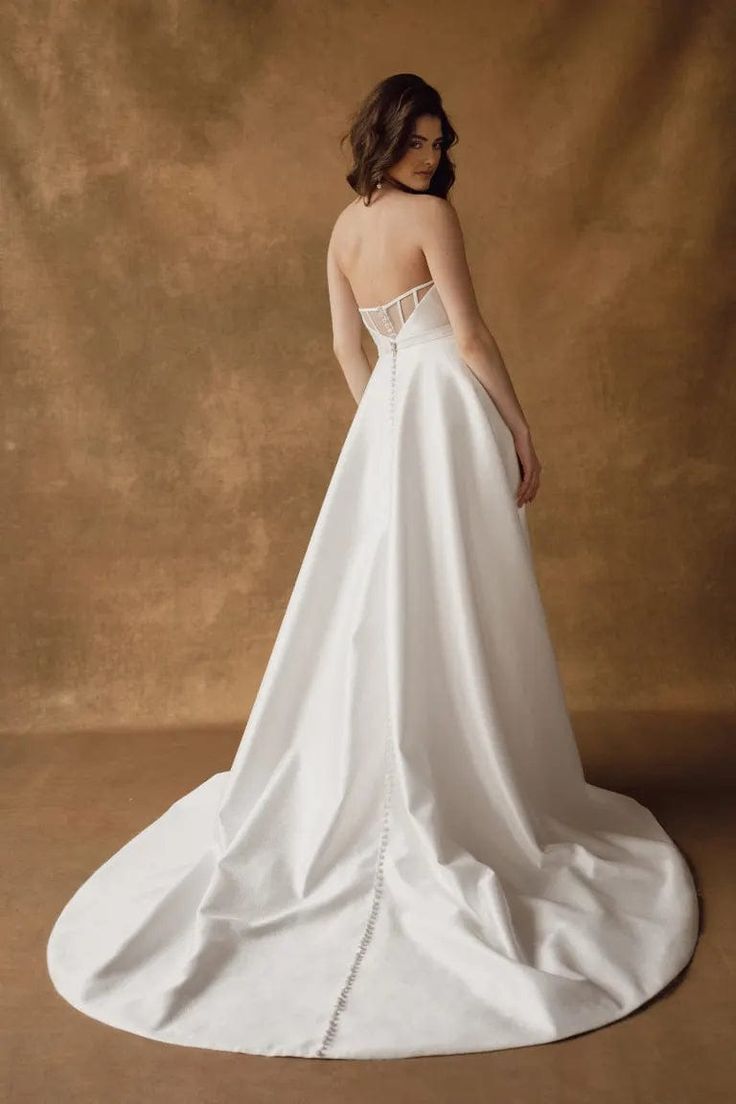 The Dovima gown is a true chameleon. Featuring a strapless sweetheart bodice with sheer illusion back corset detail. The pleated overskirt creates a dramatic ball gown silhouette, and can be removed to reveal a reception dress with a vintage inspired slim pegged skirt with a daring side slit.