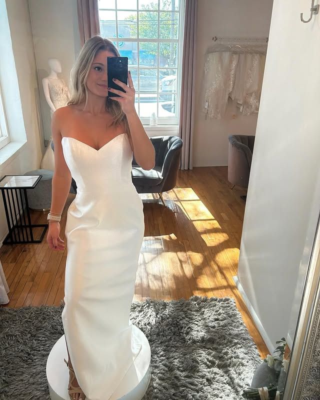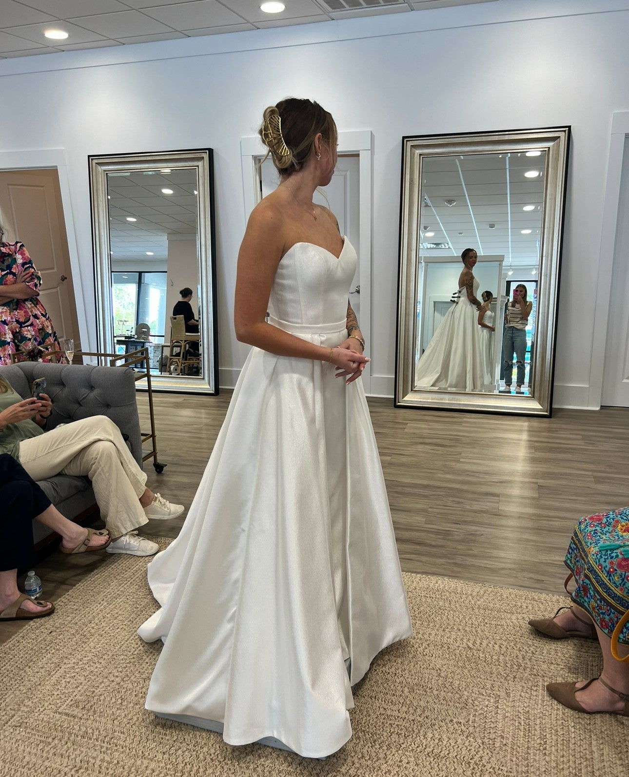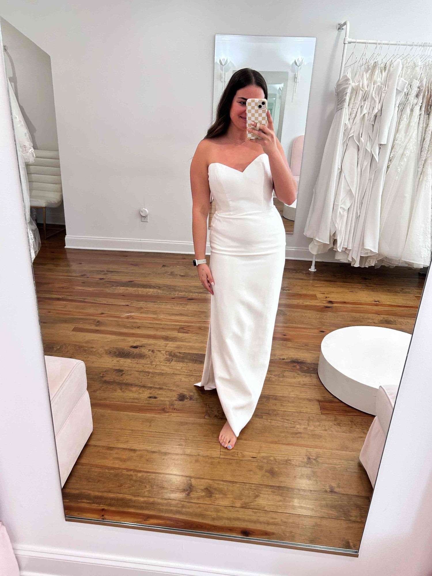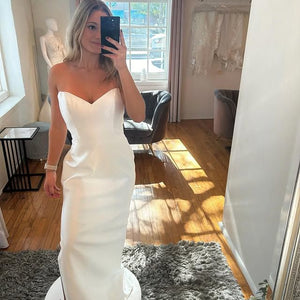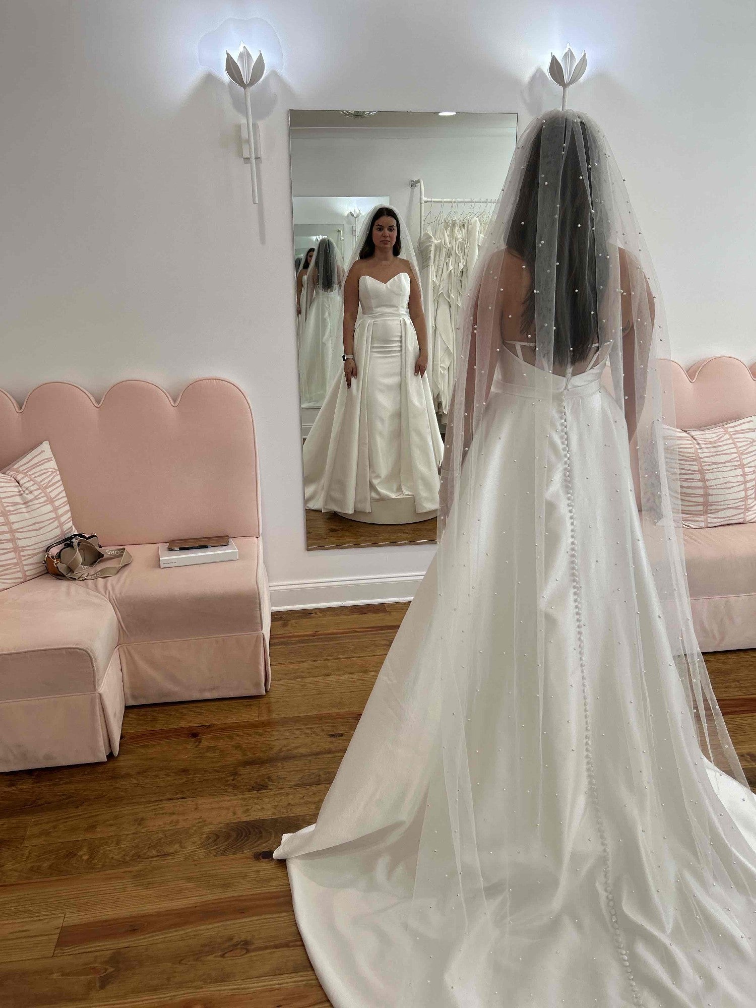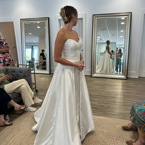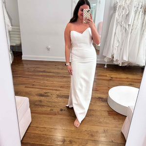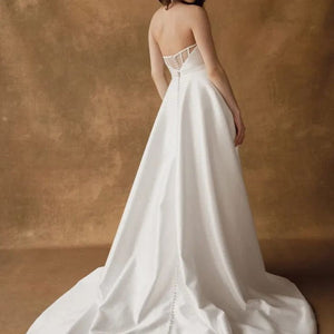 The Dovima gown is a true chameleon. Featuring a strapless sweetheart bodice with sheer illusion back corset detail. The pleated overskirt creates a dramatic ball gown silhouette, and can be removed to reveal a reception dress with a vintage inspired slim pegged skirt with a daring side slit.