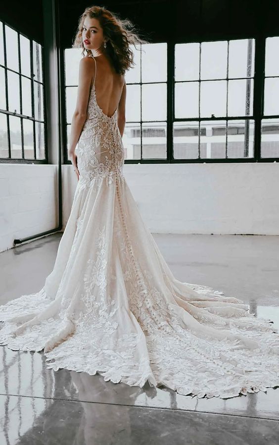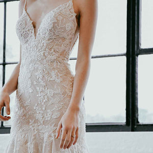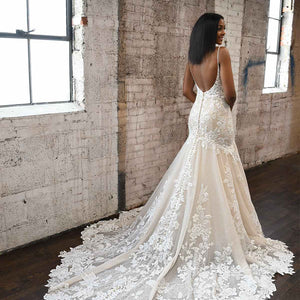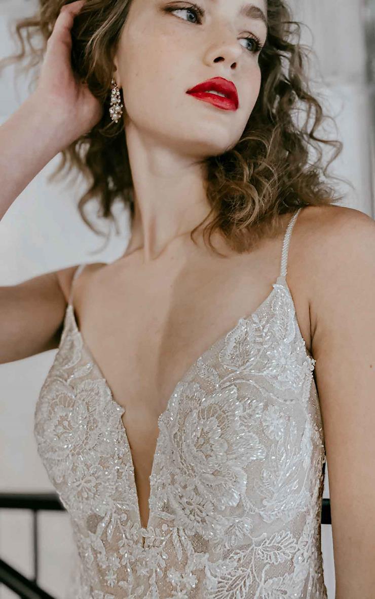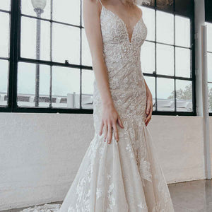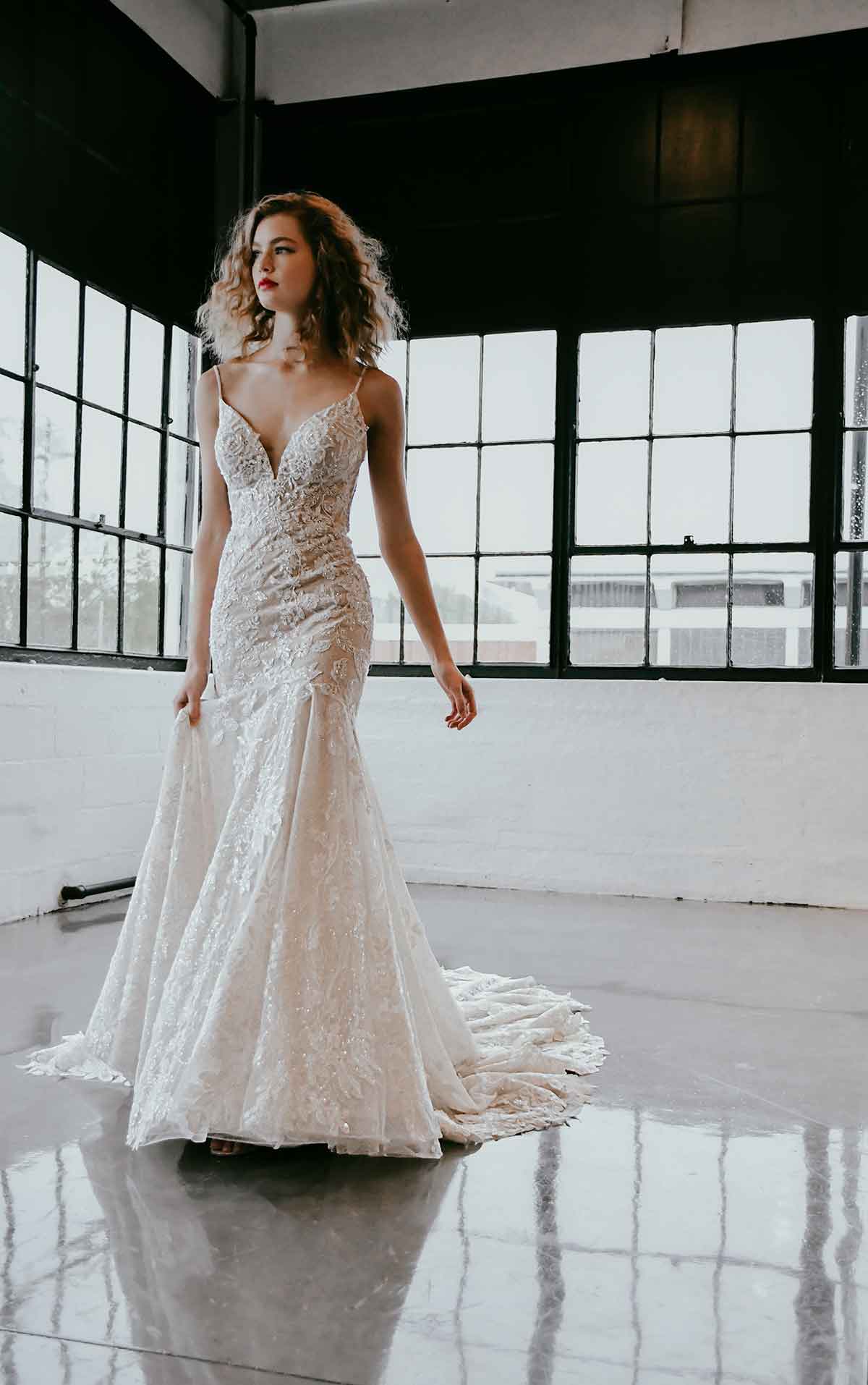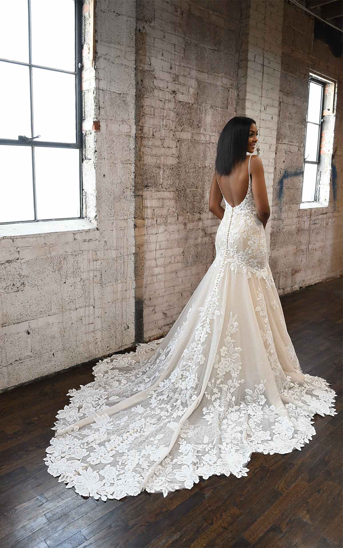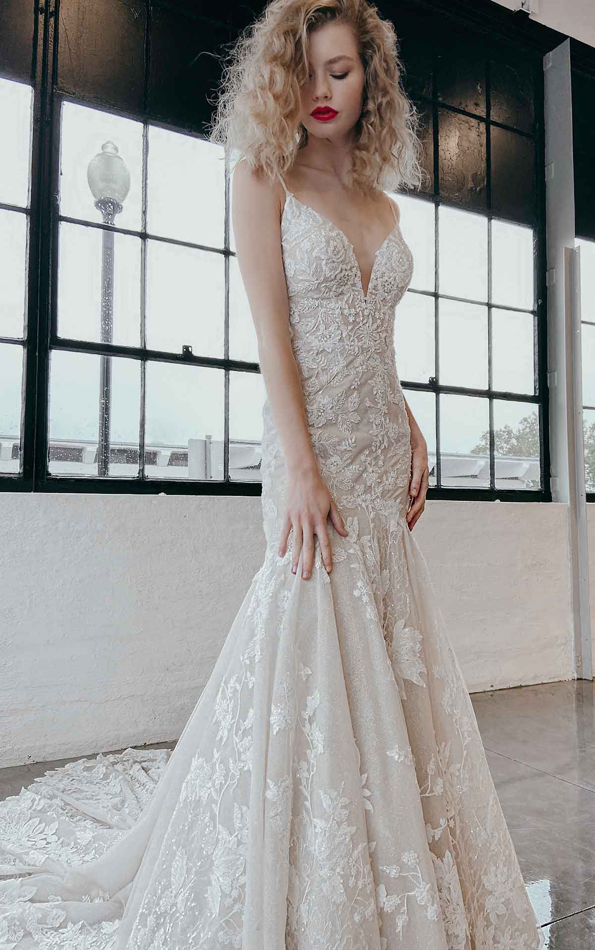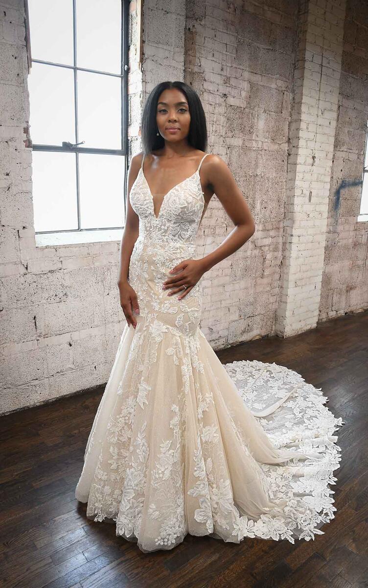 Dare to show your sparkly side in this sexy stunner from Martina Liana! Style 1301 is a stylish fit-and-flare silhouette with endless possibilities. The nude-colored lining over the silhouette creates a subtle yet daring sense of sheerness throughout, adding a negative space effect that is ultra-modern and fashion-forward. The rich, encrusted beading along the neckline and bodice take this look from sultry to showstopping, while an optional layer of luxe sparkle tulle radiates a gorgeous sheen that glistens with every turn. The plunging V-neckline and thin straps highlight the upper body beautifully, while the plunge is masked with illusion tulle for coverage and support. The open back and minimal strap detail perfects this modern design with a fresh and light feel, while the decadently detailed organic train features a myriad of botanical finishes for a head-turning look at every angle.