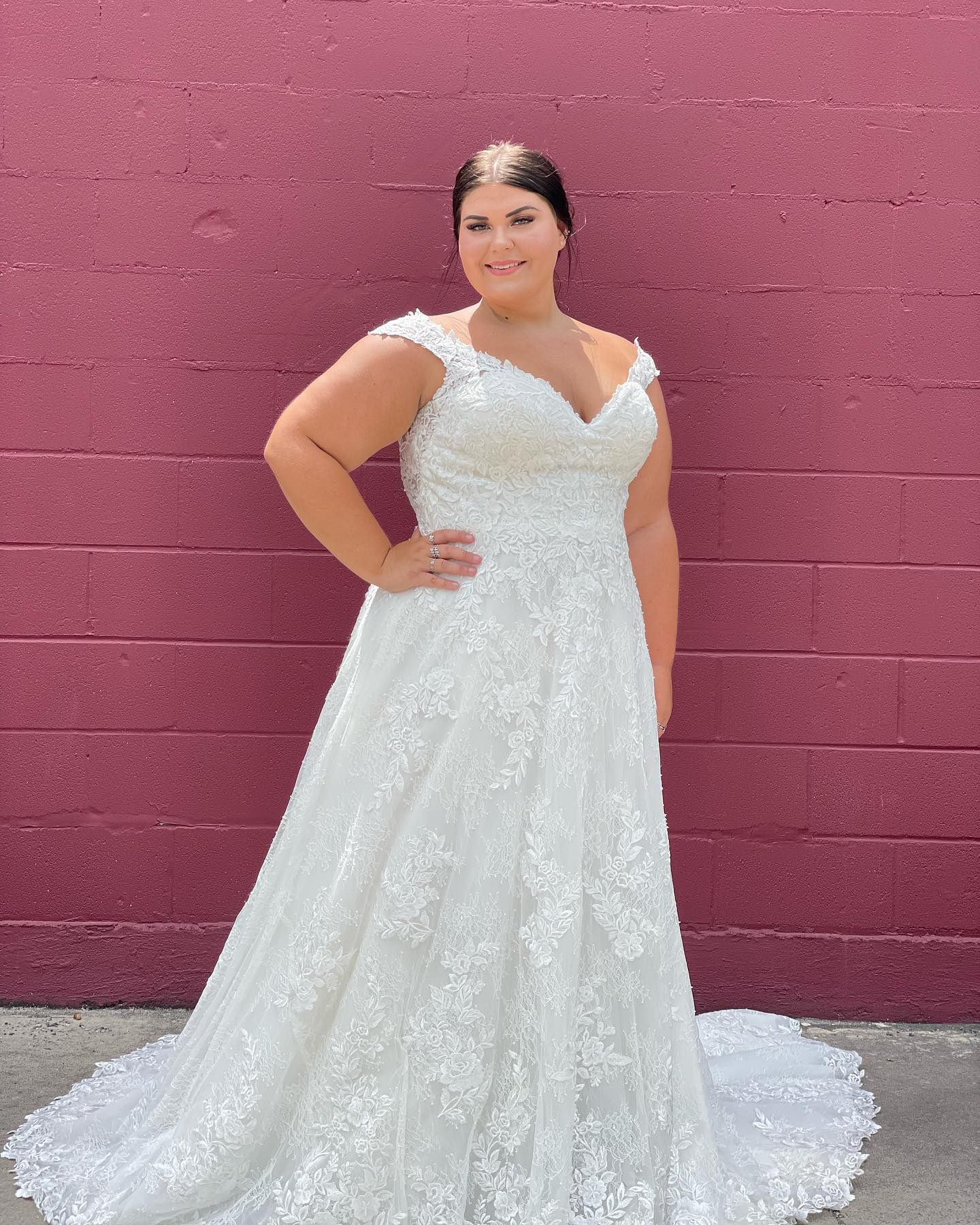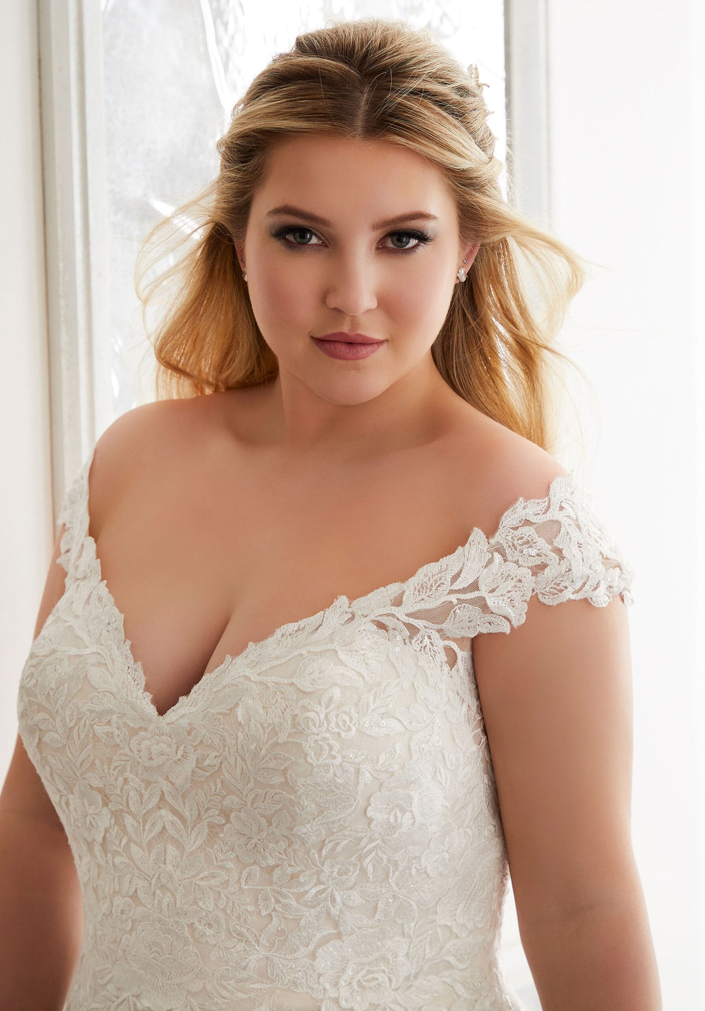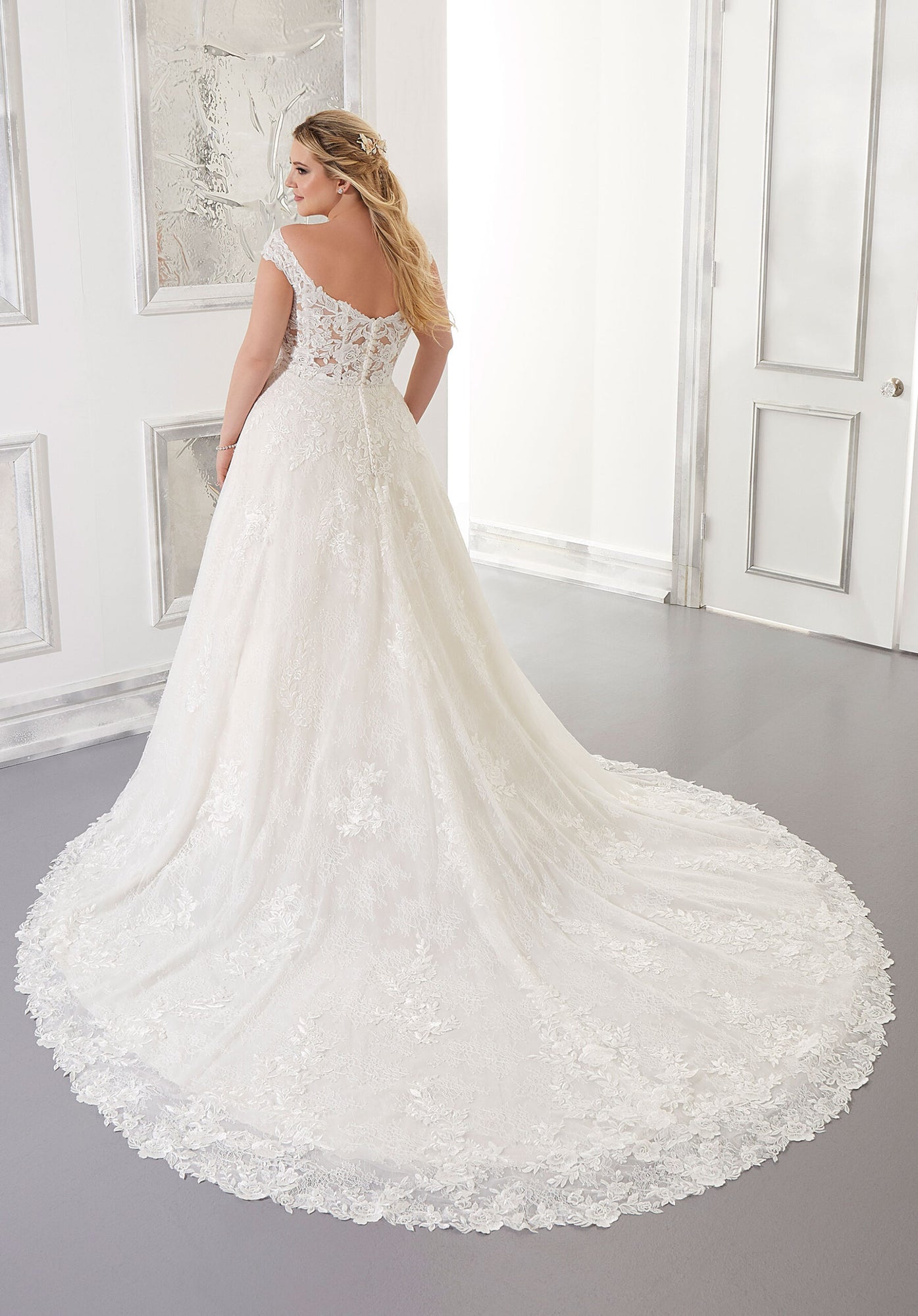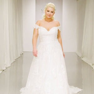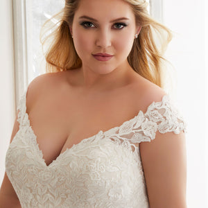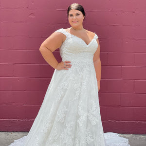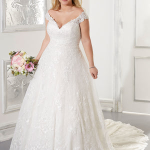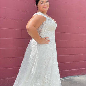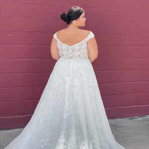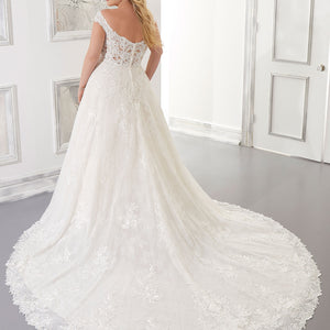 The Audrina wedding dress is a classic, Chantilly Lace A-Line gown accented in frosted, embroidered Lace appliqués. A beautiful semi-sheer back trimmed in covered buttons and wide scalloped hemline complete the romantic look.