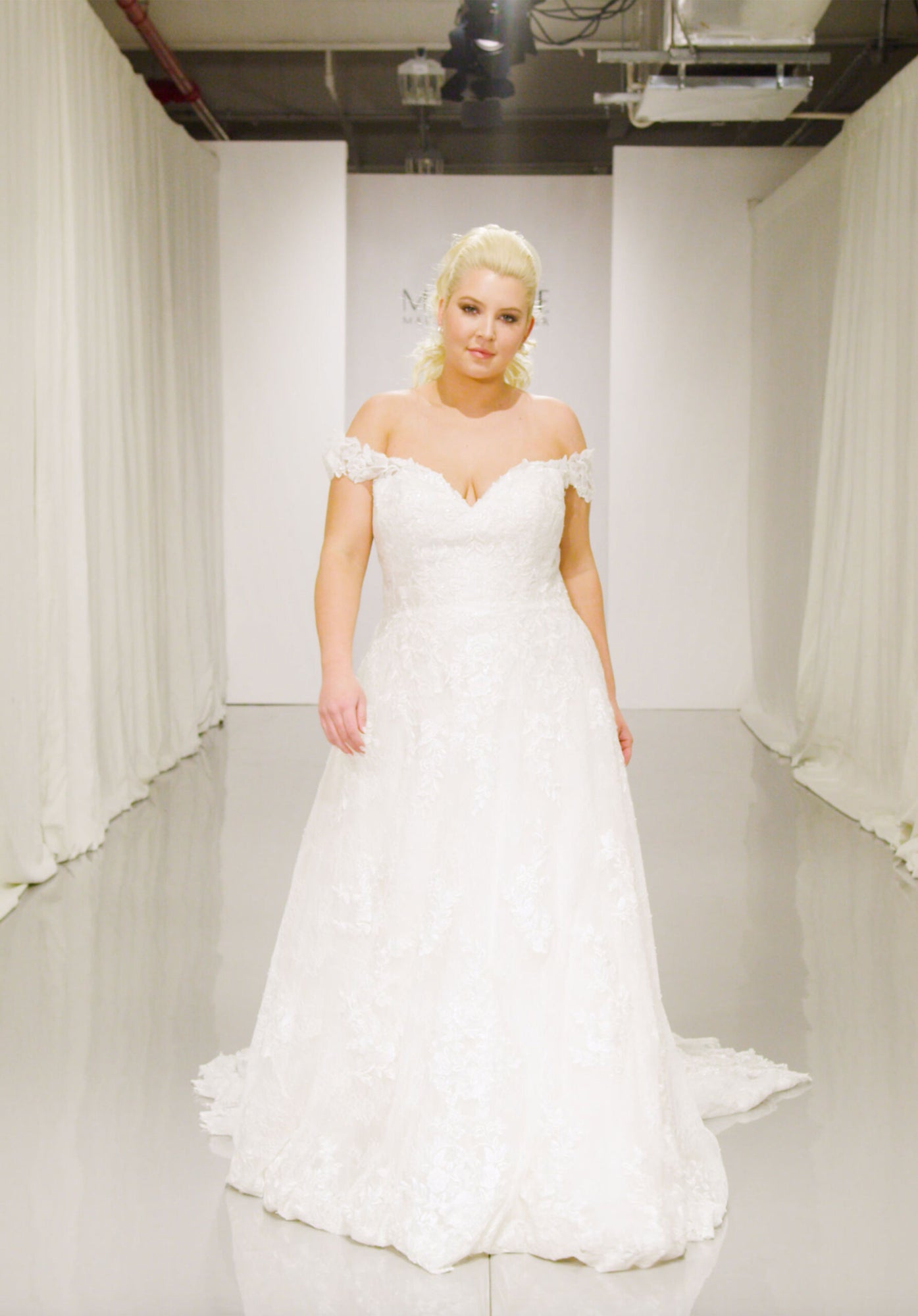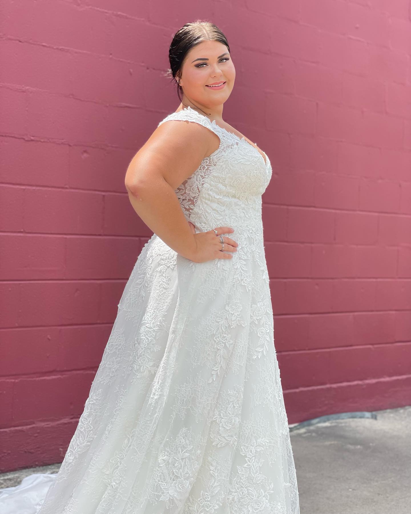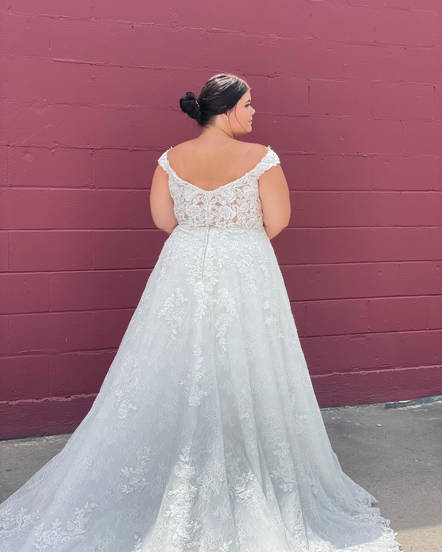 The Audrina wedding dress is a classic, Chantilly Lace A-Line gown accented in frosted, embroidered Lace appliqués. A beautiful semi-sheer back trimmed in covered buttons and wide scalloped hemline complete the romantic look.