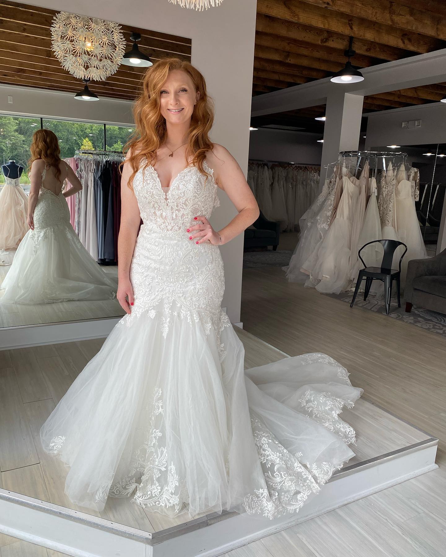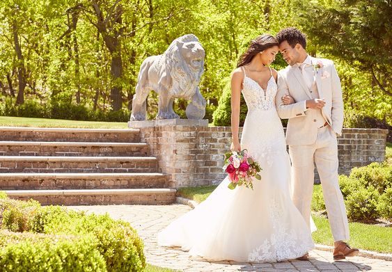 Magic in a dress, the Chantal designer wedding gown is a true mermaid with romantic flair. The sweetheart, v-neck bodice is covered in intricate frosted medallion, lace appliqués, and hugs each and every curve. We didn’t forget the sparkle with crystal beaded straps and tulle over sequined Chantilly lace bodice. A racy, low back adds a sultry touch and a romantic sheer train, edged in lace completes the look. Color: Ivory/Champagne/Honey.