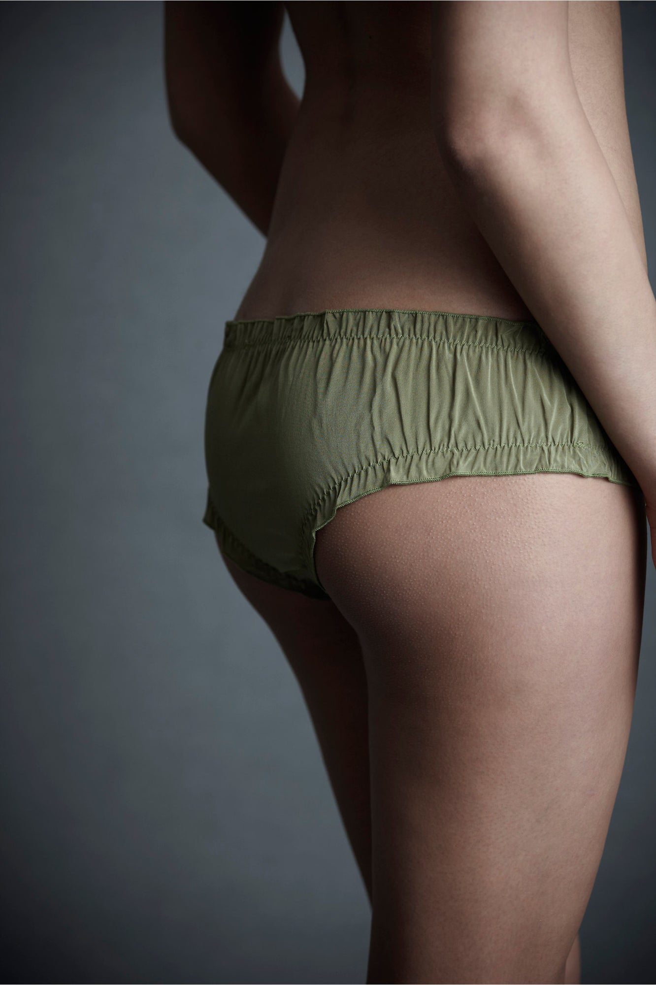 Ruched and mossy-hued satin silk, tied together with a flushed bow.