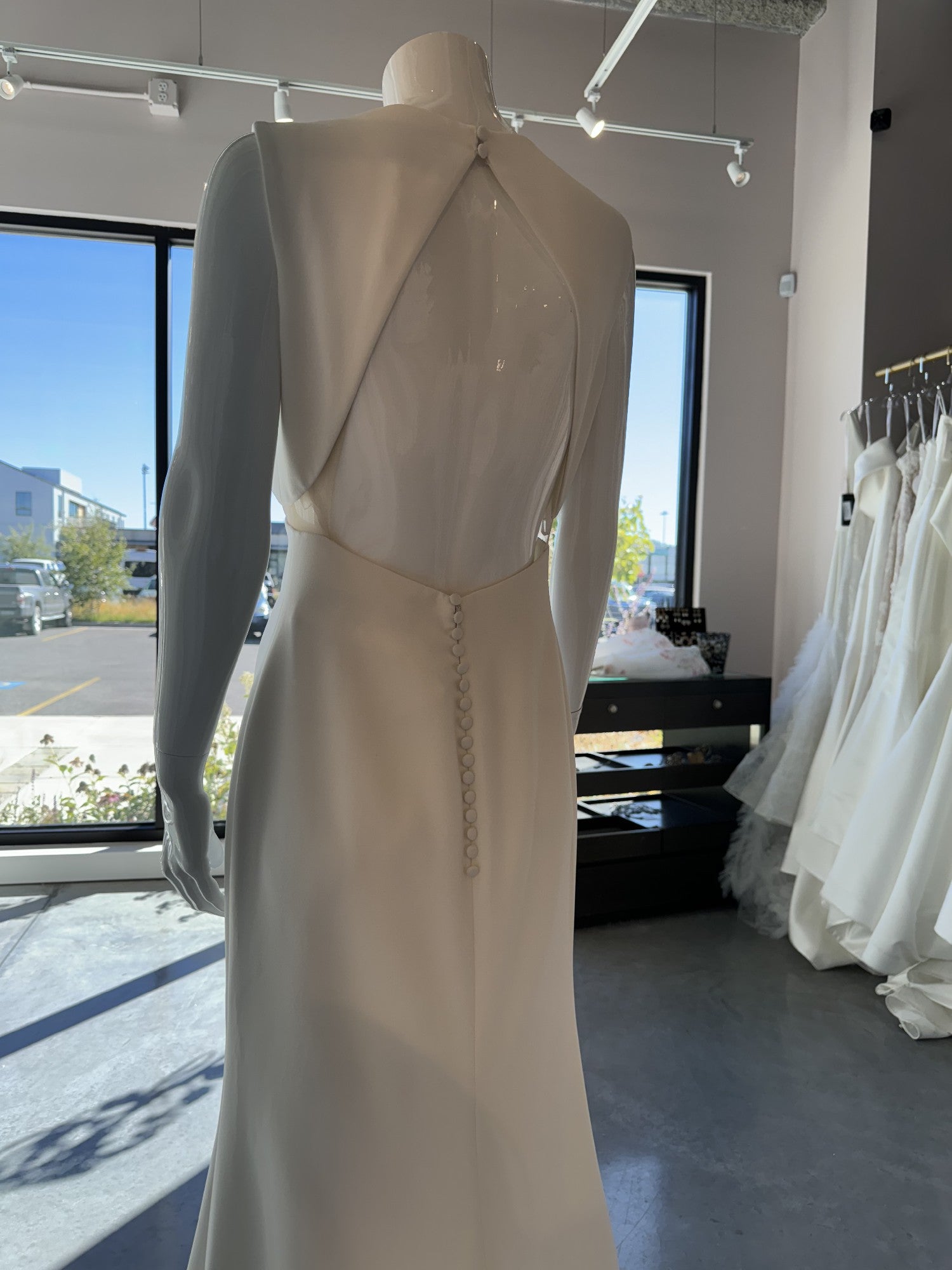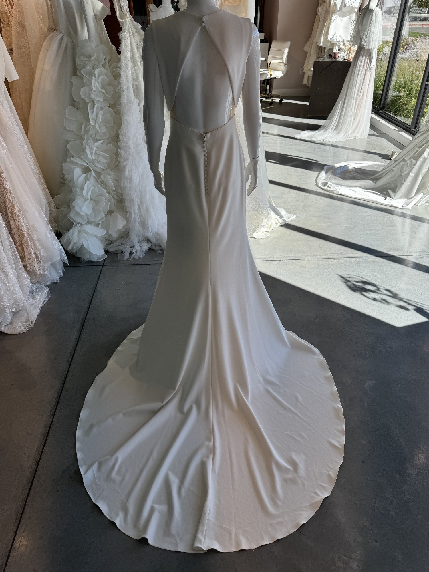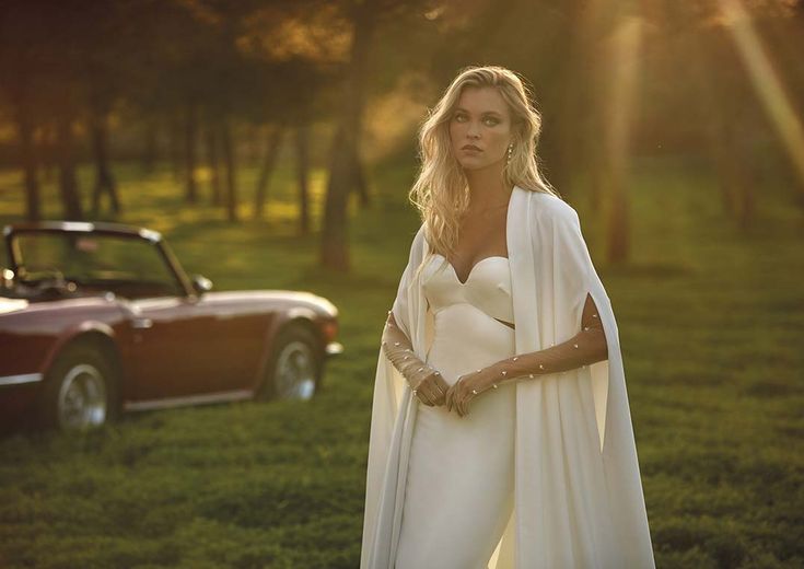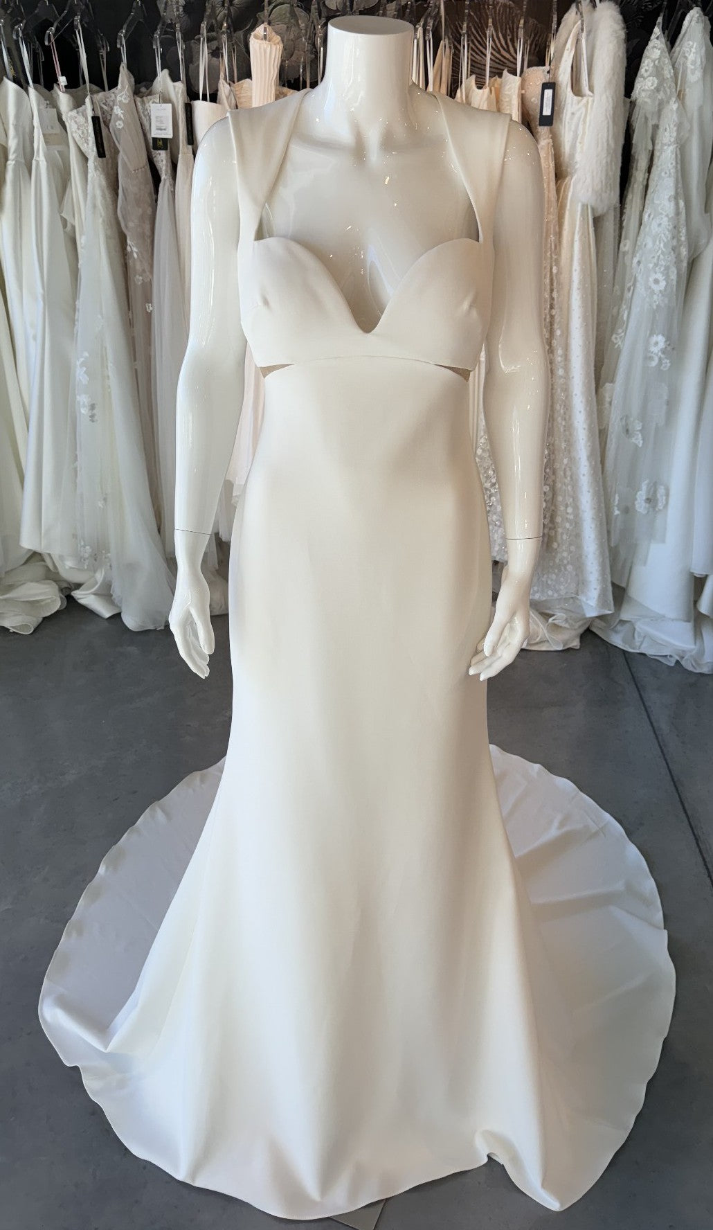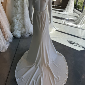 The Aman gown by Pronovias is a simply a show stopper! Aman is a Mermaid crepe wedding dress with sweetheart neckline. This fashion-forward gown combines a minimalist mermaid style with daring geometric forms and on-trend keyhole back. Add sheer gloves or a cape to add glam and versatility (not included). In slinky crepe.