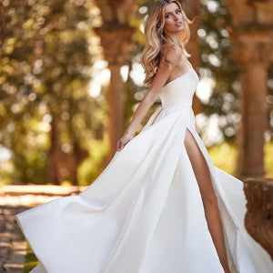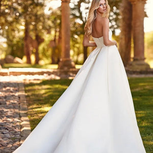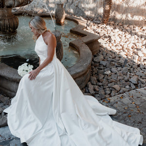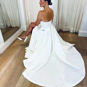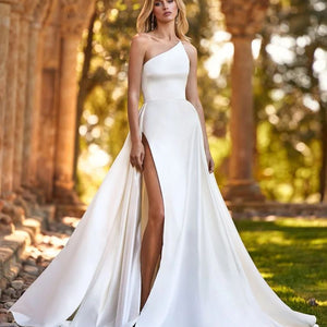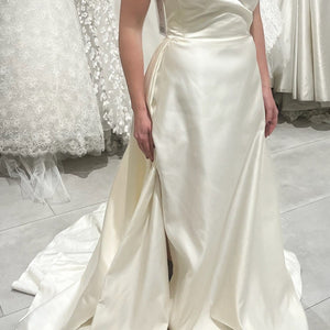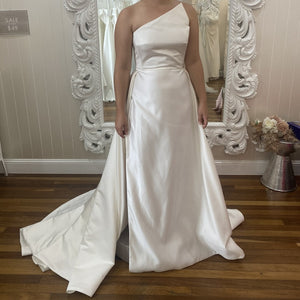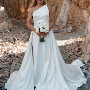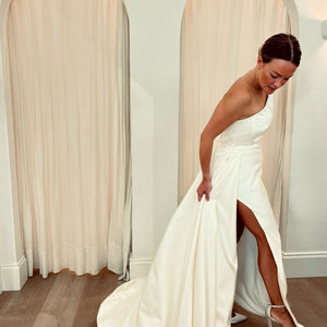 A confident and stylish satin wedding gown by Pronovias with a minimalist, asymmetrical bodice over a full skirt featuring an ultra-high split. Gently fitted over the hips to create a clean silhouette before flaring into a full ball gown skirt.