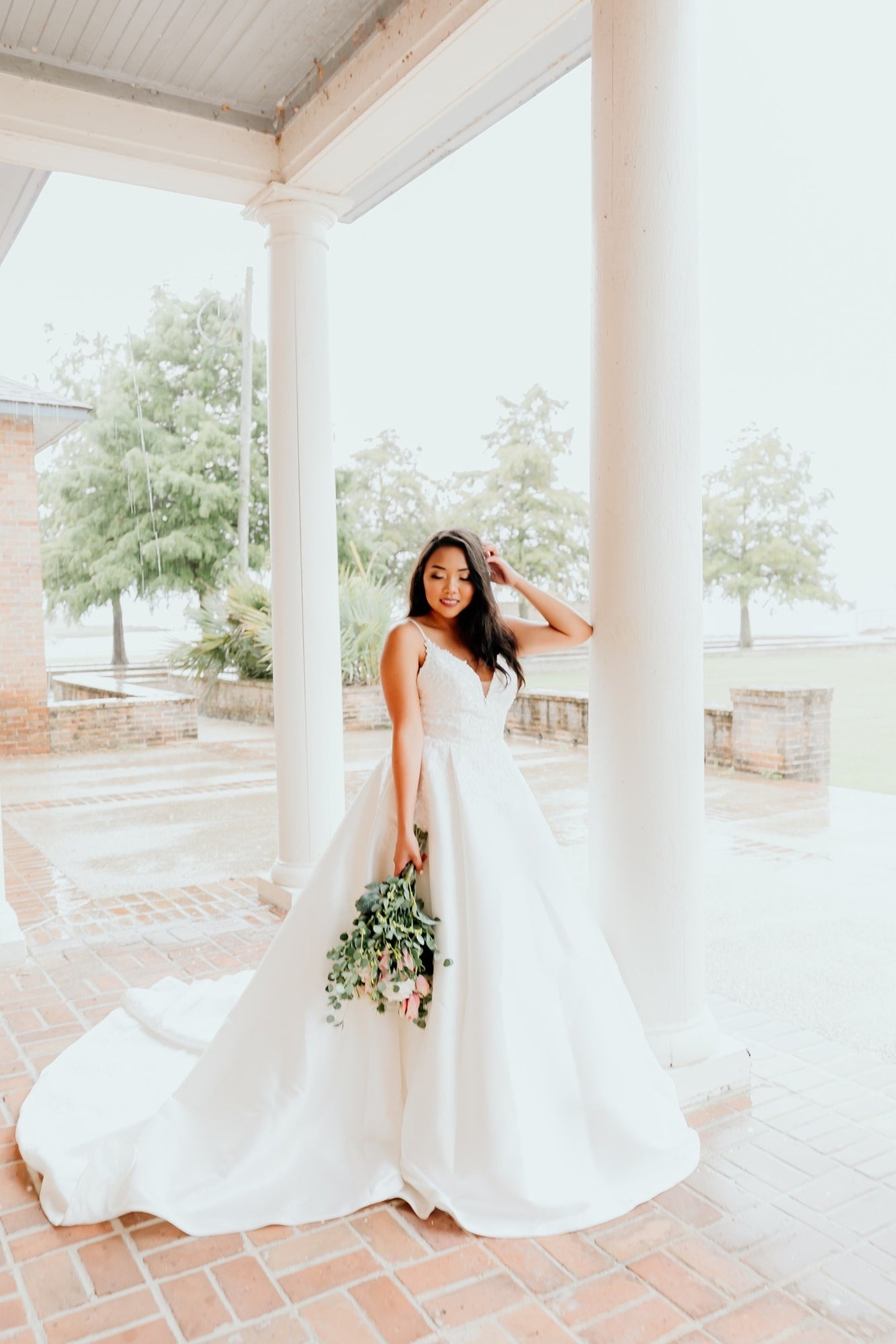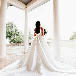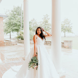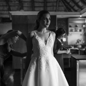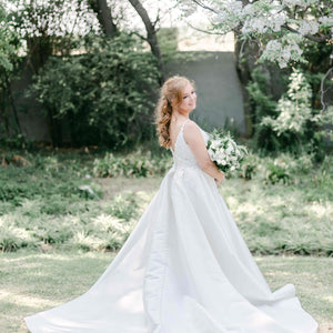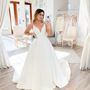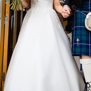 Clean and dreamy, this mix of modern style and classic beauty is what this Stella York gown is all about. The matte, leafy material of the laces adds a subtle yet head-turning contrast against the Pearl Mikado fabric and delicate strap details. Box pleating in the full ballgown skirt add texture and formality to this full, grand silhouette with a laid-back twist as the laces grow organically throughout the bodice and over the waistline. These laces are reflected once again throughout the train, intermingling elegantly with the fabric-covered buttons that extend to the hem.