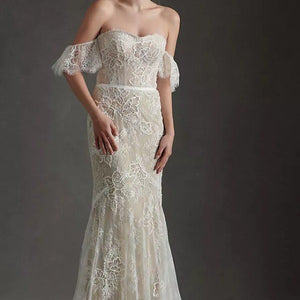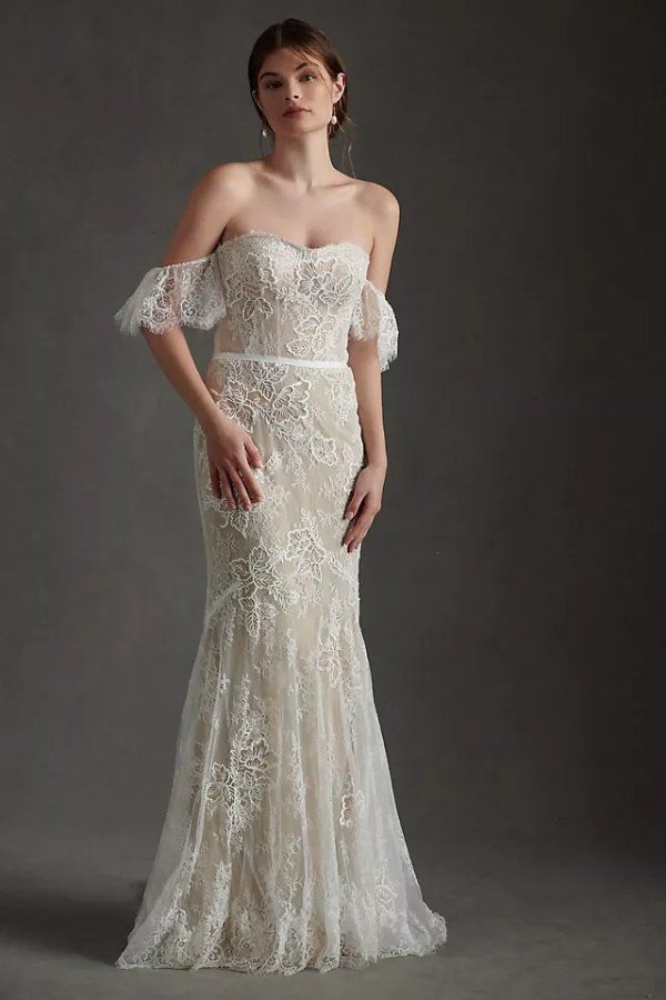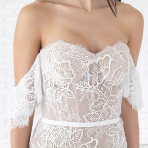 Get ready to stun on your wedding day with this gorgeous Willowby Mila lace wedding dress. The boho-inspired off-the-shoulder style adds a touch of romance, while the intricate lace detailing on the gown is sure to turn heads. Perfect for a bride looking for a unique and elegant statement piece. A gown of Maryann Chantilly Lace from head to toe, the Mila gown pairs floral dimension with soft flutter sleeves and exposed corsetry details. Color: Ivory/Nude.