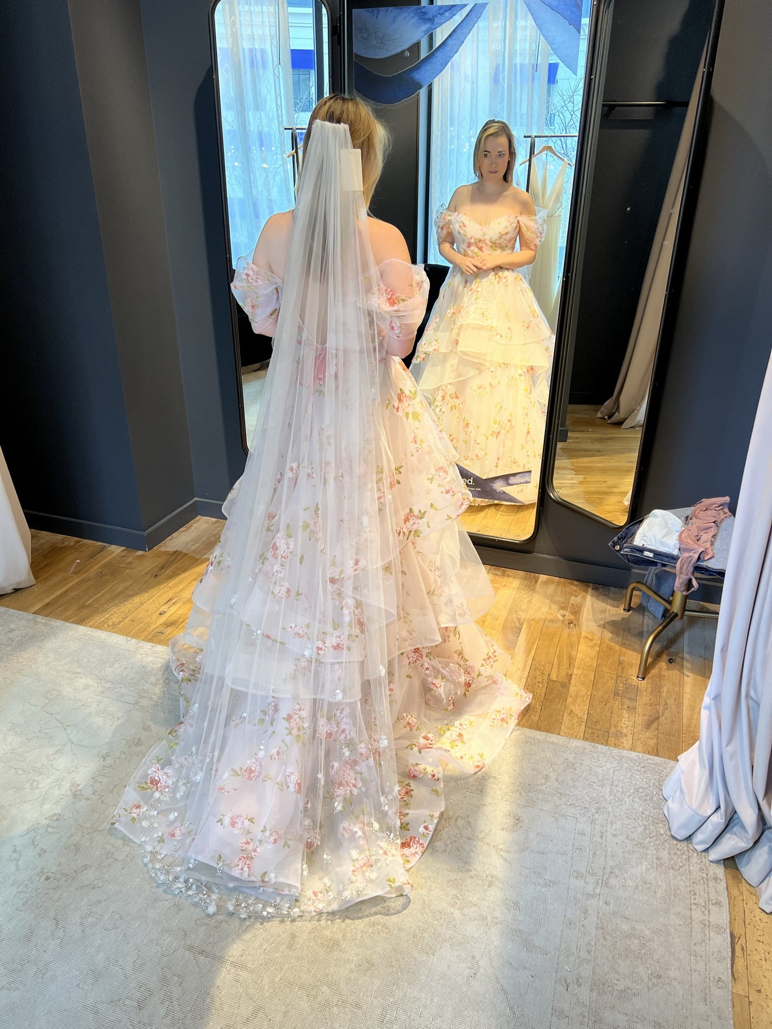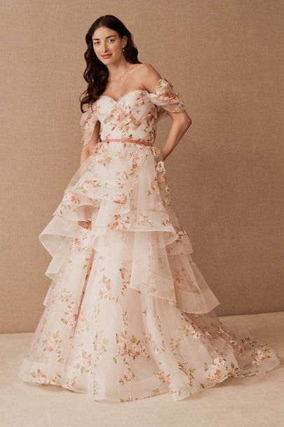 The new Eden Floral printed organza drapes the bodice in a soft moscato pink shade while the tiered skirt sends florals cascading to the floor. The support from the boning within the bodice allows for a subtle off-the-shoulder look, which tends to highlight the decolletage beautifully when combined with a sweetheart neckline.