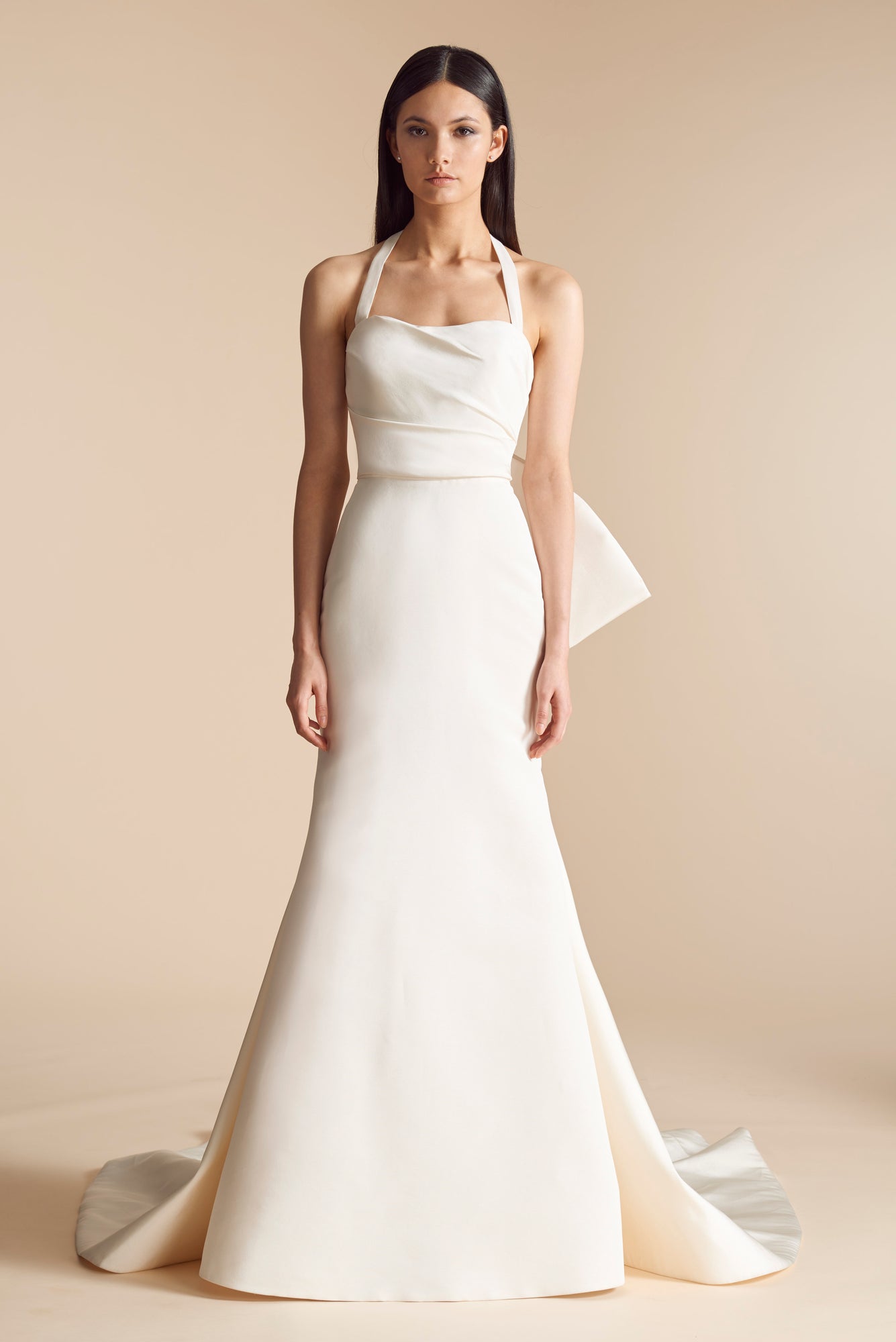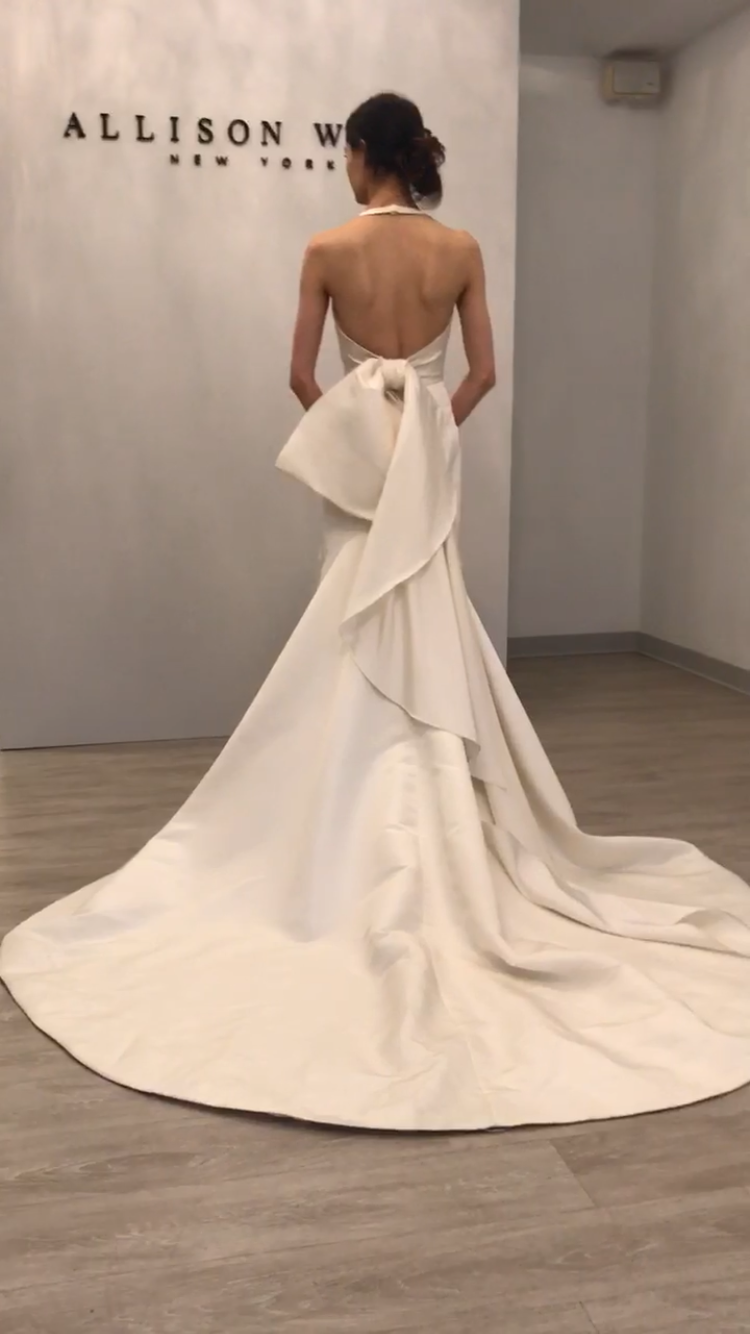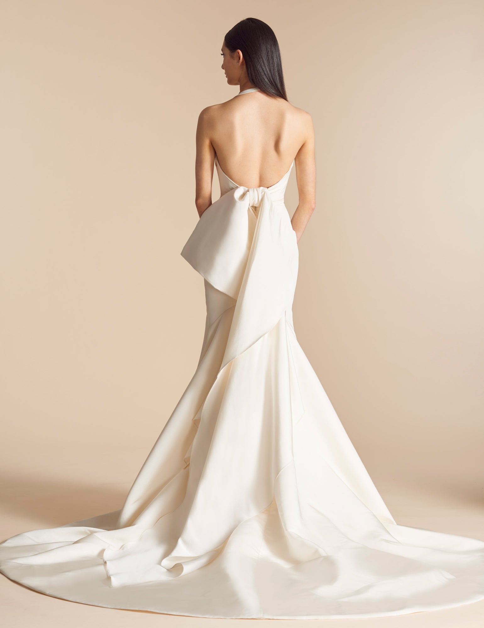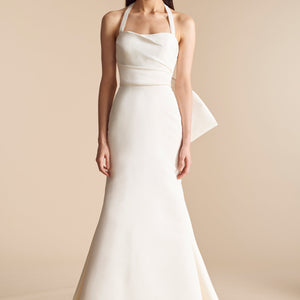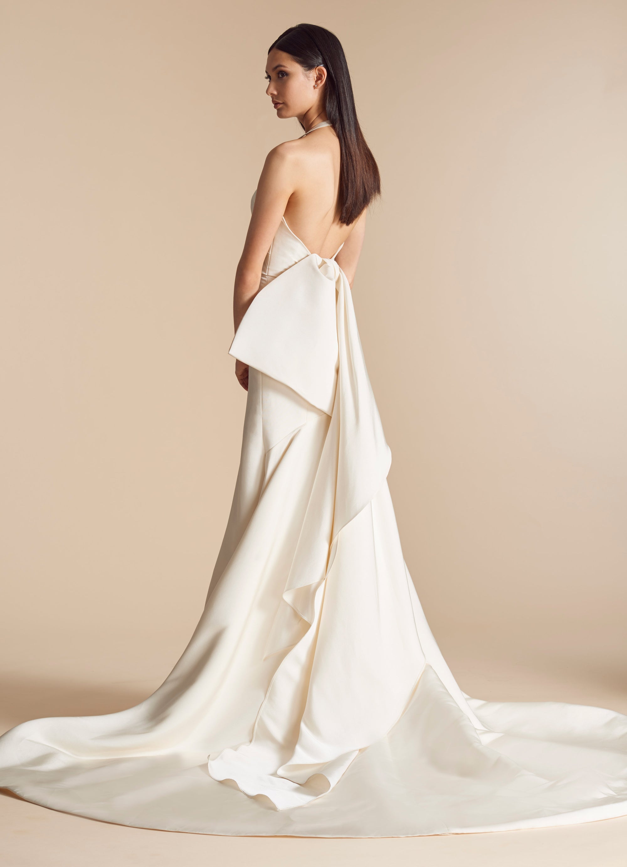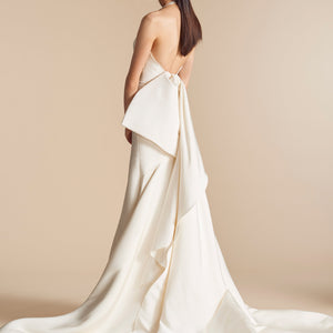 Allison Webb Kingsland bridal gown - Ivory silk faille fit to flare bridal gown with draped bodice, molded neckline with halter straps. Detachable origami half bow, chapel train.