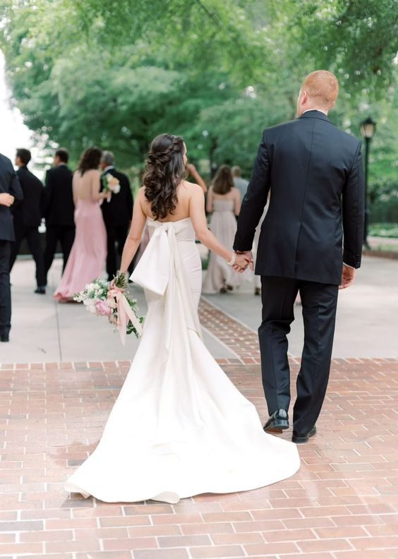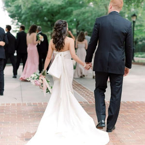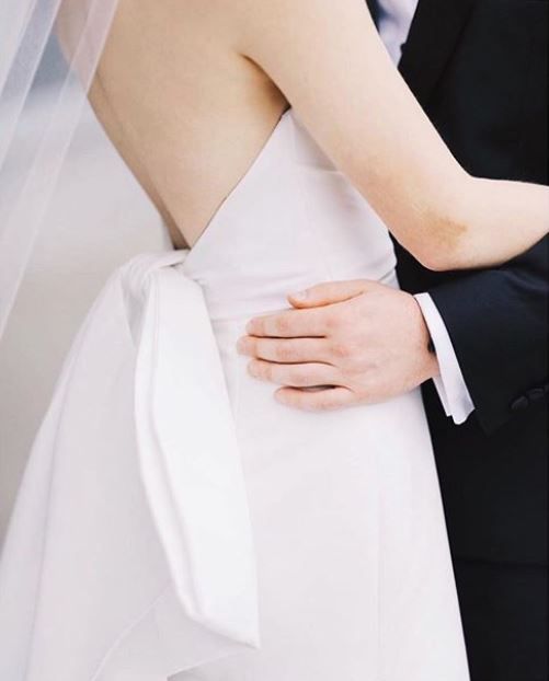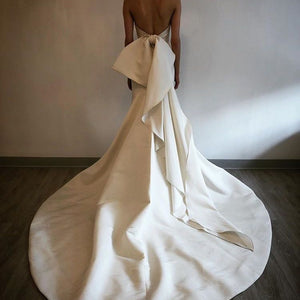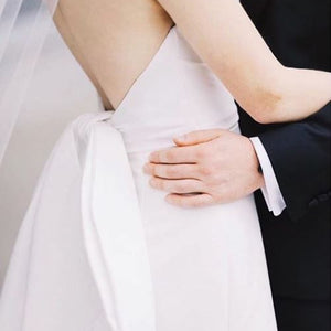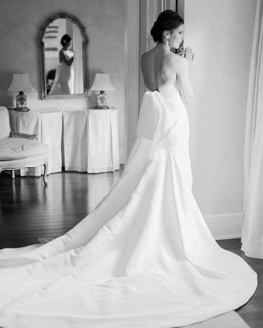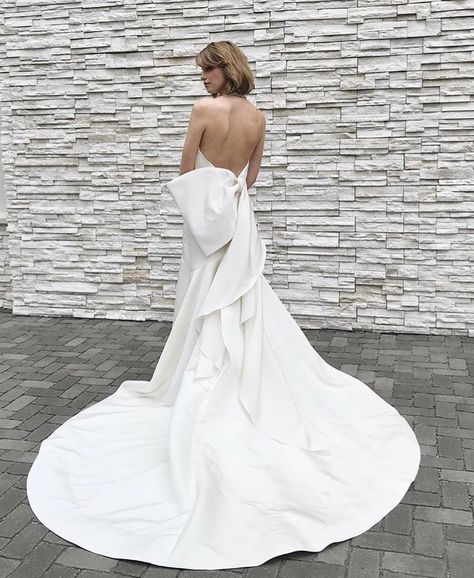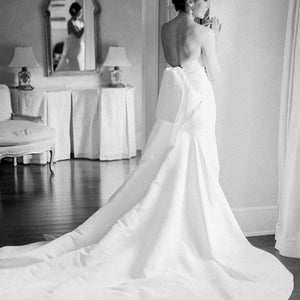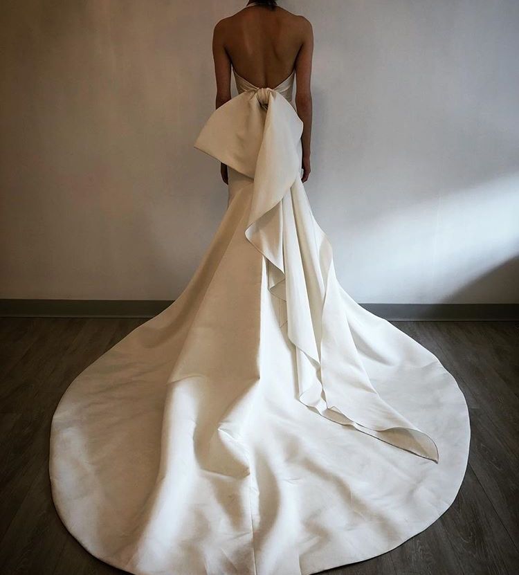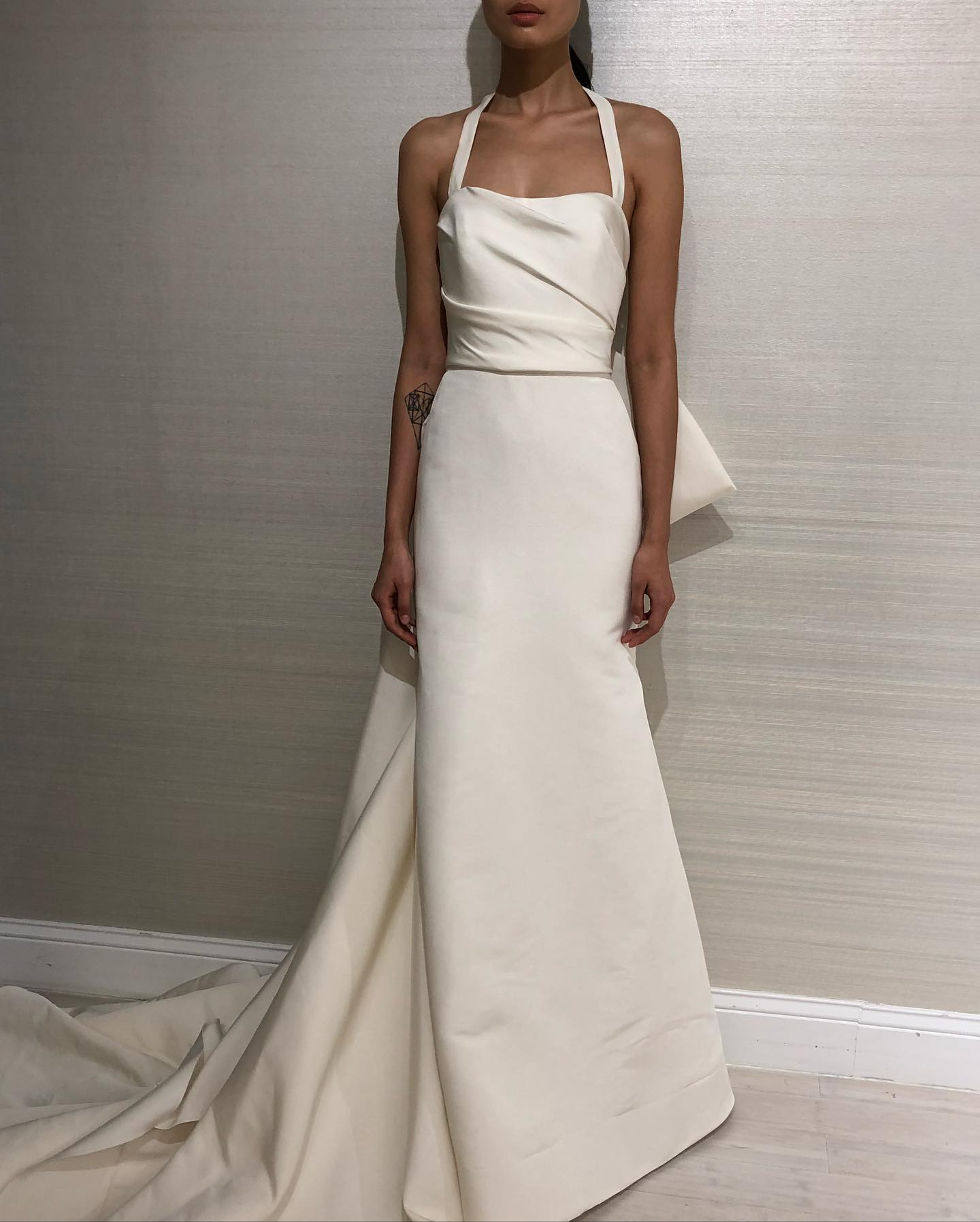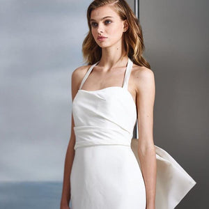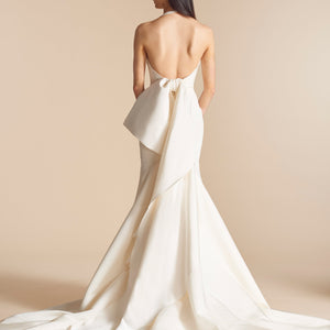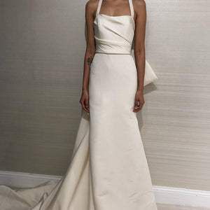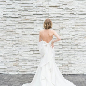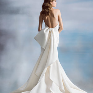 Allison Webb Kingsland bridal gown - Ivory silk faille fit to flare bridal gown with draped bodice, molded neckline with halter straps. Detachable origami half bow, chapel train.