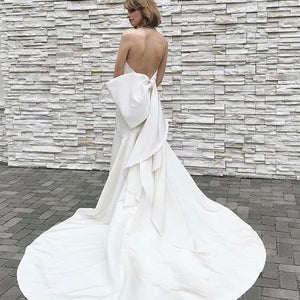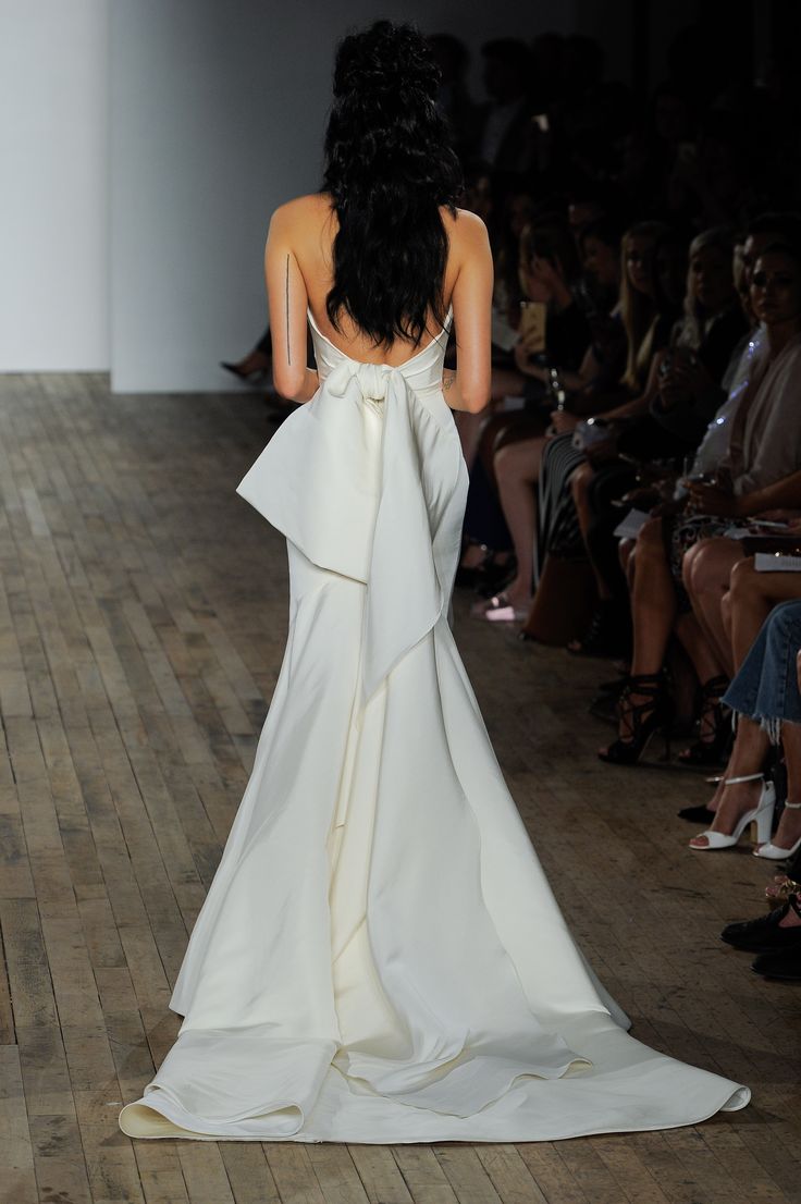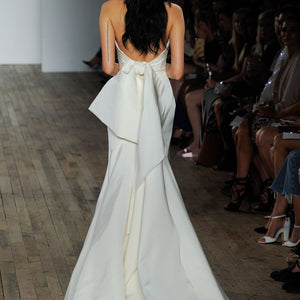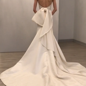 Sample gown that has been tried on in store.  Minor dust along the hemline.  Does not come with the detachable bow in the back. Dress only. Never worn outside the salon and never altered. Retail price: $3,300.