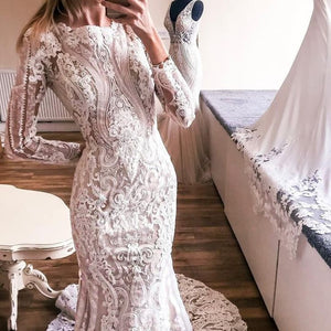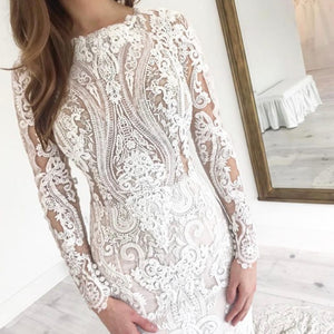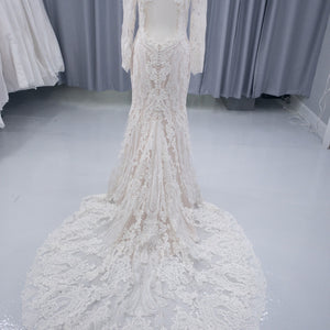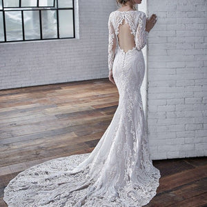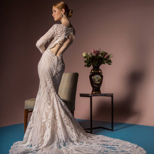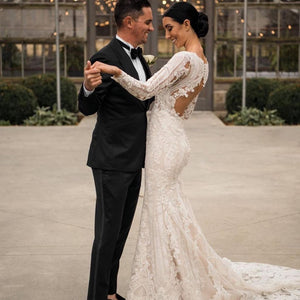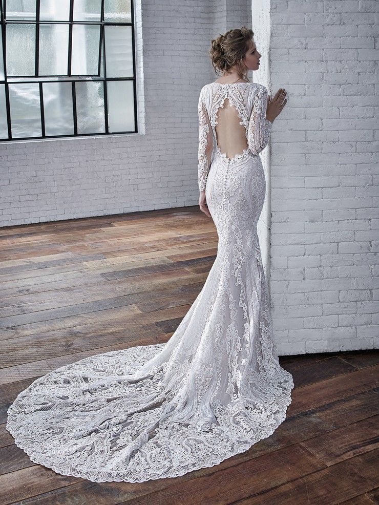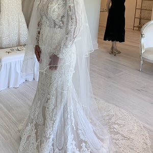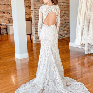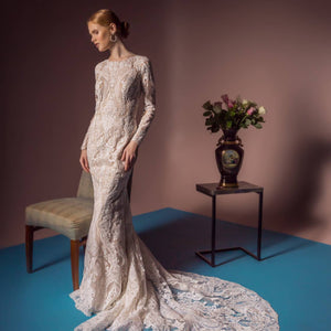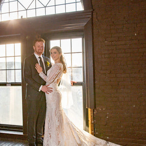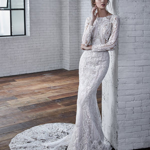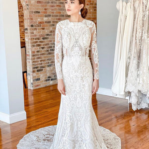 Vintage details with a touch of modern make the perfect combination for Badgley Mischka's Callista gown. This stunning fit and flare beautifully blends a corded lace with embroidered lace, giving the gown gorgeous dimension. The long sleeves and key-hole back emphasize the classic nature of this beauty.