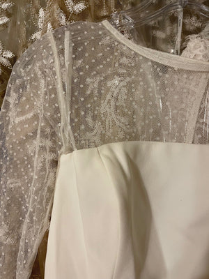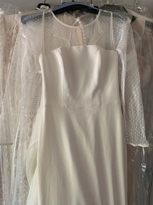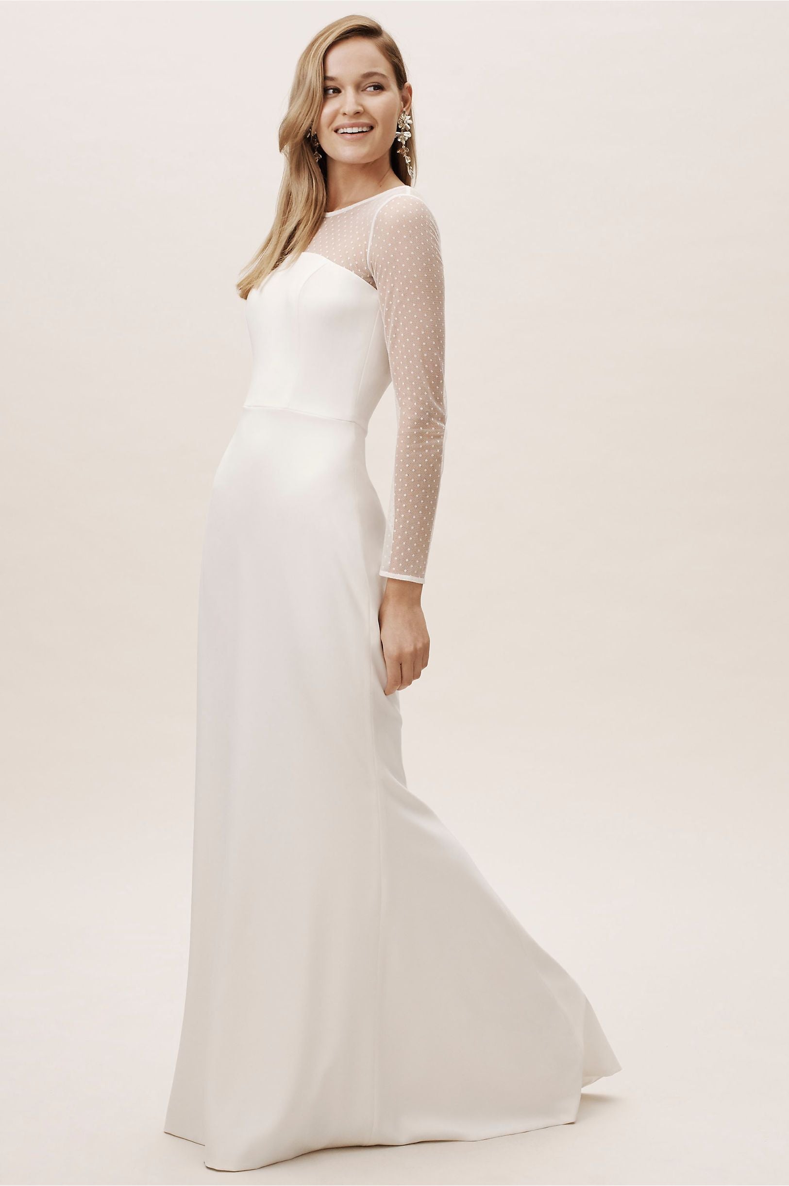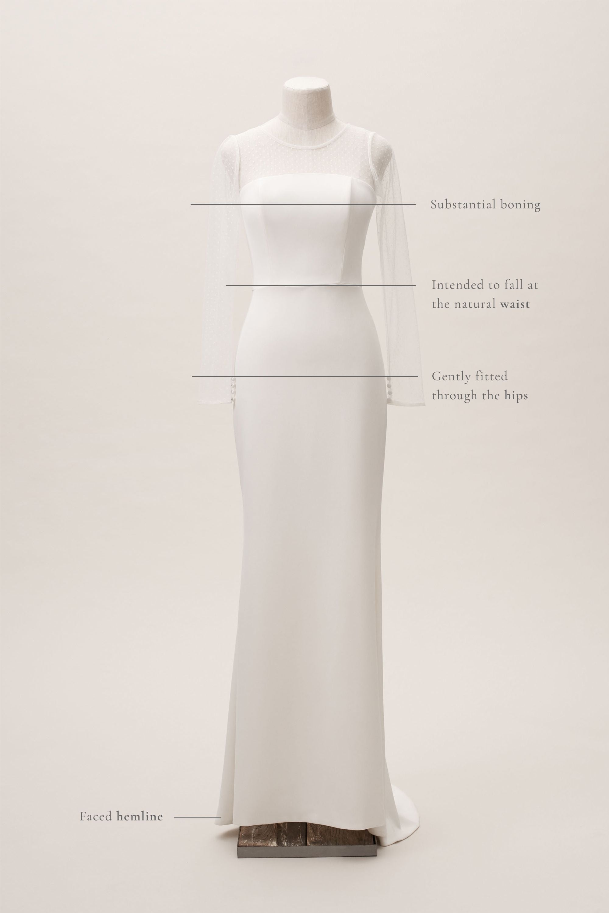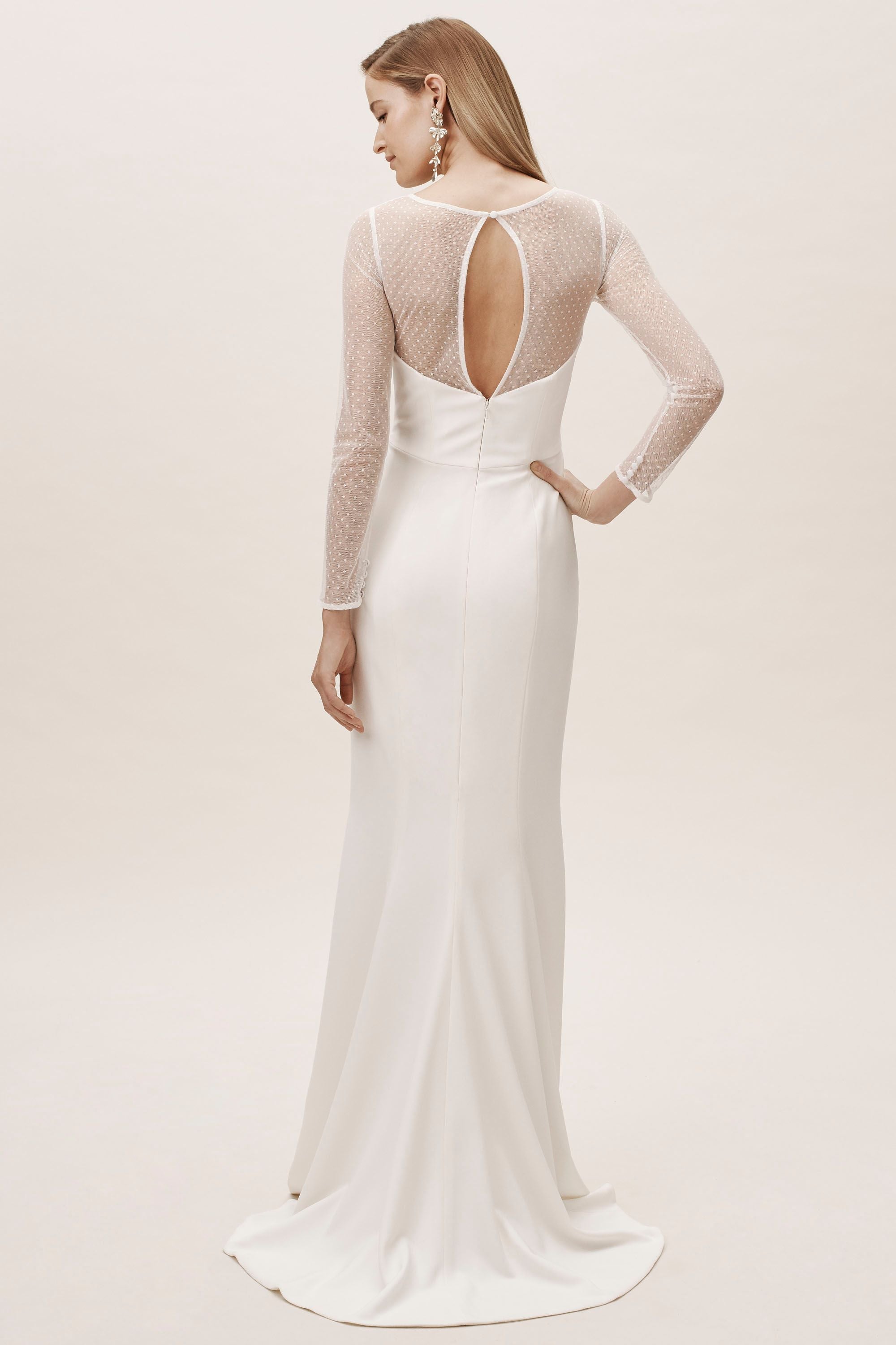 This sleek crepe sheath features sheer long sleeves, crafted from Swiss-dot tulle. It's an altogether lovely and classic look. By Amy Kuschel.