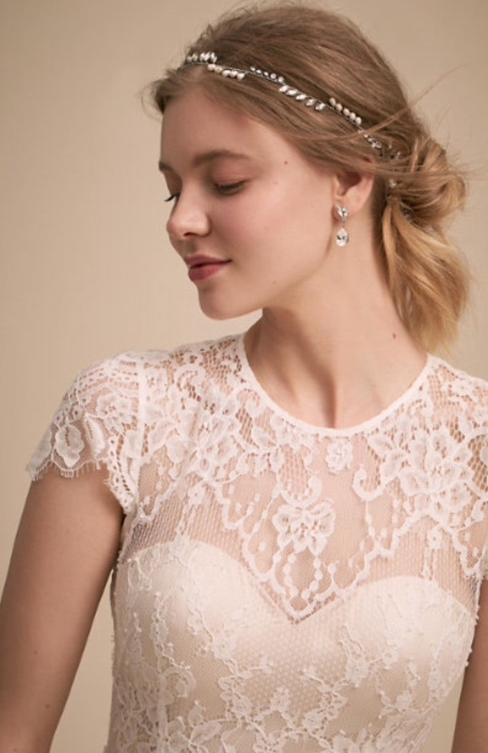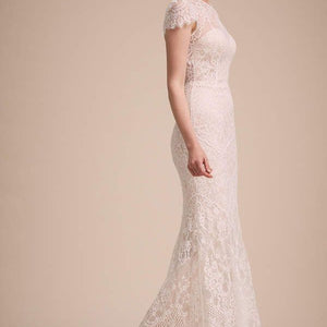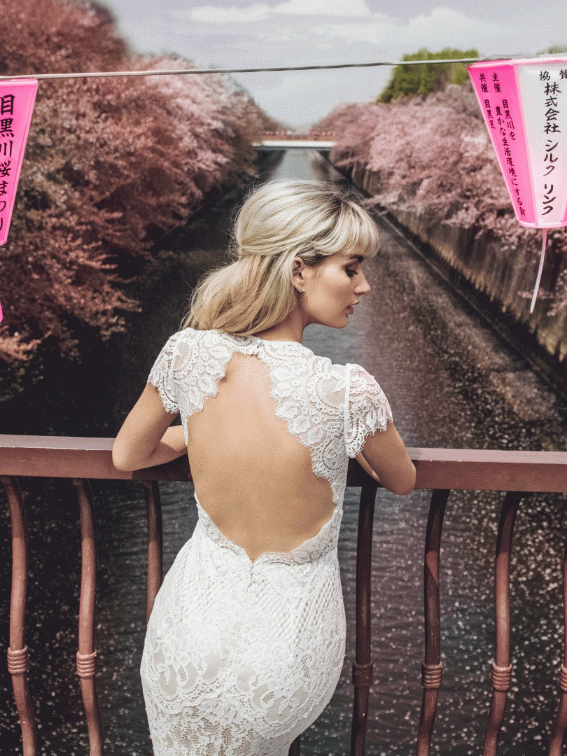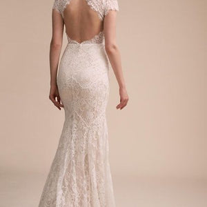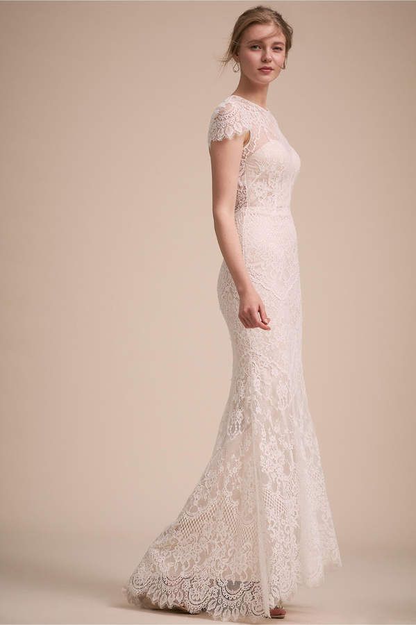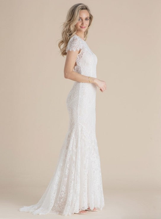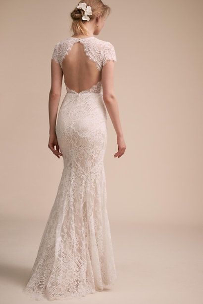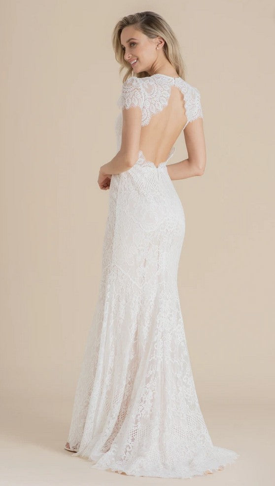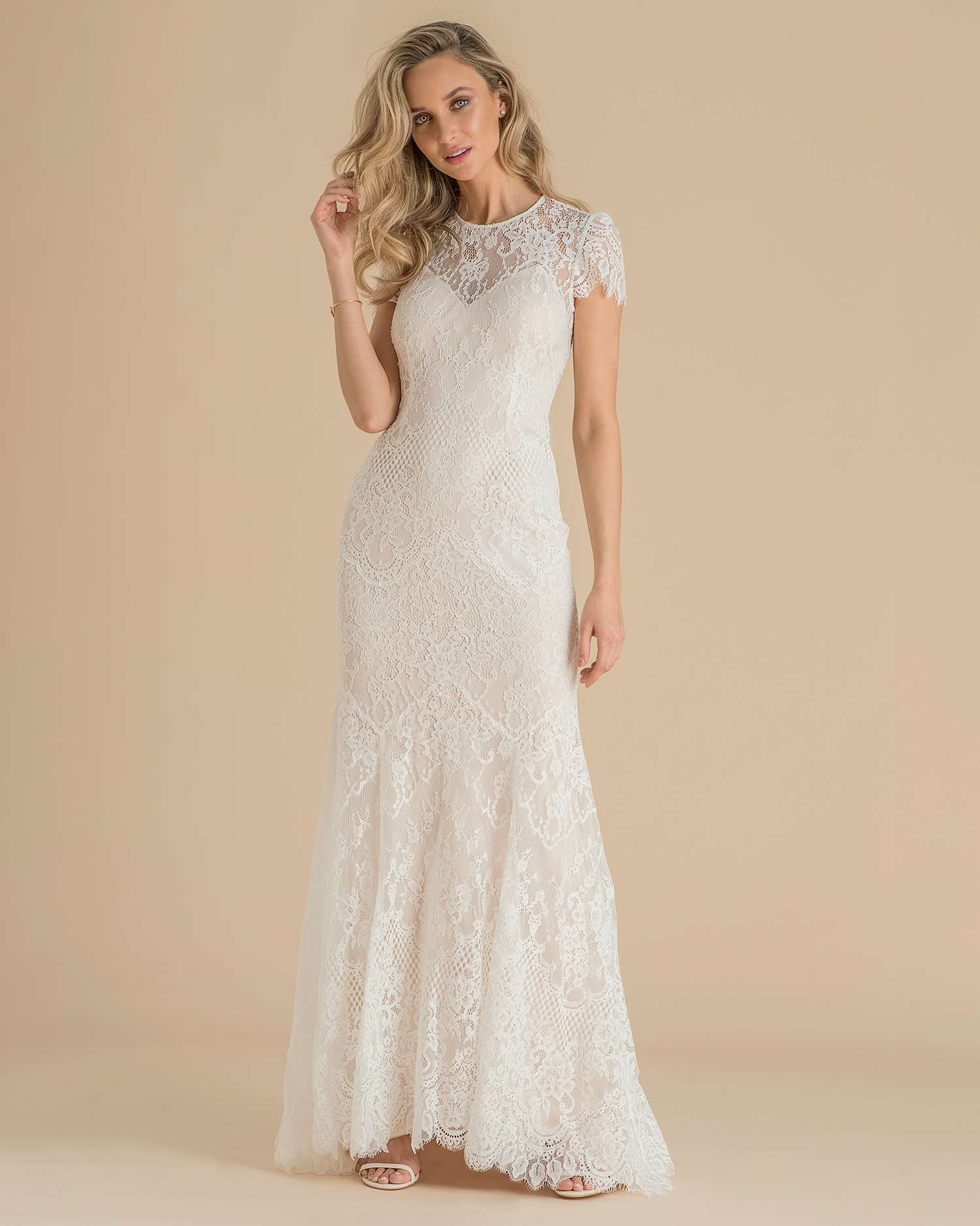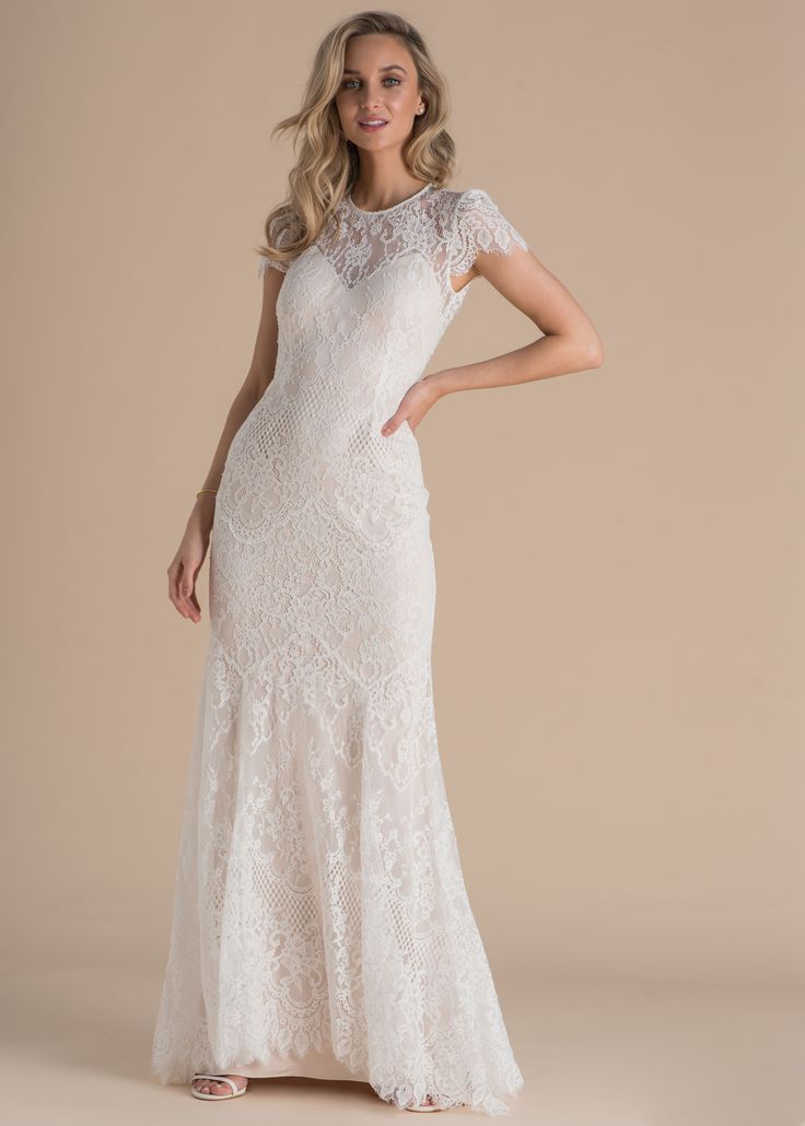 Crafted from lightweight lace, this body-hugging column gown features delicate cap sleeves, an illusion neckline, and a modern open back.