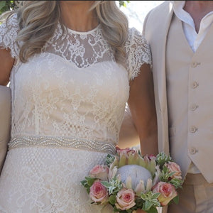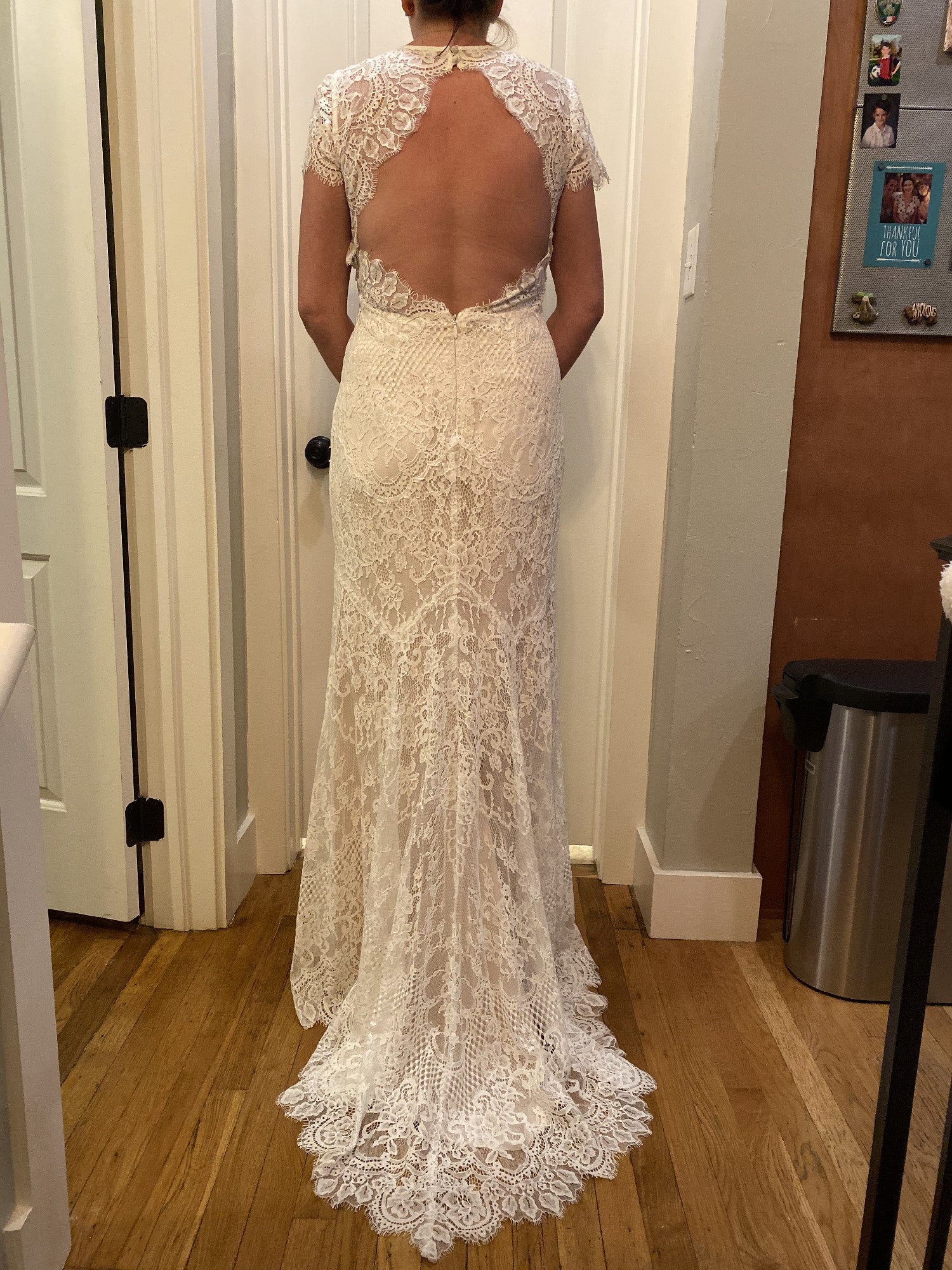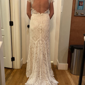 US Size 12. Has been tried on in store, but overall in excellent condition. Minor wear on the inner neckline from being tried on (the outside looks great). Dry cleaning is recommended to make it perfect for your big day. Price has been reduced accordingly. Retail price: $1,550.