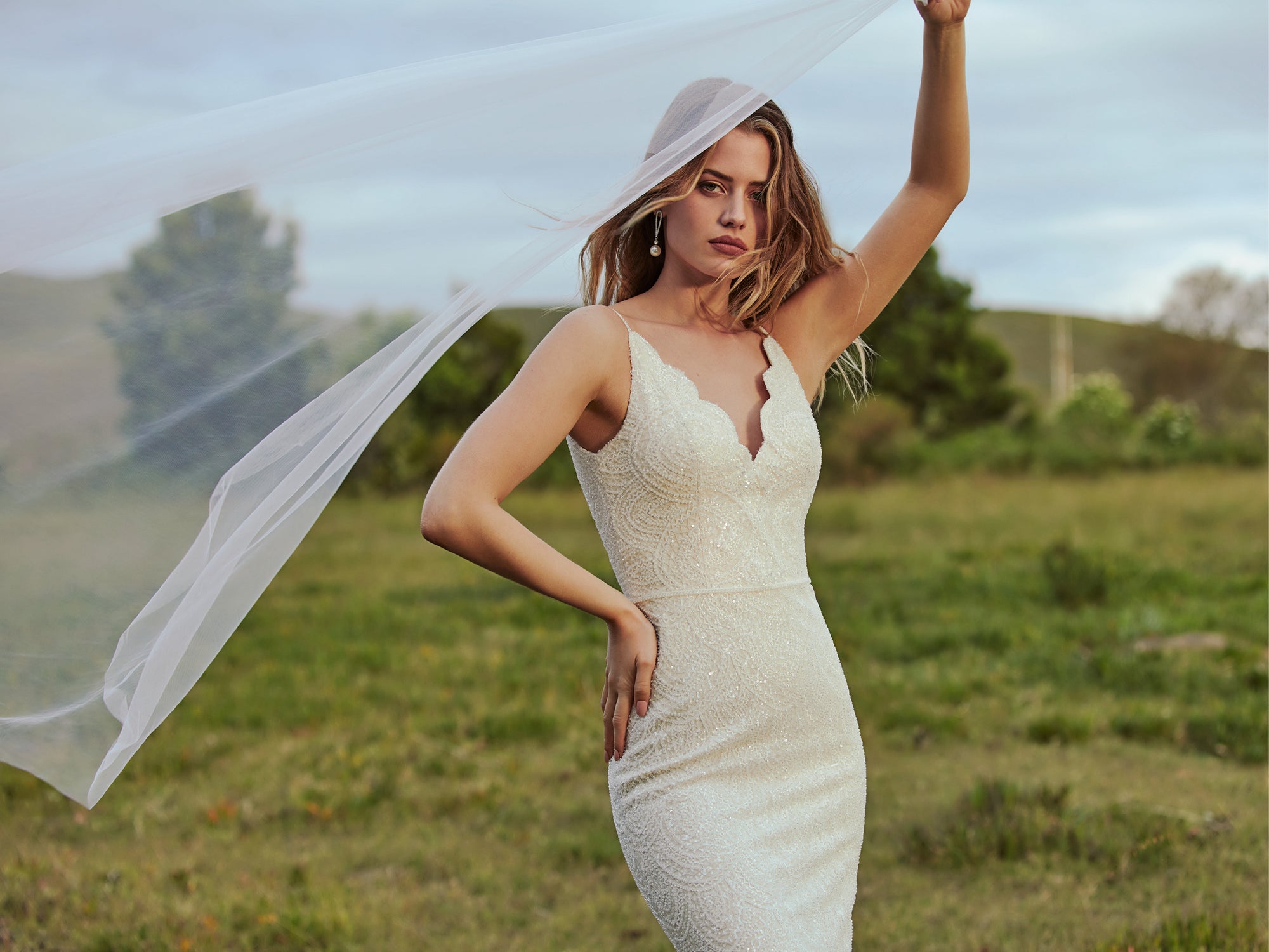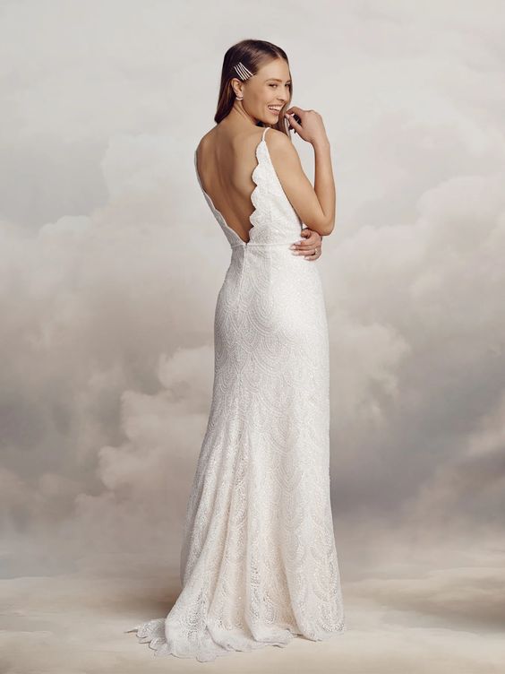 This sleek champagne gown featuring beaded lace and a classic silhouette is perfect for the bubbly bride. Crafted from exquisite beaded lace, the Wesley gown is an elegant and timeless silhouette. This floor-length gown features an alluring scalloped edge neckline with bust cups for added support. Finished at the back with a scalloped edge, this gown is understated yet sophisticated.