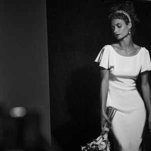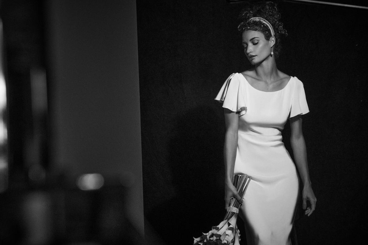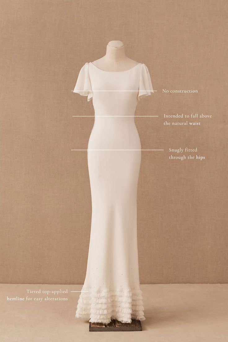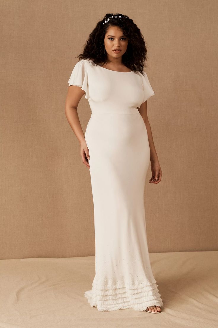 Striking the perfect balance between simplicity and whimsy, this silk crepe gown offers a flowing slip silhouette with hand-cut pieced chiffon ruffles at the hem. Hand-beaded crystal details finish the look with a just-right touch of sparkle.