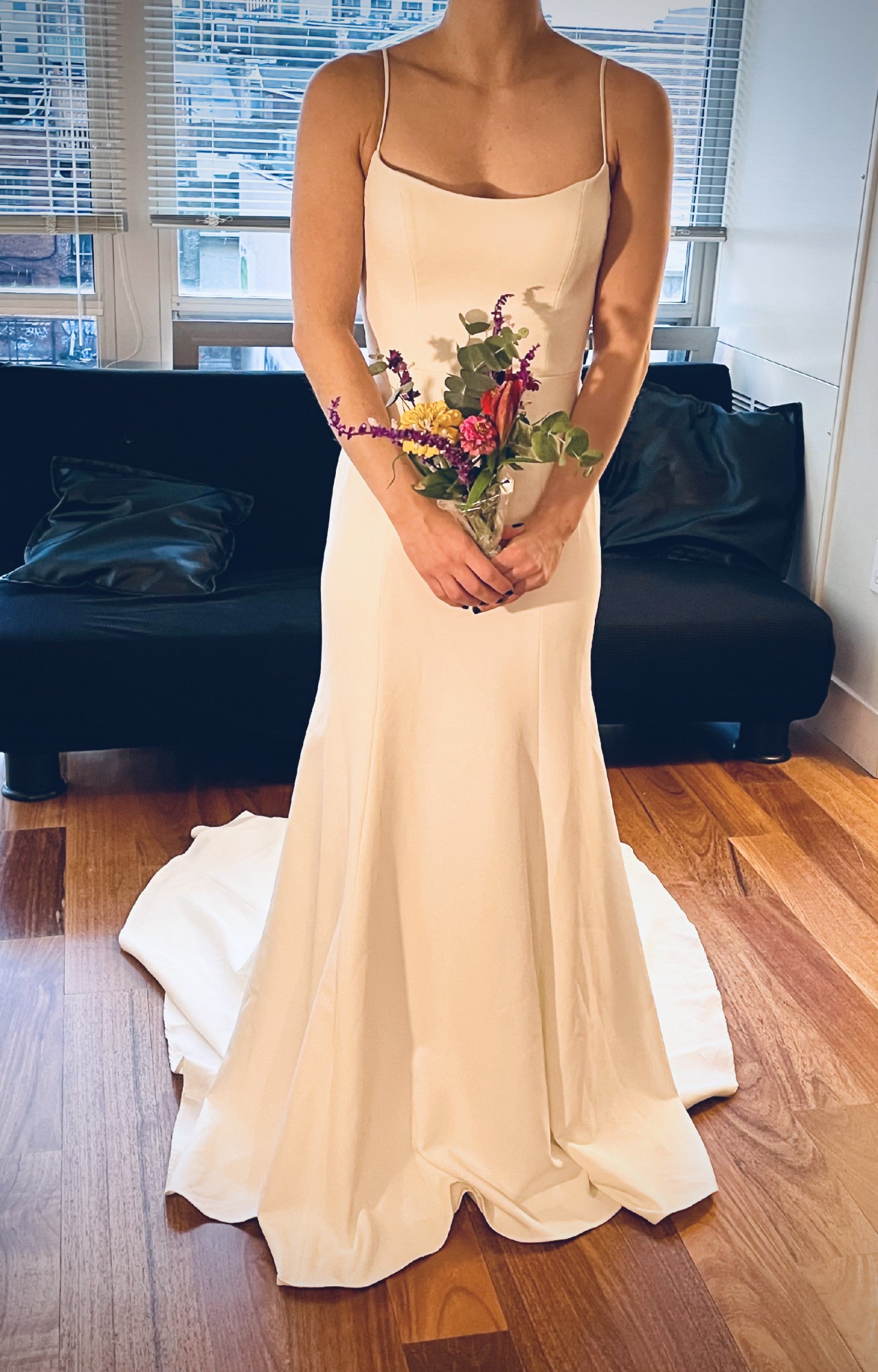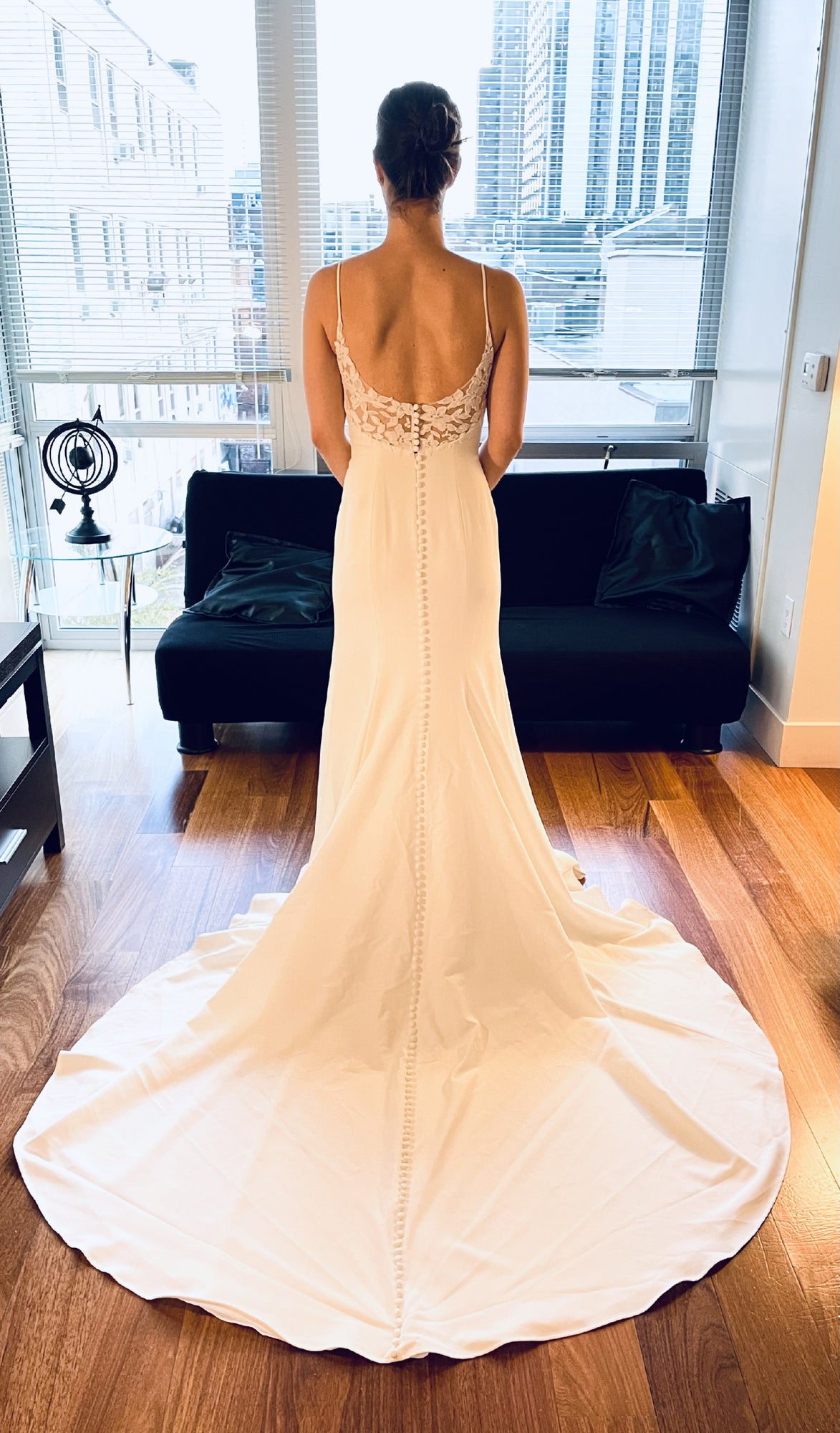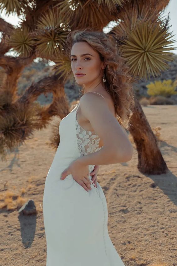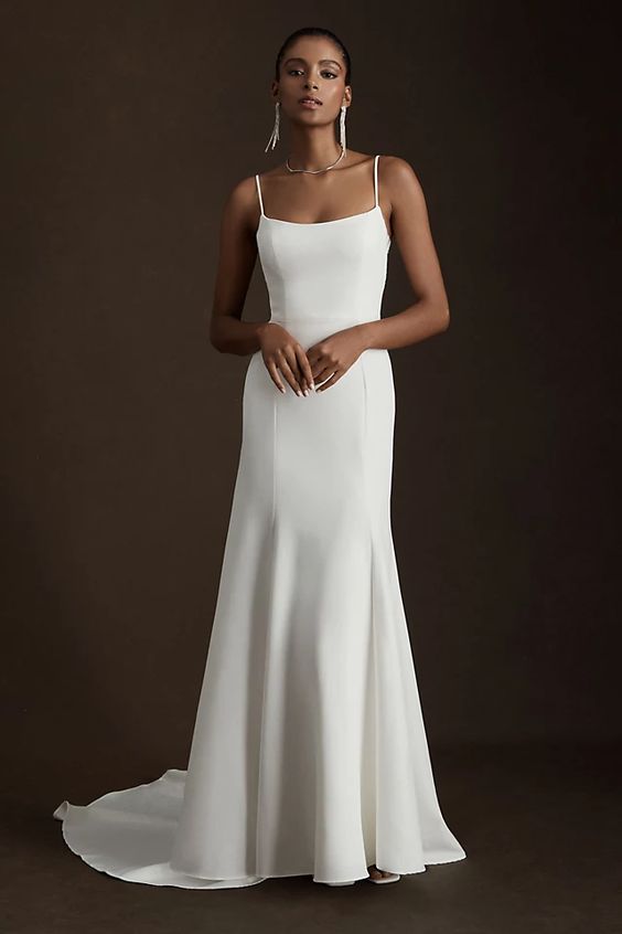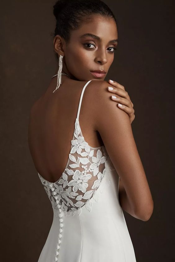 The Caleb scoop neck bridal gown is stunning in her simplicity. Delicate spaghetti straps highlight your shoulders and collarbone, and a modern scoop neckline flatters your décolletage. The sleek fit and flare silhouette accentuates your figure while thoughtful back details add just the right amount of romance. The sheer illusion scoop back is adorned by delicately embroidered florals, and covered buttons down to the hem add a classic bridal touch. Finished with a chapel-length train, this piece is just the thing for a breathtaking entrance on your special day.