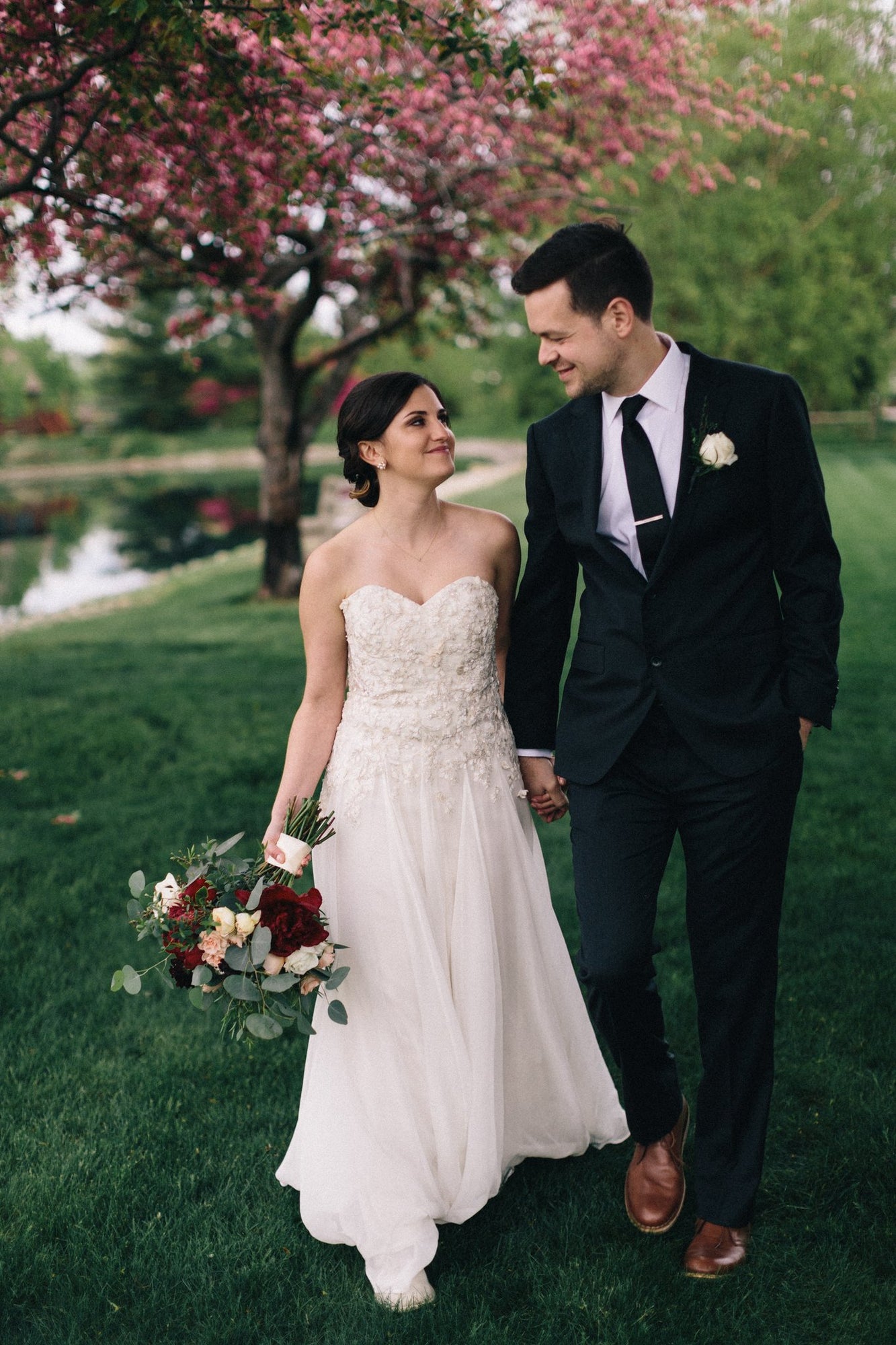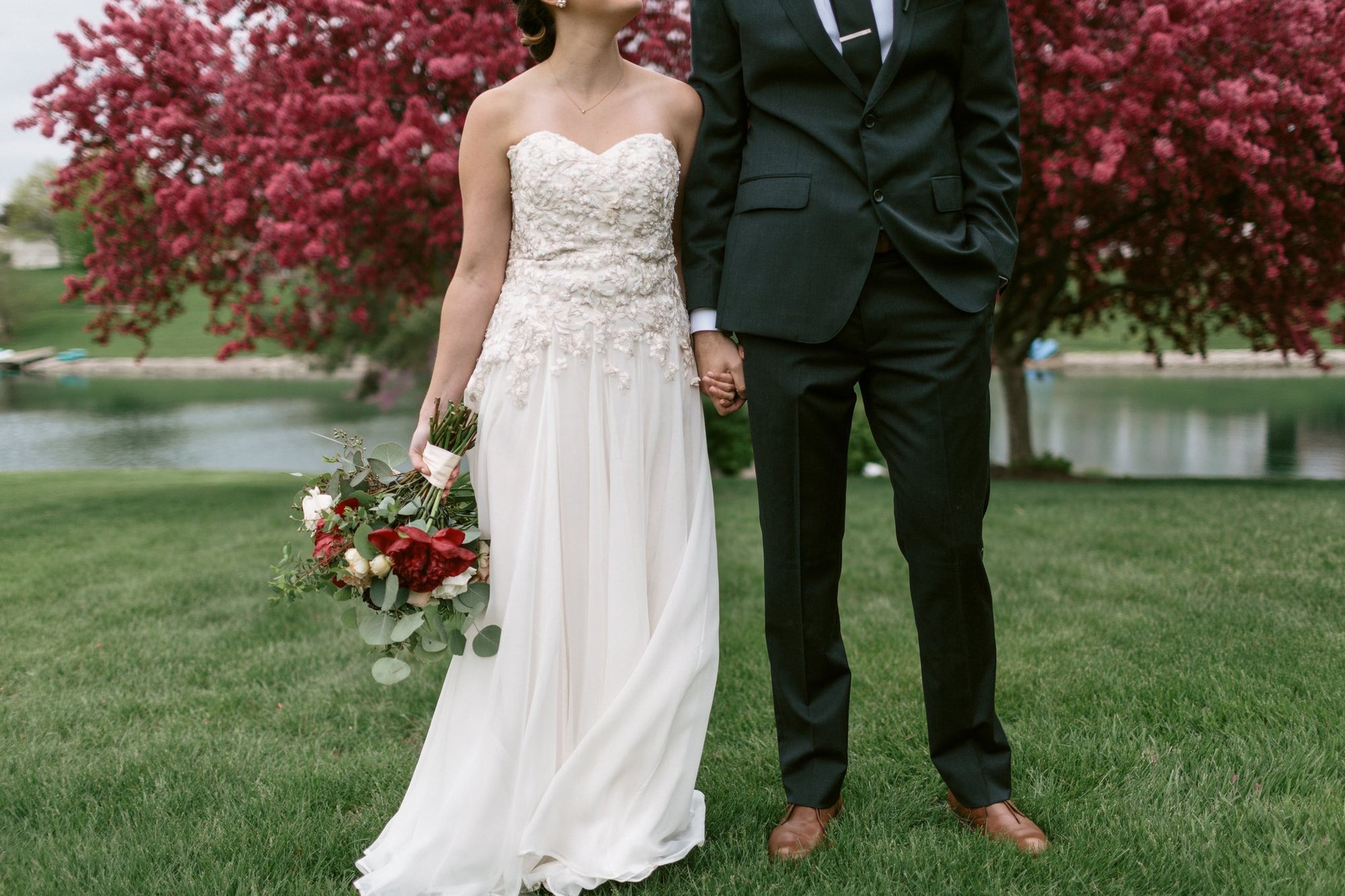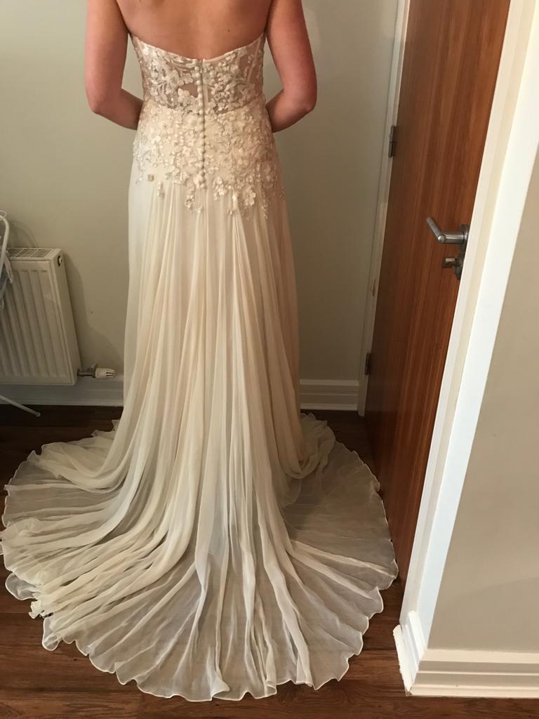 The English Ivy Appliqués adorn the natural waist bodice and the sheer back bodice with a slight basque waistline and corset detailing. The dress is fitted through the hip to highlight feminine curves then flows into a godet skirt with a court train. Covered buttons mask a center back zipper.