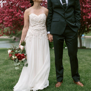 Vintage-inspired embroidery and beadwork add subtle dimension to this gown’s strapless sweetheart bodice. A floaty silk chiffon skirt offers soft contrast to the structured top, creating a timeless silhouette.