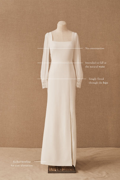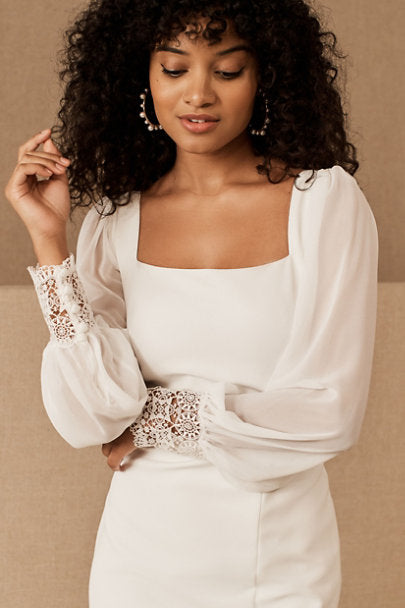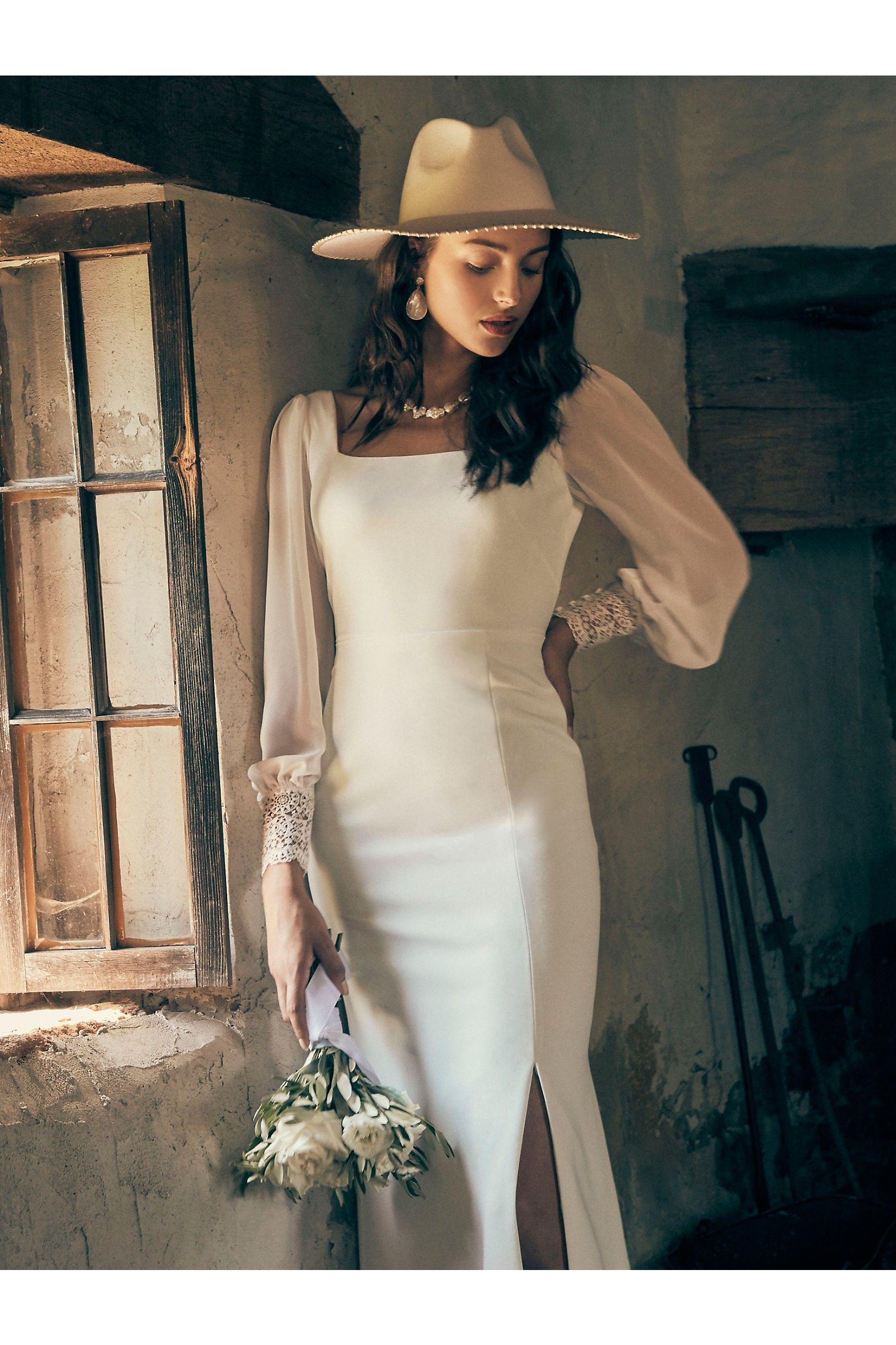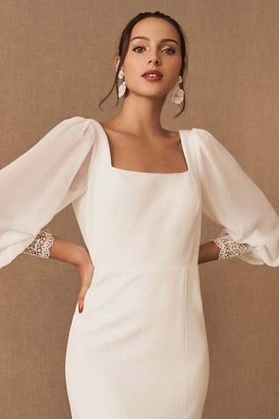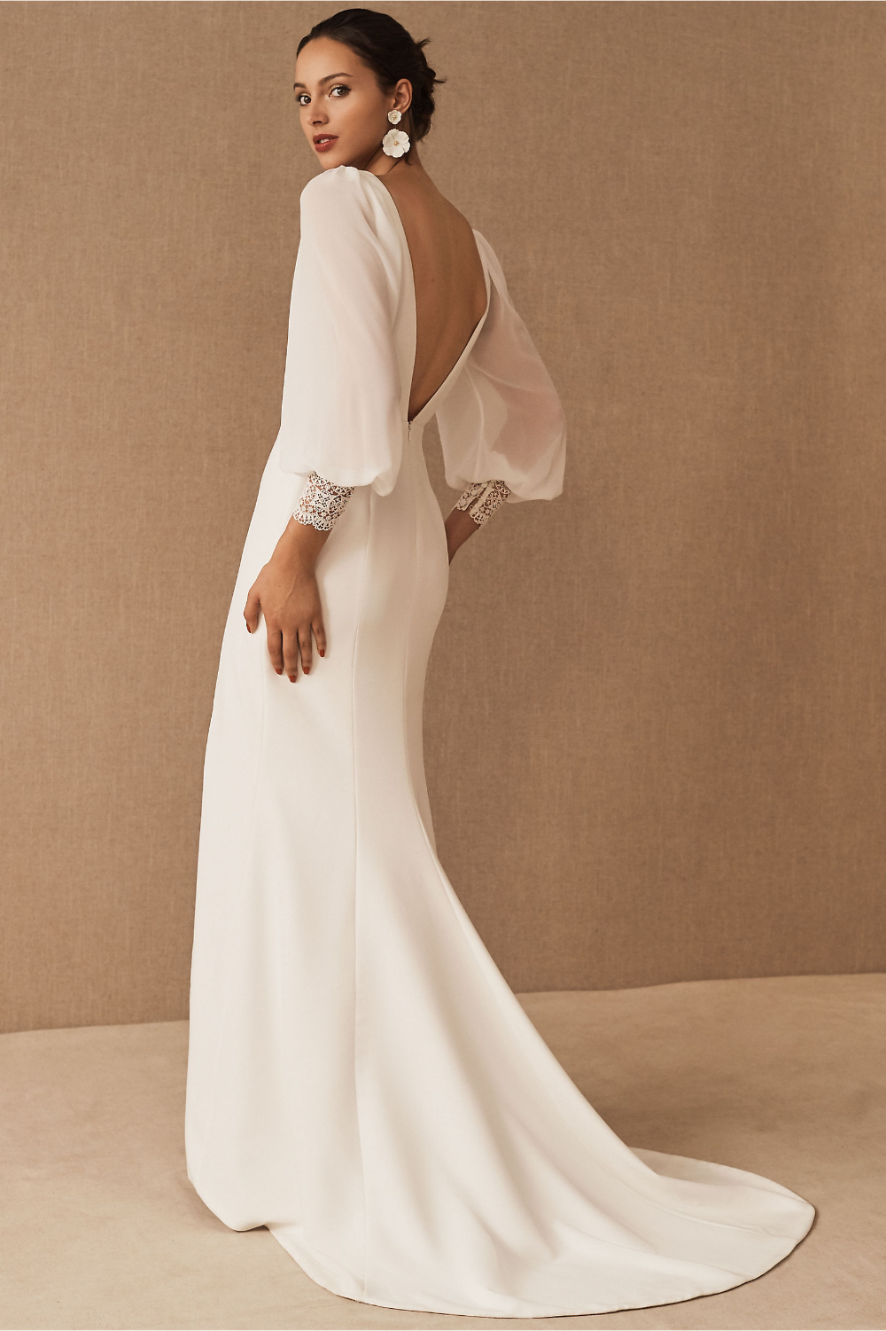 A square neckline and plunging open back lend a modern edge to this fitted crepe gown, while sheer puff sleeves gather into lace cuffs for a romantic finishing flourish.