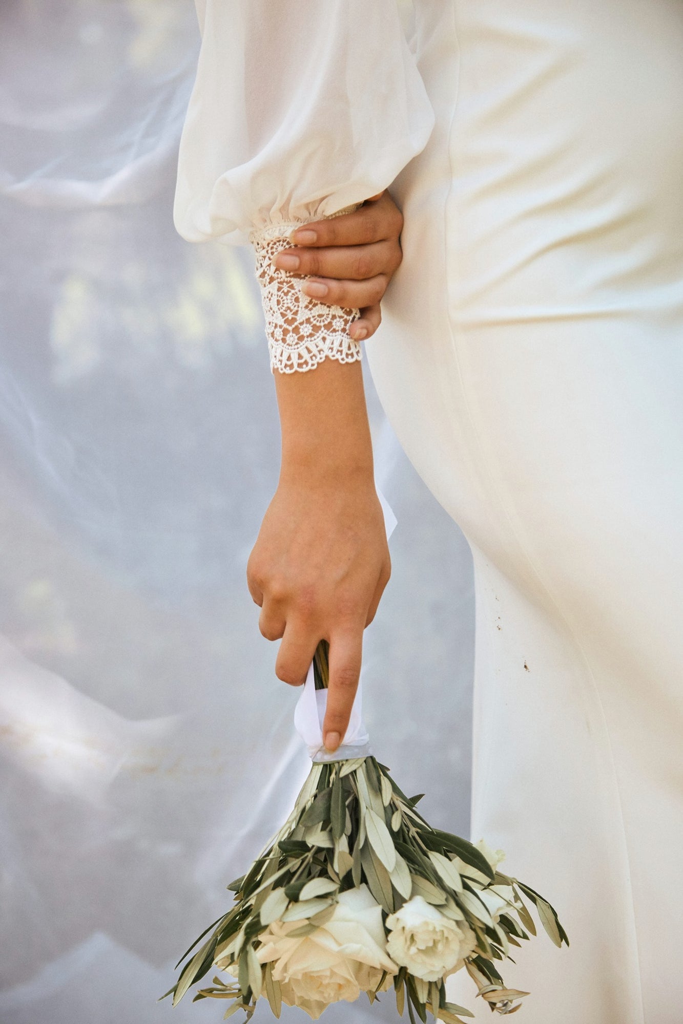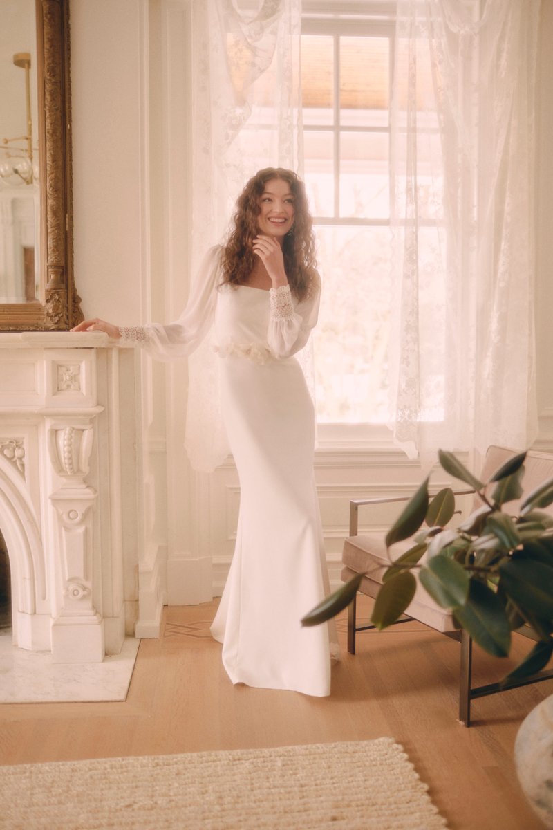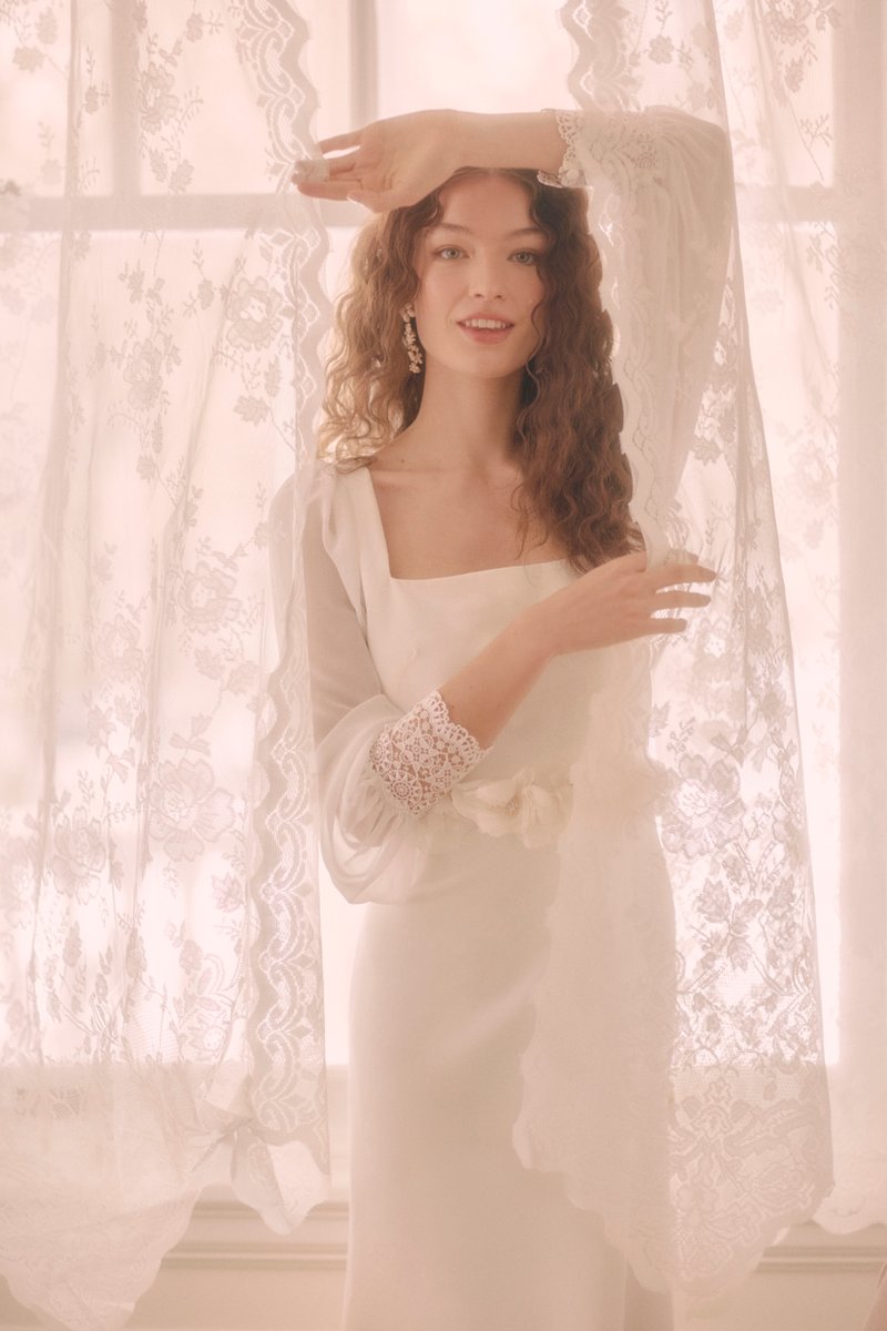 A square neckline and plunging open back lend a modern edge to this fitted crepe gown, while sheer puff sleeves gather into lace cuffs for a romantic finishing flourish.