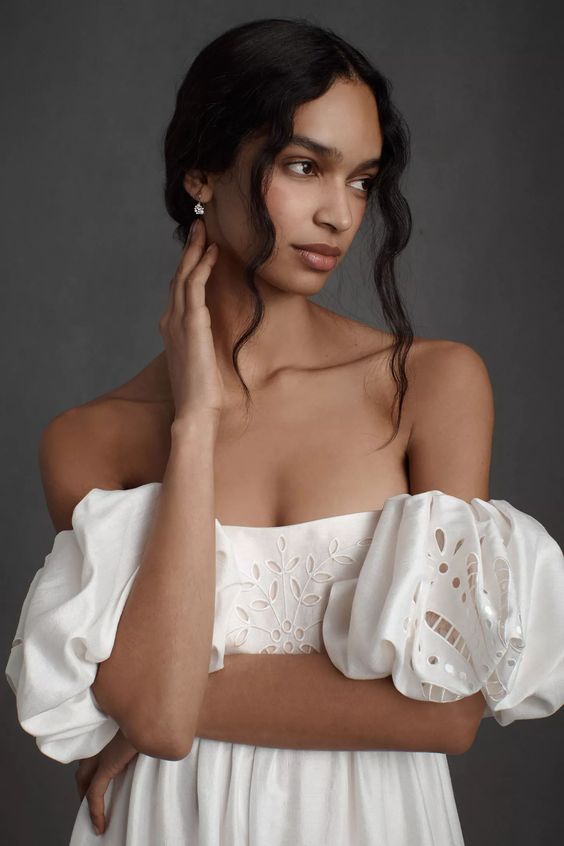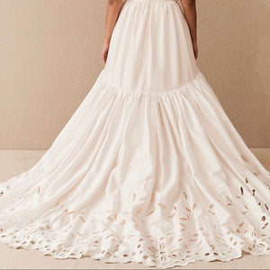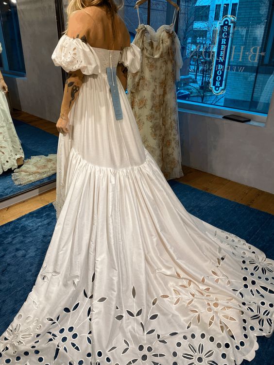 Created entirely by hand, this bohemian gown's large-scale cutwork takes its cues from French Regency design. We hunted high and low for a cotton silk taffeta with the perfect slub texture, which allows the gown's dramatic silhouette to strike a balance between nostalgia and modernity. Off-the-shoulder puff sleeves and a sweeping train complete this maximalist look.