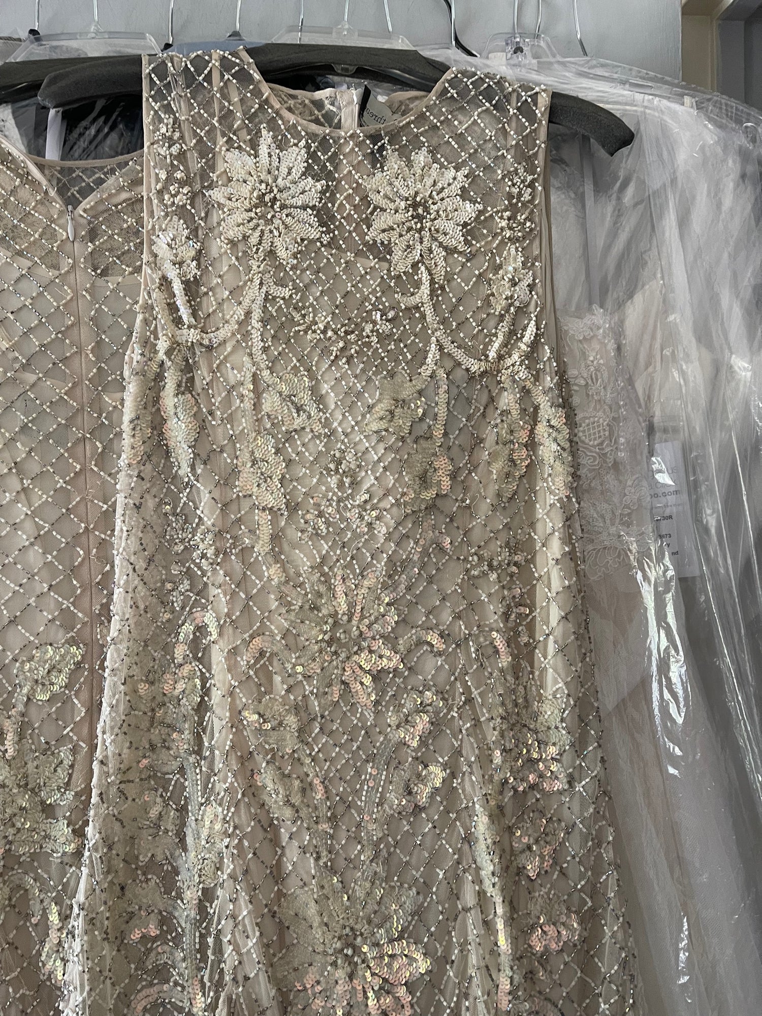US Size 10. Both have been tried on in store and has very minor loose threads. The US Size 10 has a patch of beads missing from the back near the zipper (see last picture). The price has been reduced to reflect this imperfection. The front is in perfect shape. Retail price: $990!