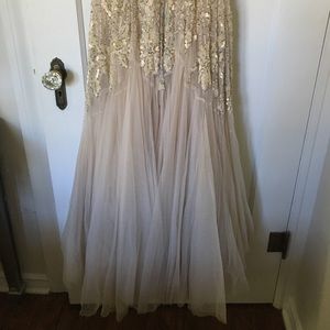 Exquisitely beaded with a pearlescent lattice and vintage-inspired flora, this stunning dress balances glamour and romance in equal measure. We love the way the airy, layered tulle hemline falls lightly over the toes. By Needle & Thread.