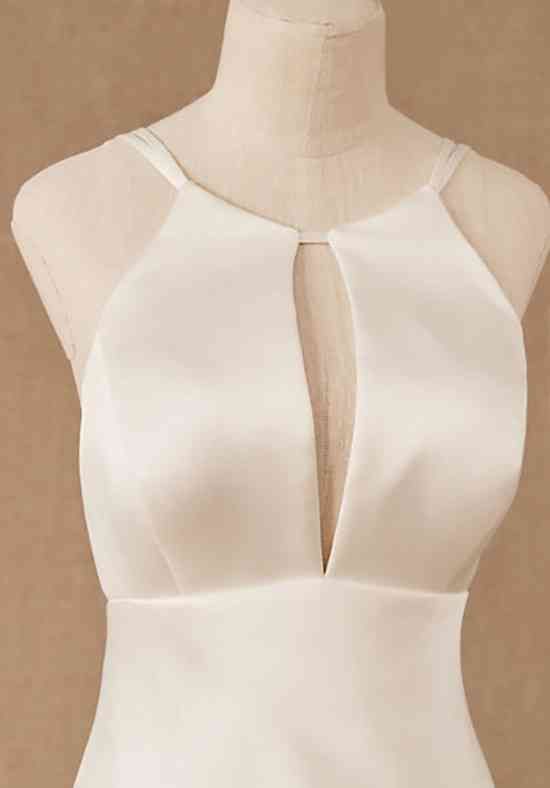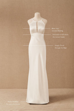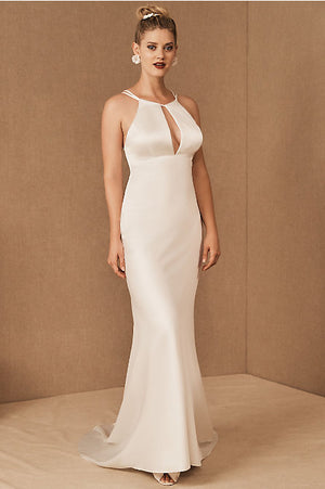 Slinky and modern, this bias-cut gown’s highlight is the bold keyhole neckline accented by strappy back details. The charmeuse lining and subtle train add a soft touch of romance. By Nouvelle Amsale.
