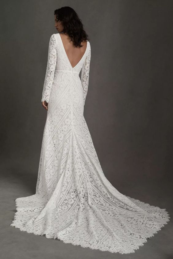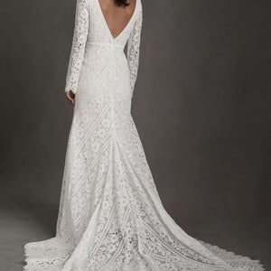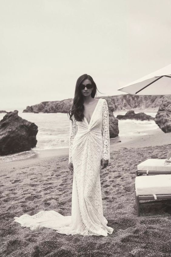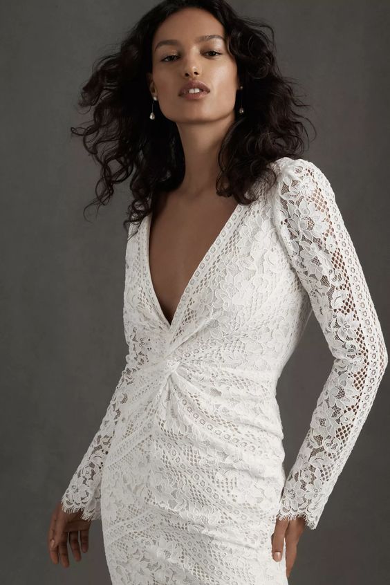 A striking silhouette, this alluring gown boasts a deep V-neckline, an intricate front twist, and dreamy long sleeves for an elegant finish. Measures 63" from top of the shoulder to hem.