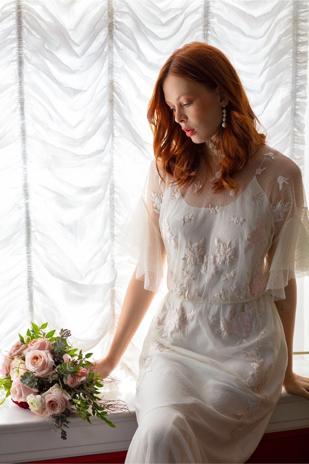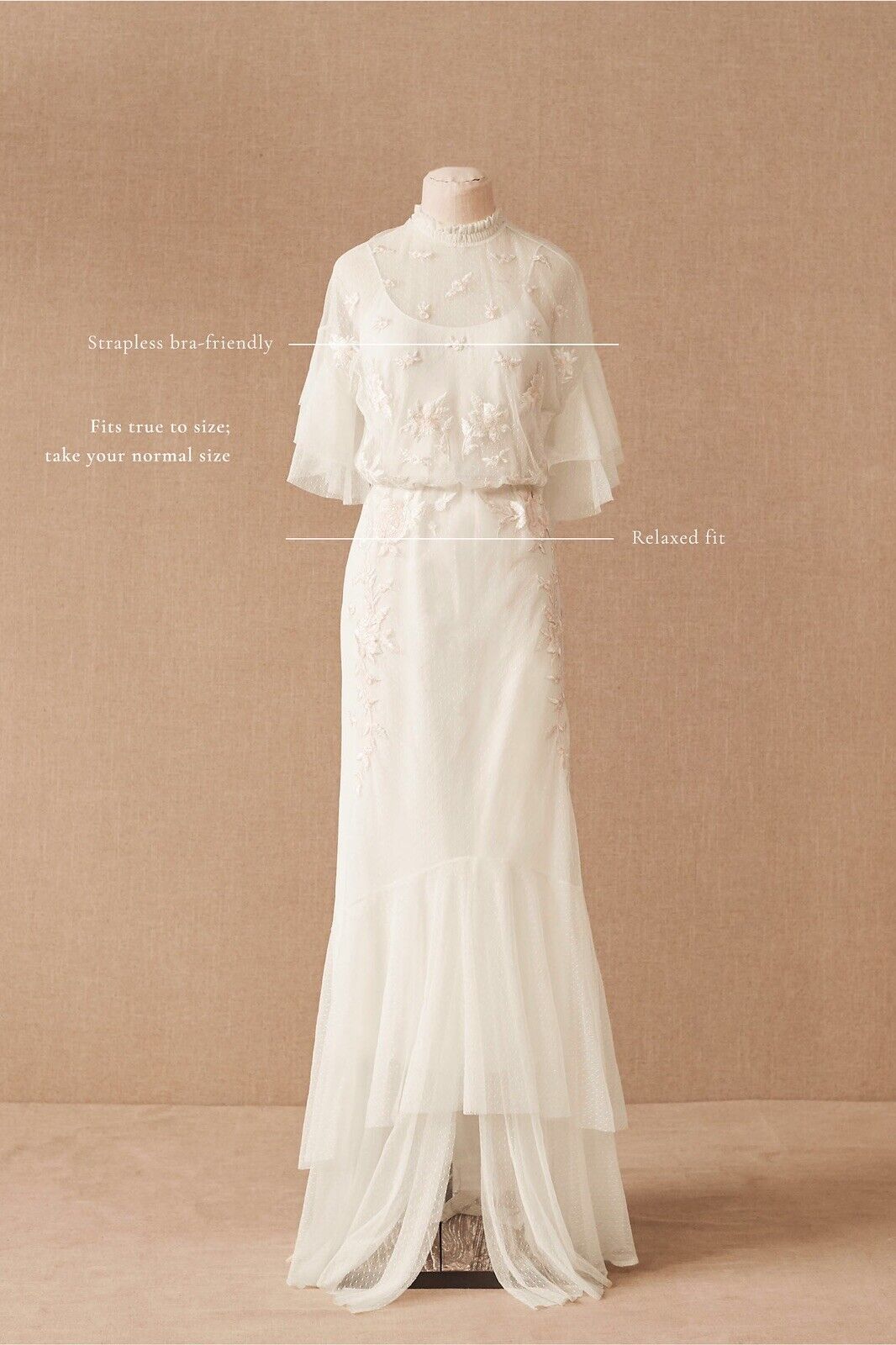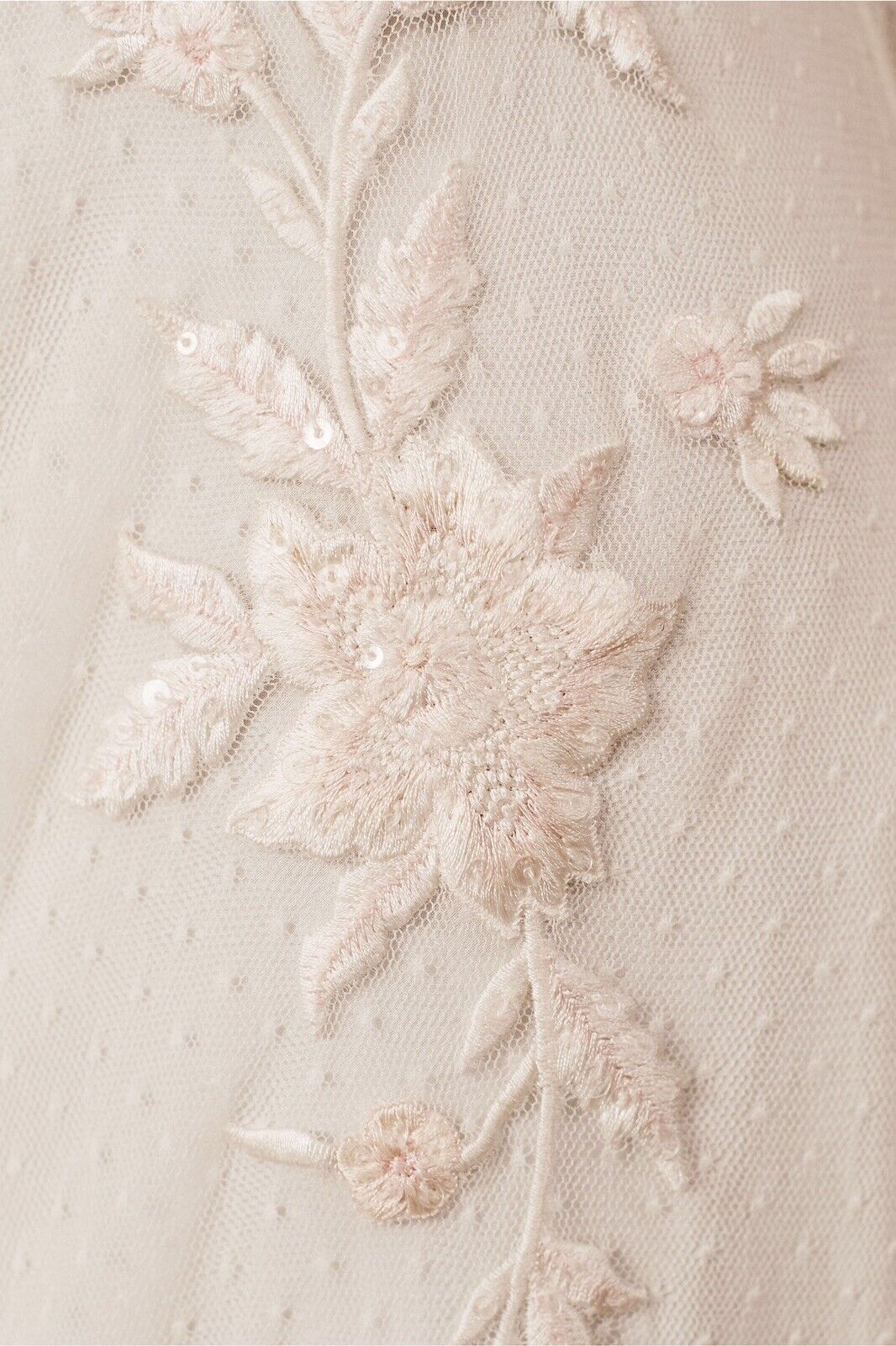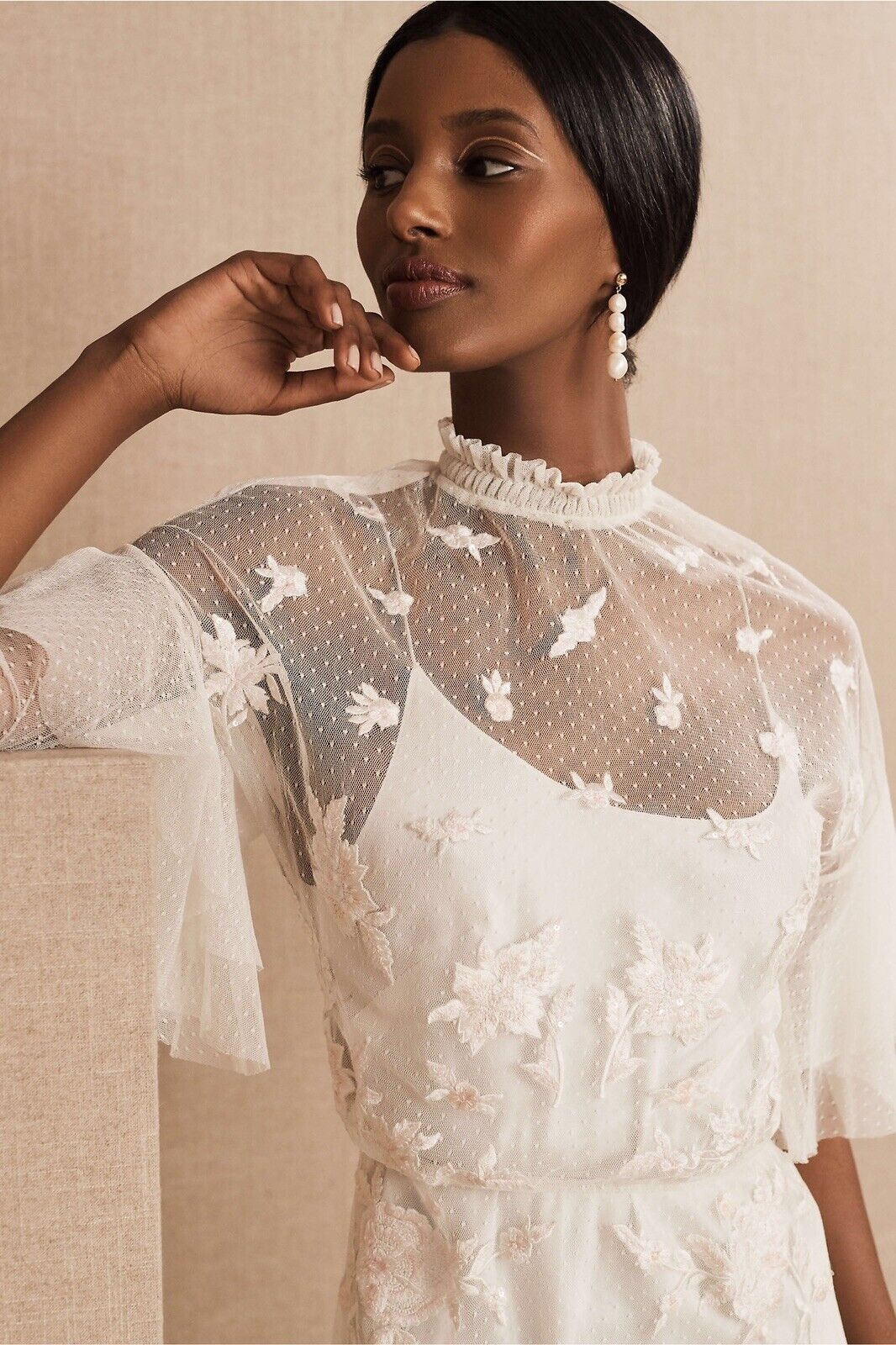 A sheer, ruffled high neck flows into layers of Swiss dot tulle on this charmingly bohemian fit-and-flare gown. Pastel embroidery whispers across the bodice and skirt for a vintage-inspired effect with fluttery sleeves adding extra movement.