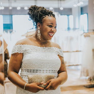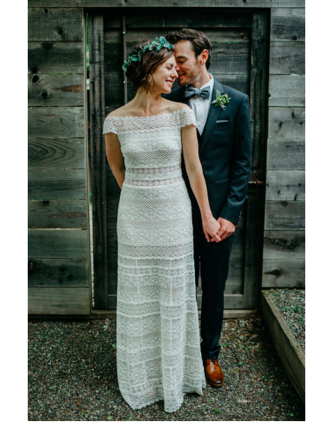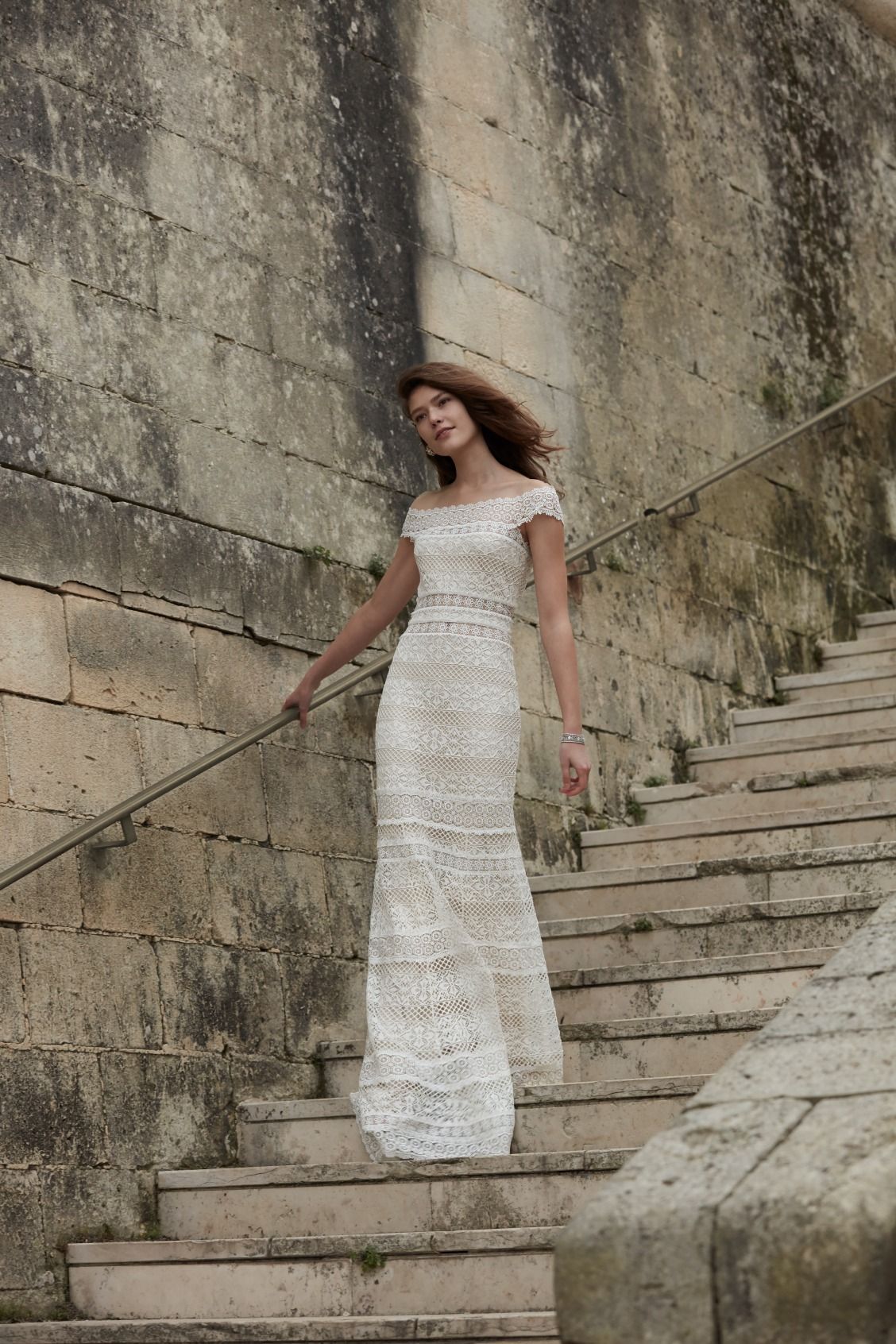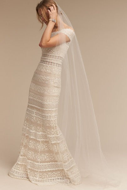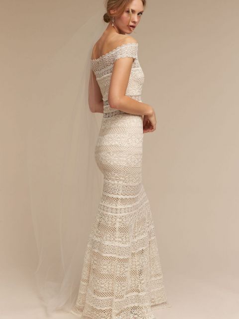 Sleek and form-fitting, this gown features a stunning mix of textured and graphic patterns. Semi-sheer cutouts trim the neckline and waist, and scalloped edges add playfulness. Illusion tulle lends extra support, keeping the off-the-shoulder sleeves perfectly in place.